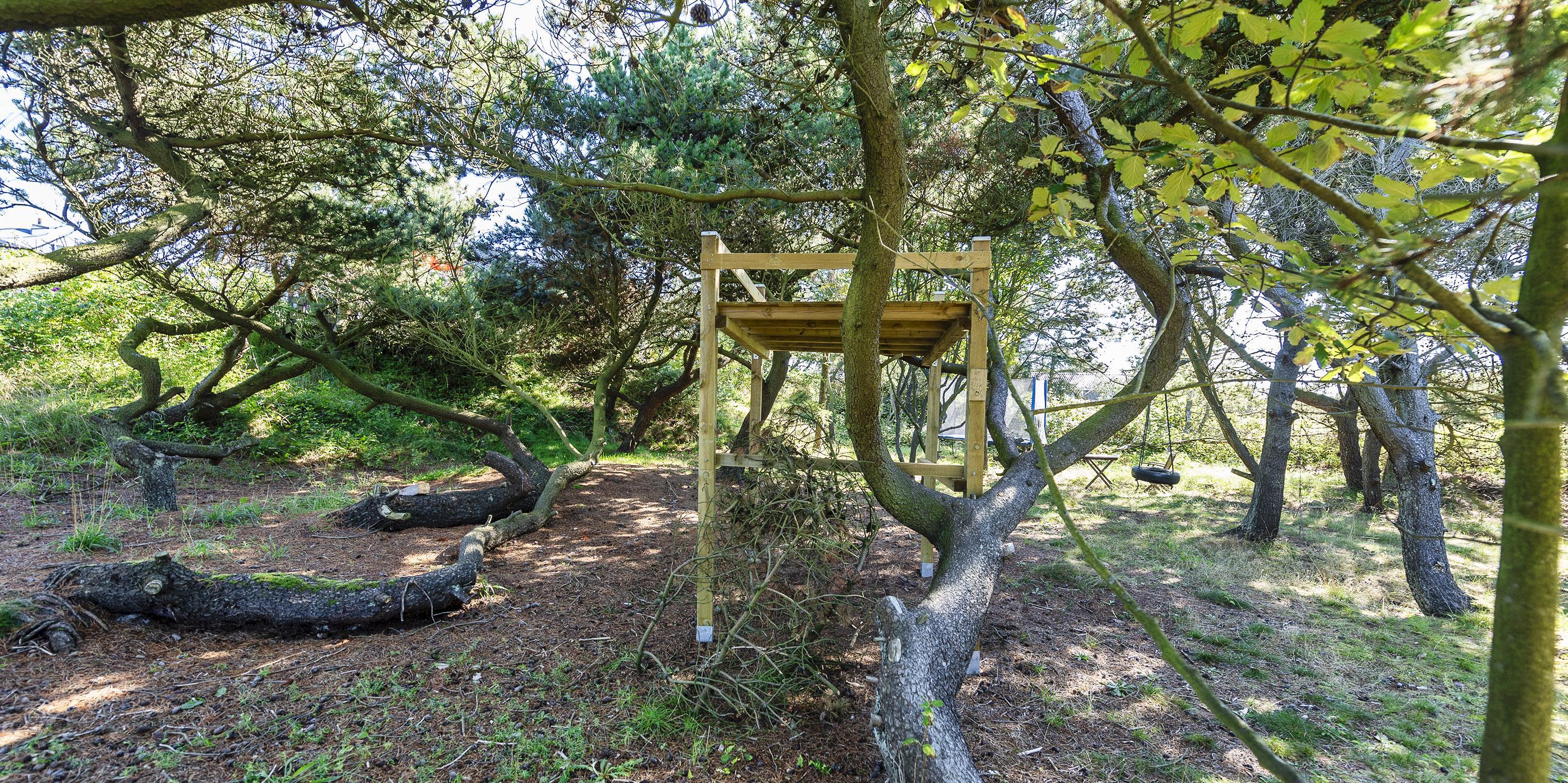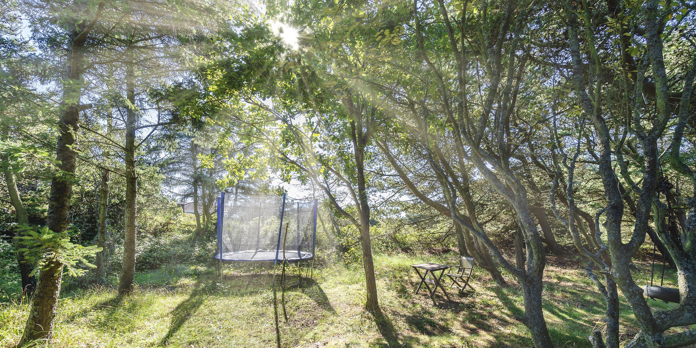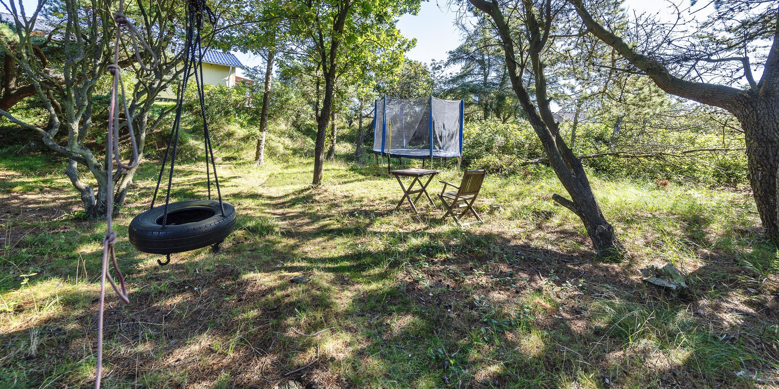 Der er en dejlig tilhørende grund, hvoraf noget af grunden er med fyrtræer med mange hyggelige legekroge til børnene. Huset råder over flere udlagte træterrasser hvor dagen kan nydes i sol eller skygge. Huset ligger 5 min. fra klitterne der bringer jer ned til Vejers Sydstrand.