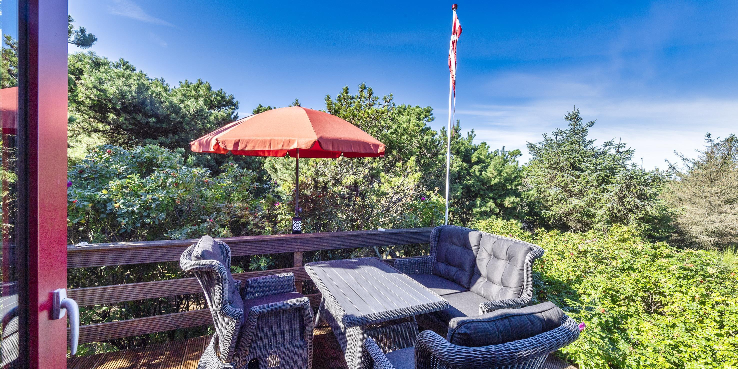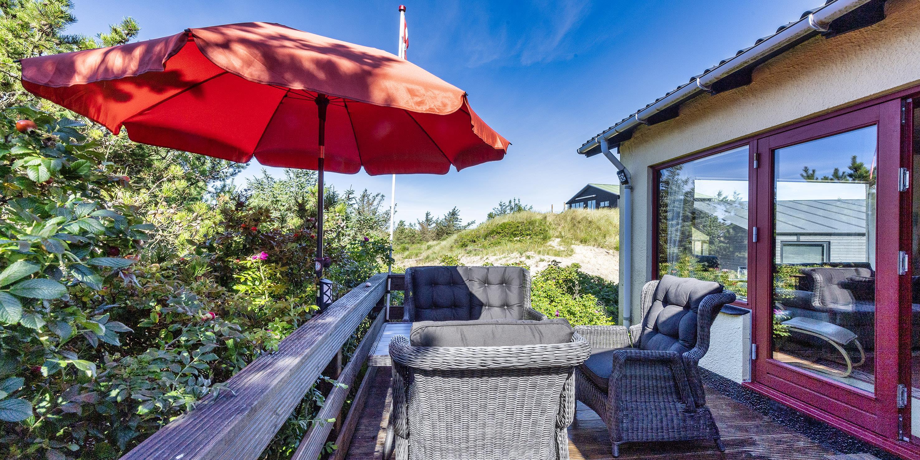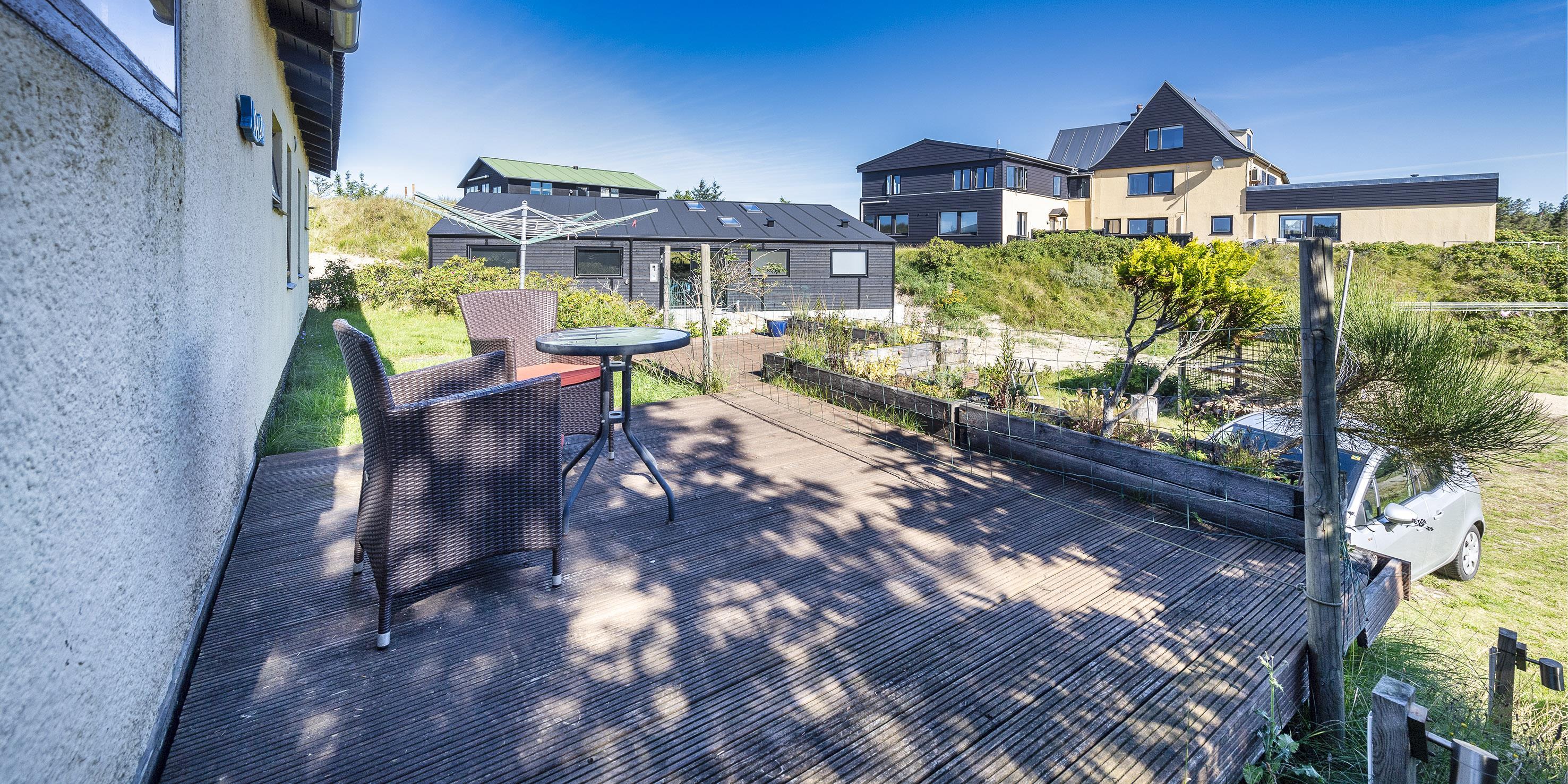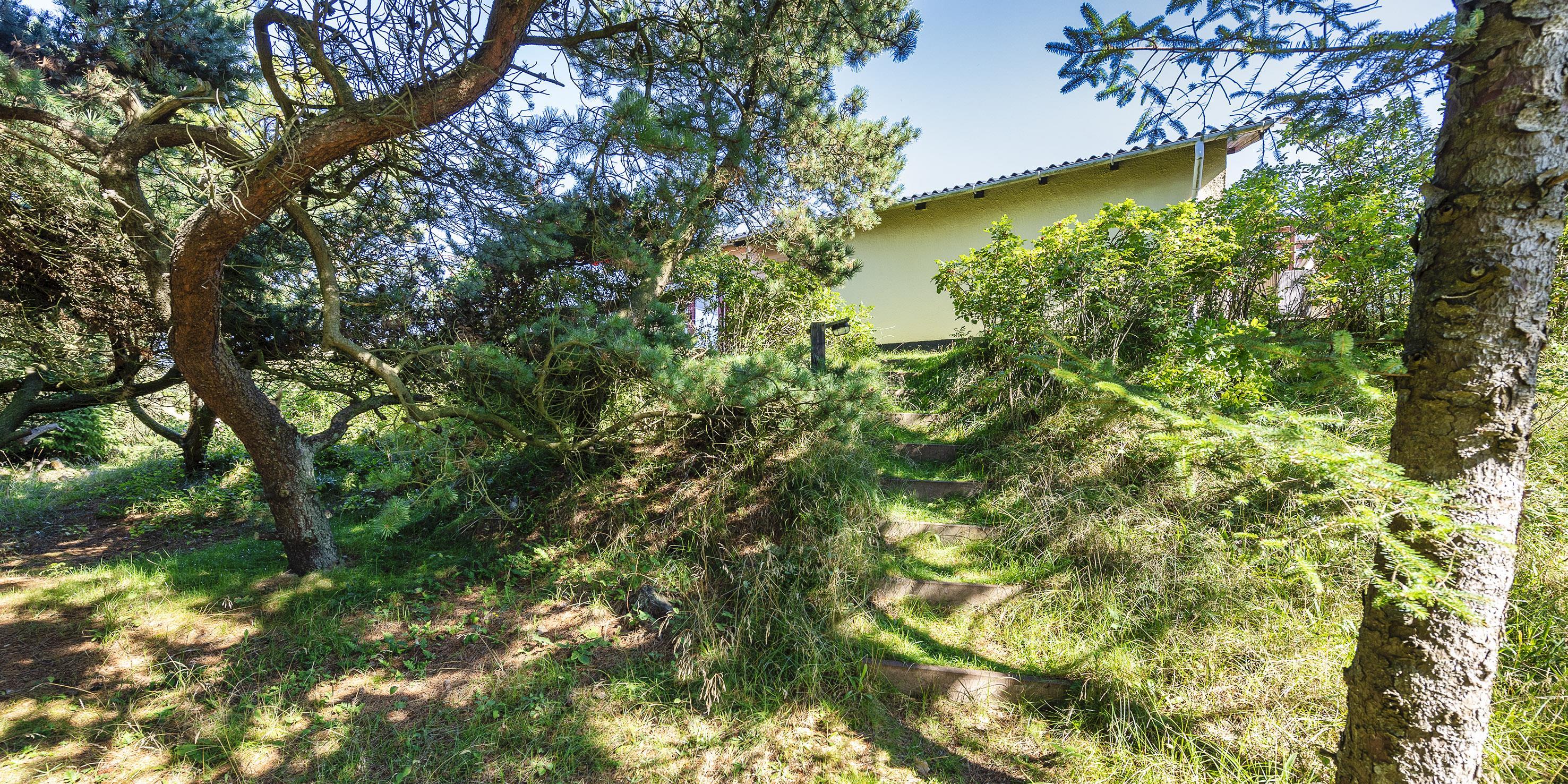Der er en dejlig tilhørende grund, hvoraf noget af grunden er med fyrtræer med mange hyggelige legekroge til børnene. Huset råder over flere udlagte træterrasser hvor dagen kan nydes i sol eller skygge. Huset ligger 5 min. fra klitterne der bringer jer ned til Vejers Sydstrand.