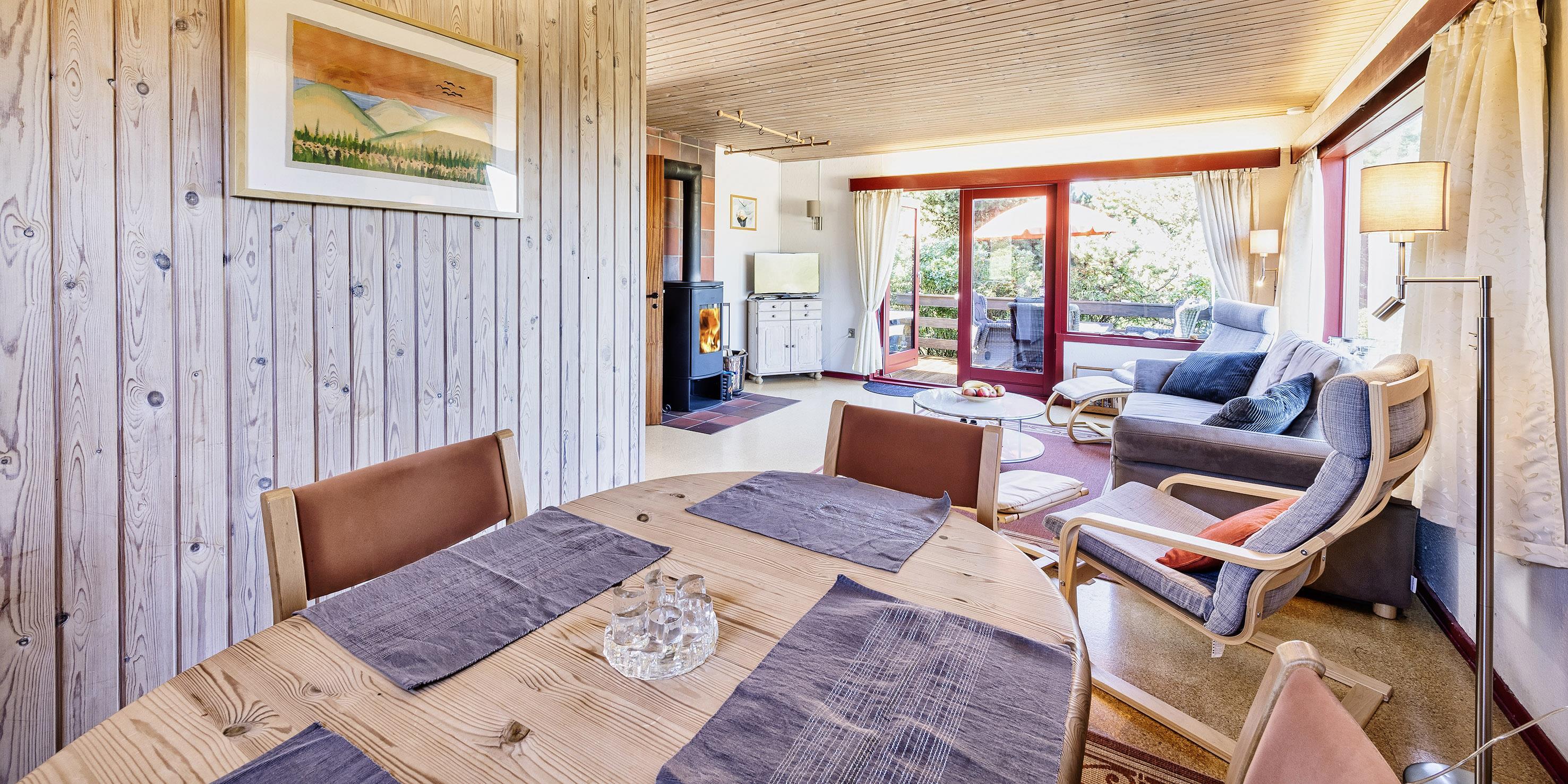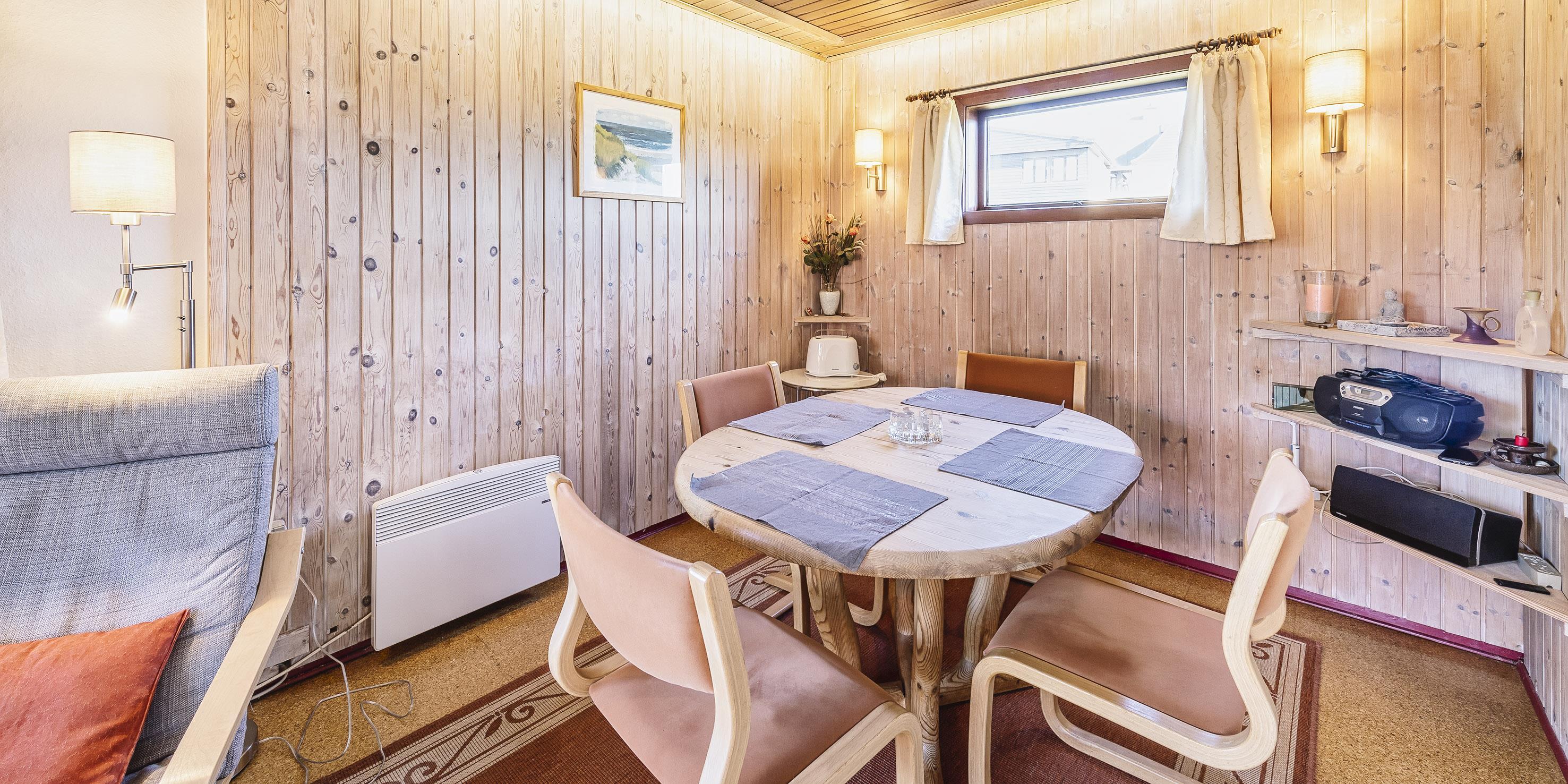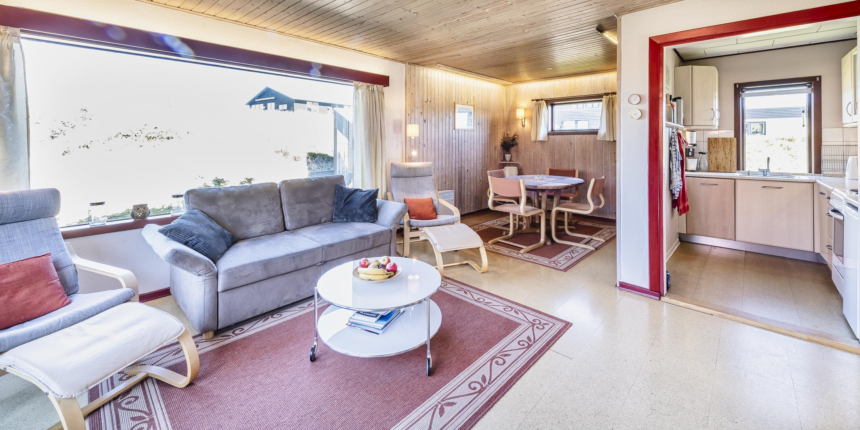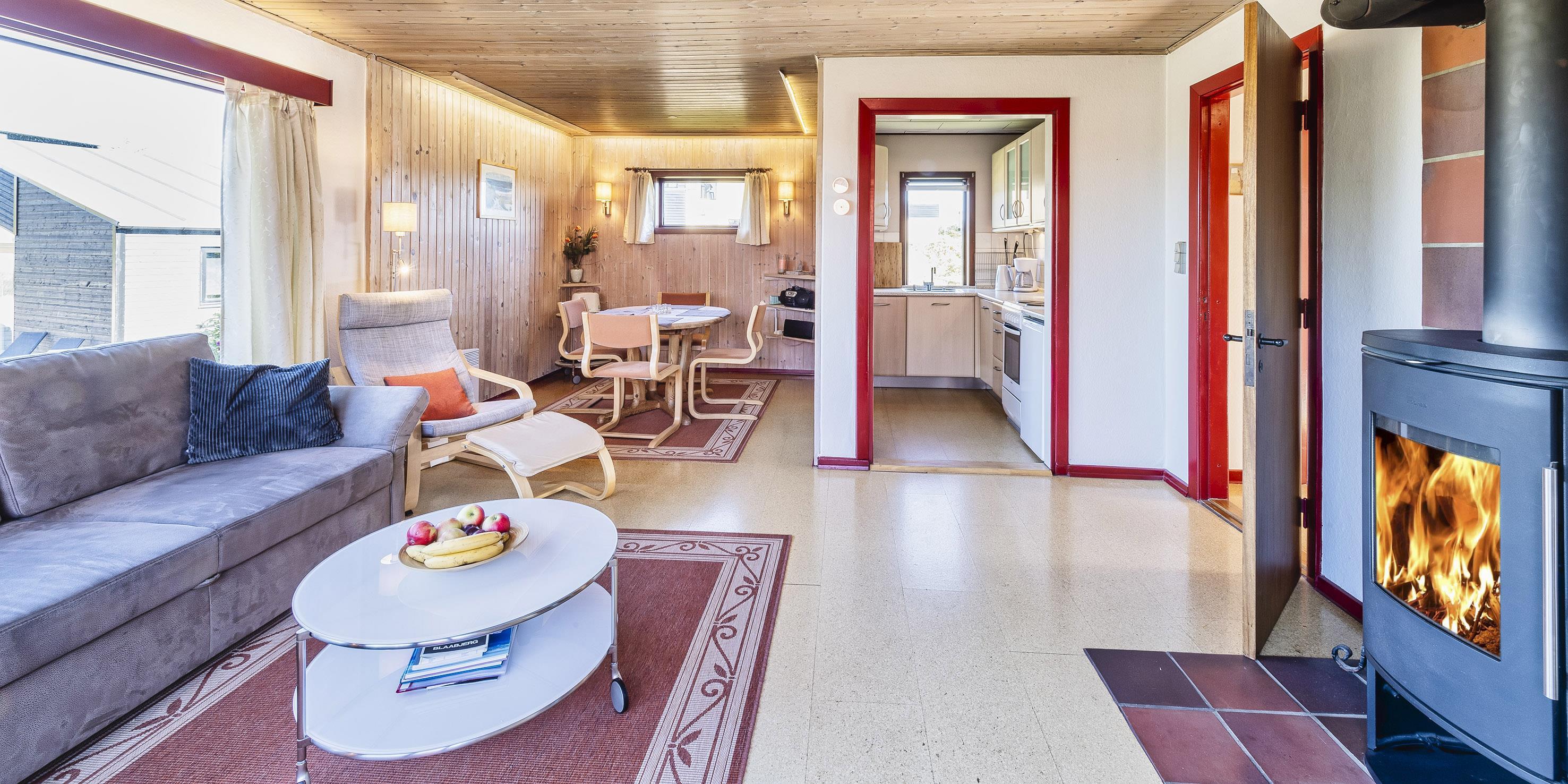 Huset stue er med brændeovn, TV med parabolmodtager (plus danske kanaler). Der er panoramavinduer mod syd og vest hvorfra der er et godt lys indfald, gulvene er med laminatbelægning, der er en mindre spisekrog med rundt spisebord med plads til 4 personer. Fra stuen er der udgang til dejlig træterrasse med gode havemøbler. Fra stuen er der adgang indtil køkkenet der fremstår med et komfur med kogeplade og alm. ovn og integreret opvaskemaskine og et køleskab med en lille fryser. Der er tilladt med en lille hund (max 40 cm)