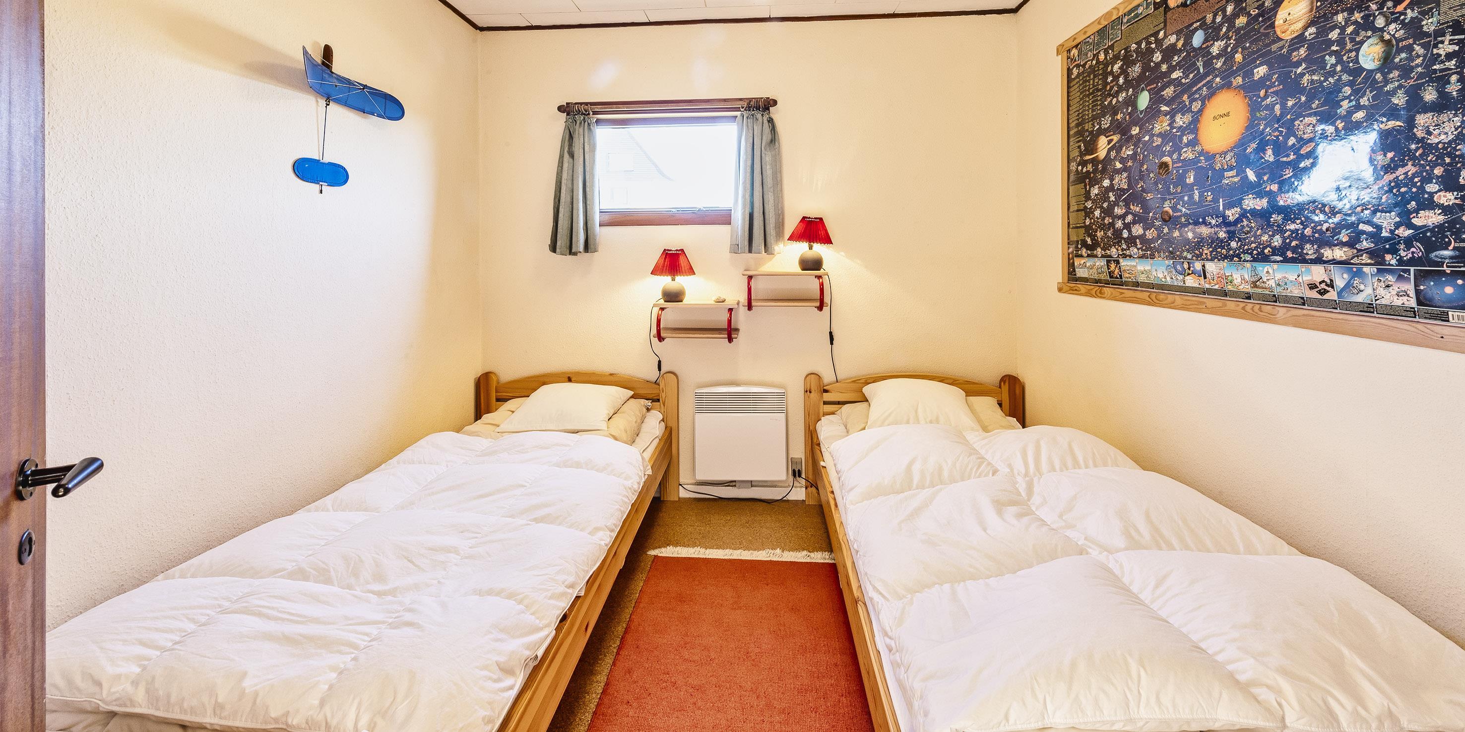 2 soveværelser. 1 med dobbeltseng 180x200 cm. 1 med 2 enkeltsenge (á 90x200 cm)