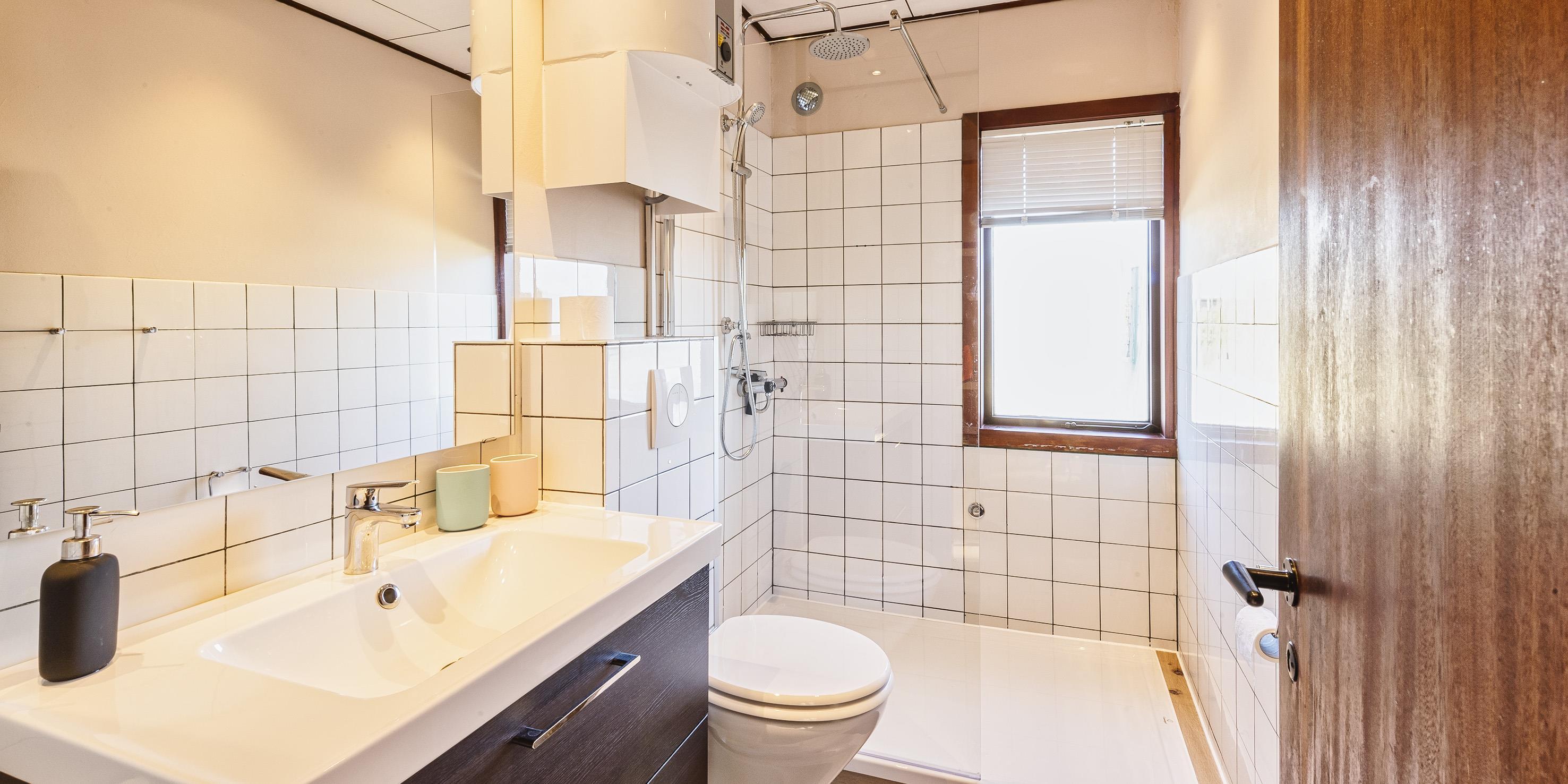 Bad med toilet, bruser og vask