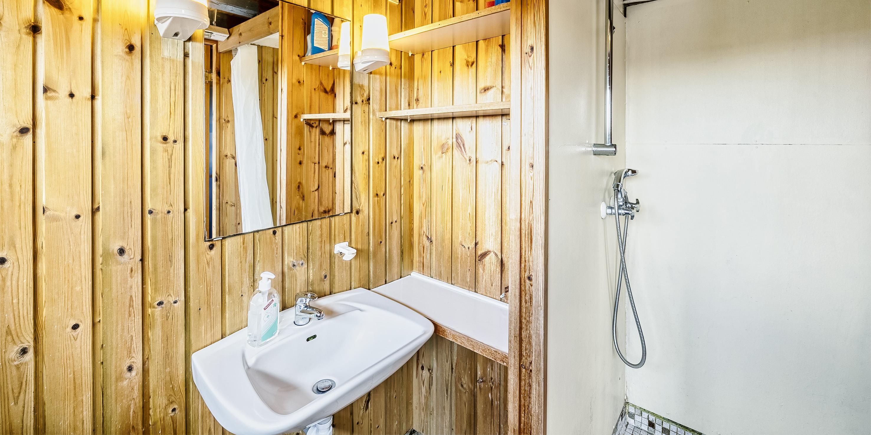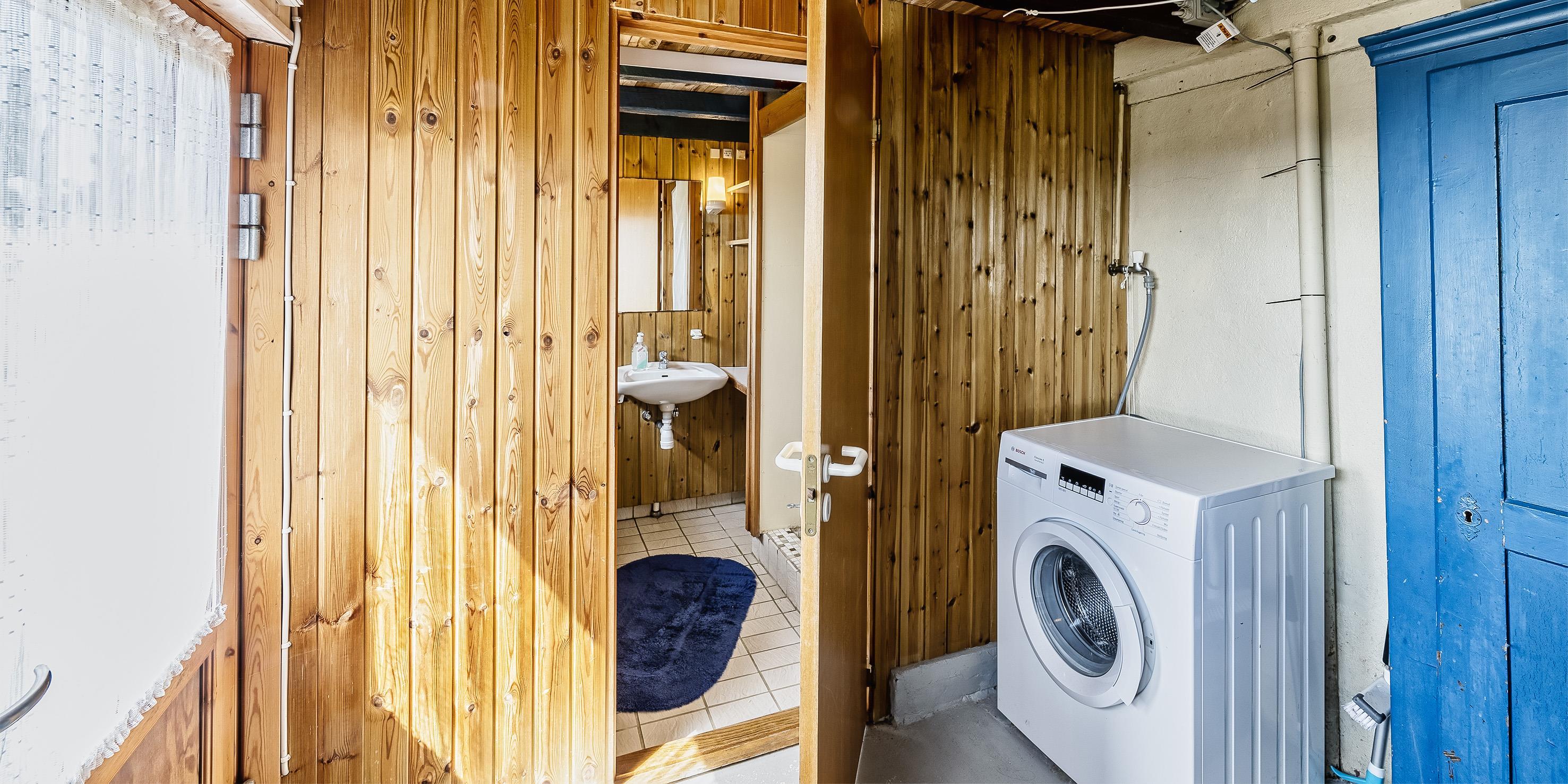 Badeværelse med bruser/wc i kælderen. Vaskemaskine.