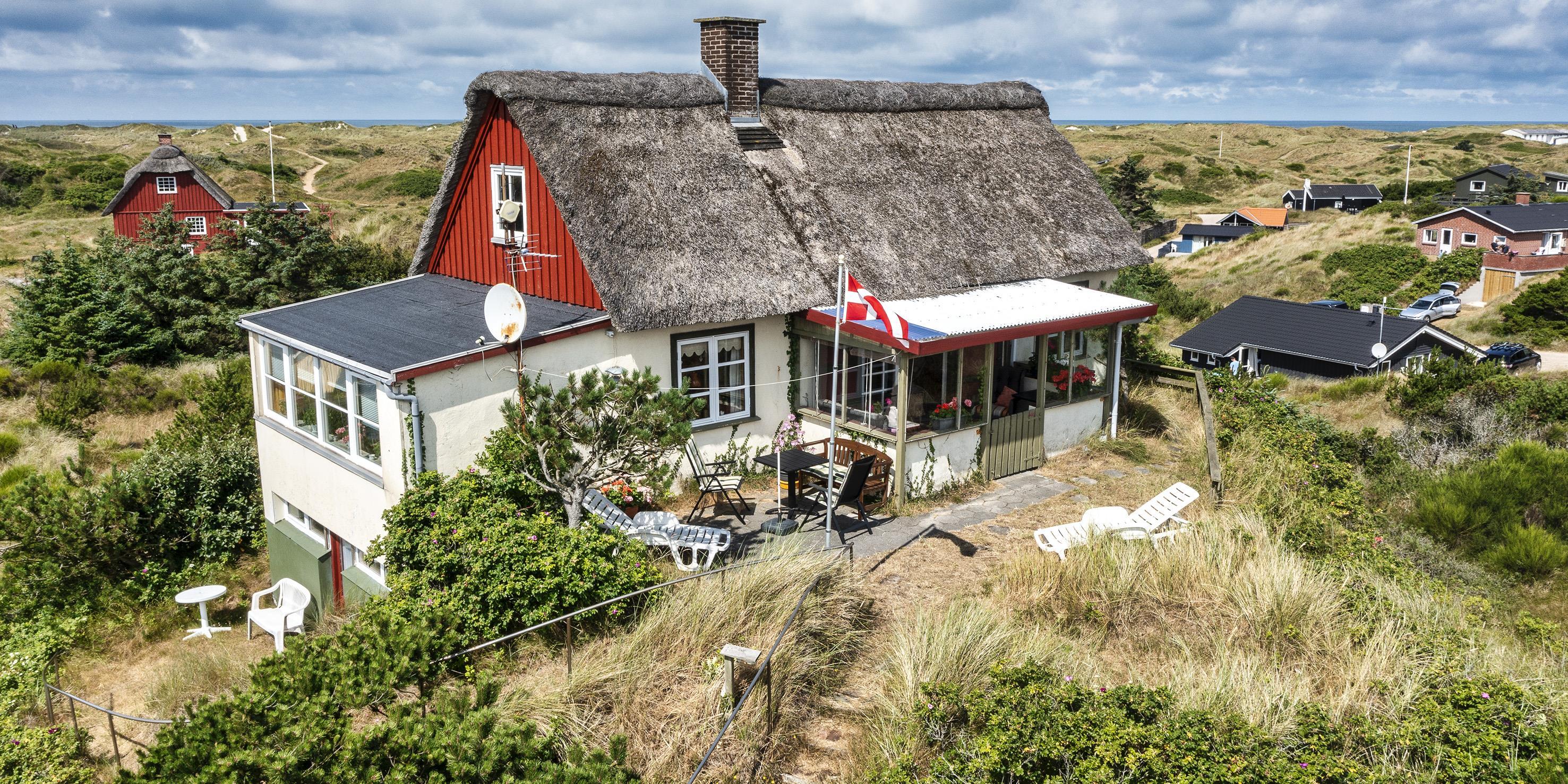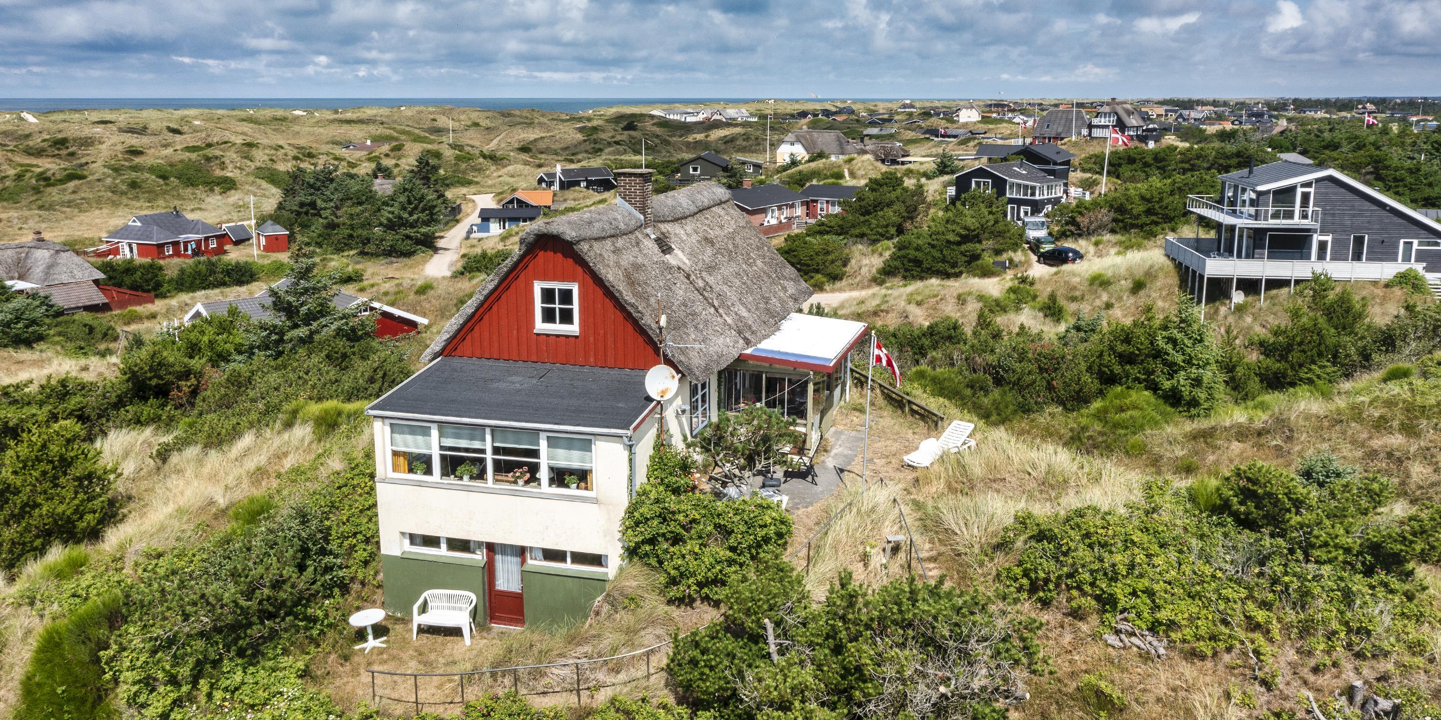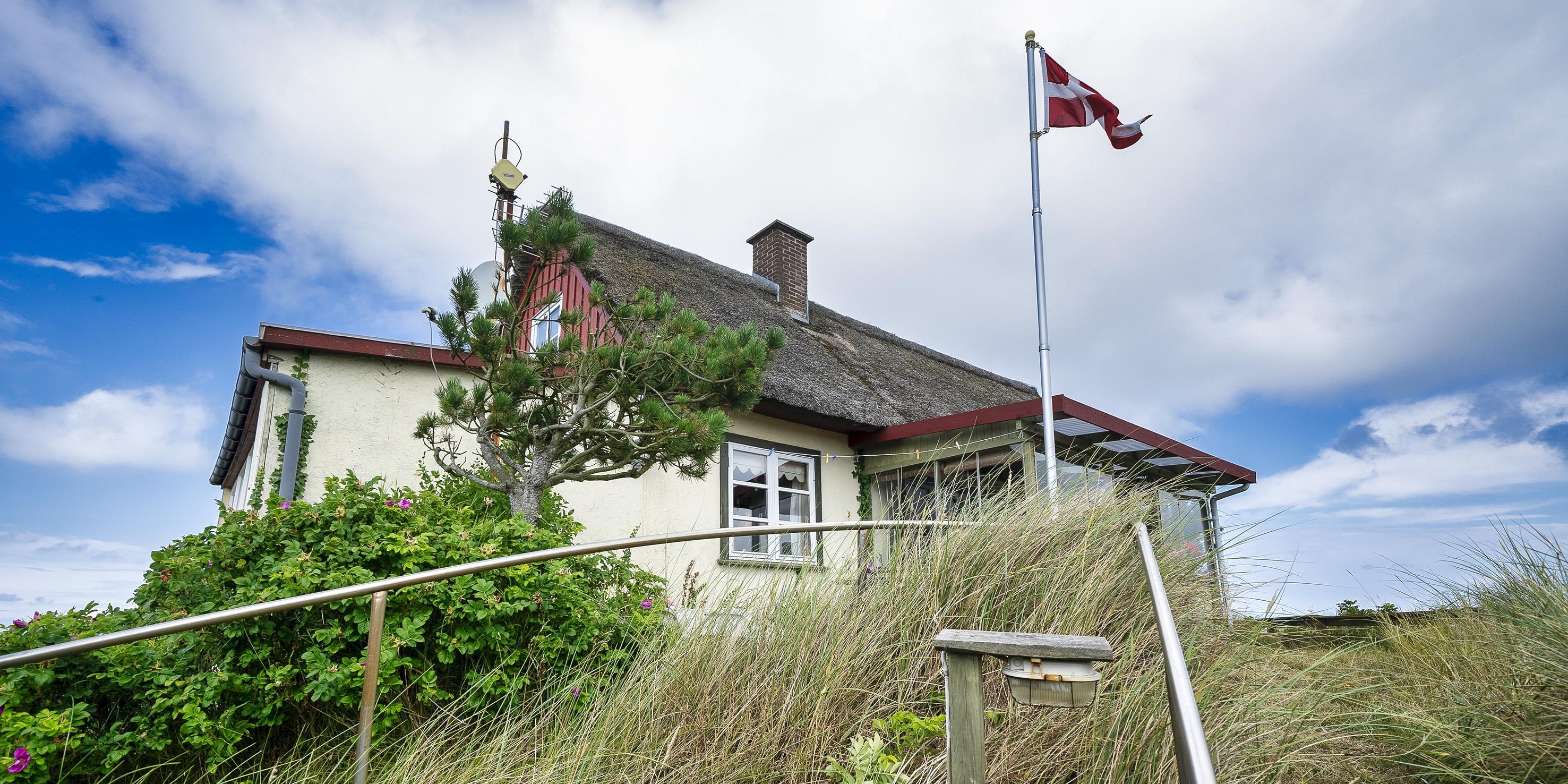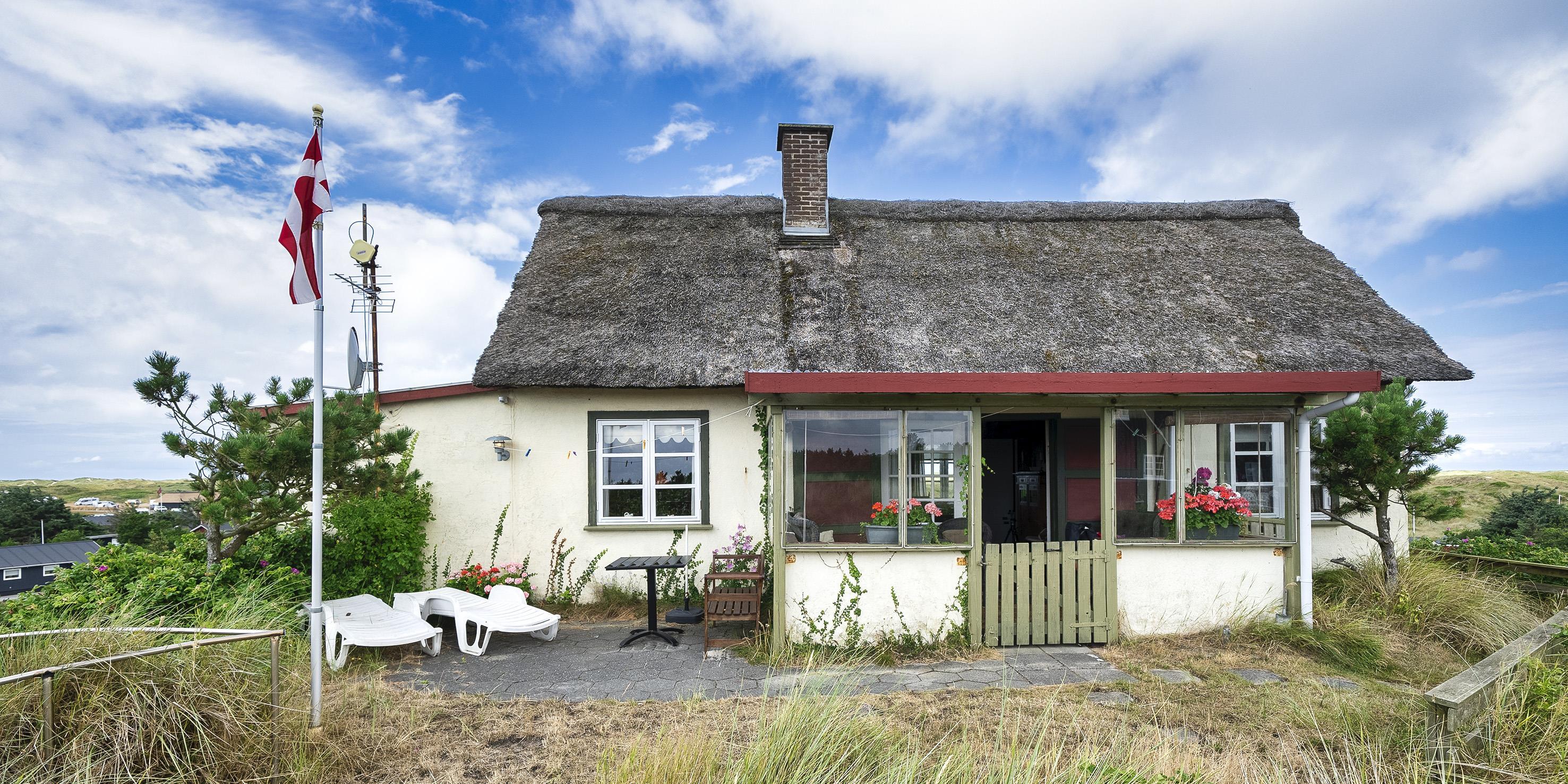 Nostalgisk sommerhus fordelt på 2 etager til 4 personer og en hund, beliggende på klitgrund med panoramaudsigt over havet, ca. 200 meter fra stranden.