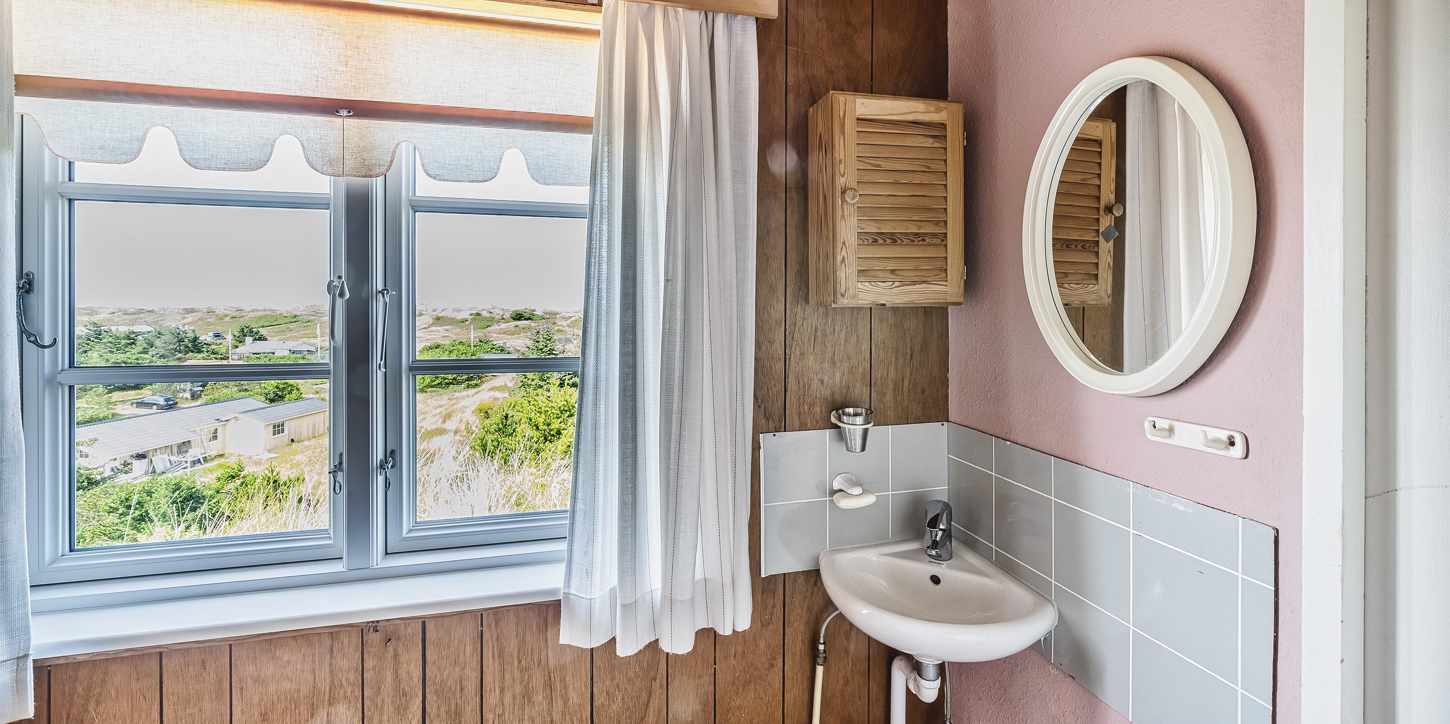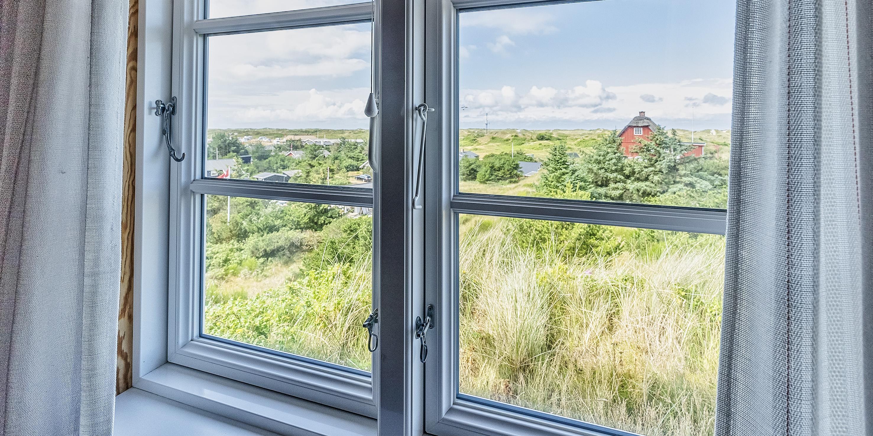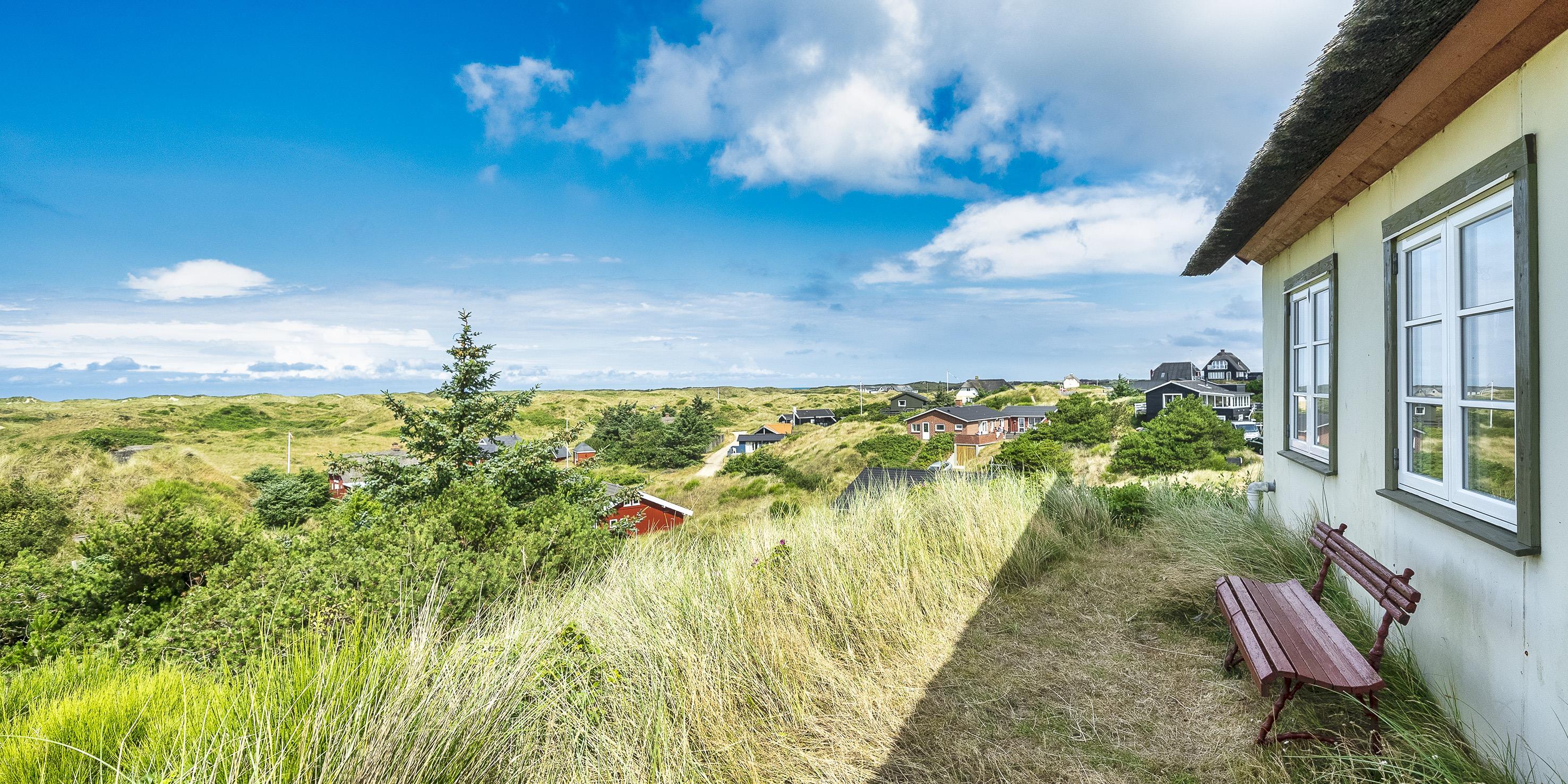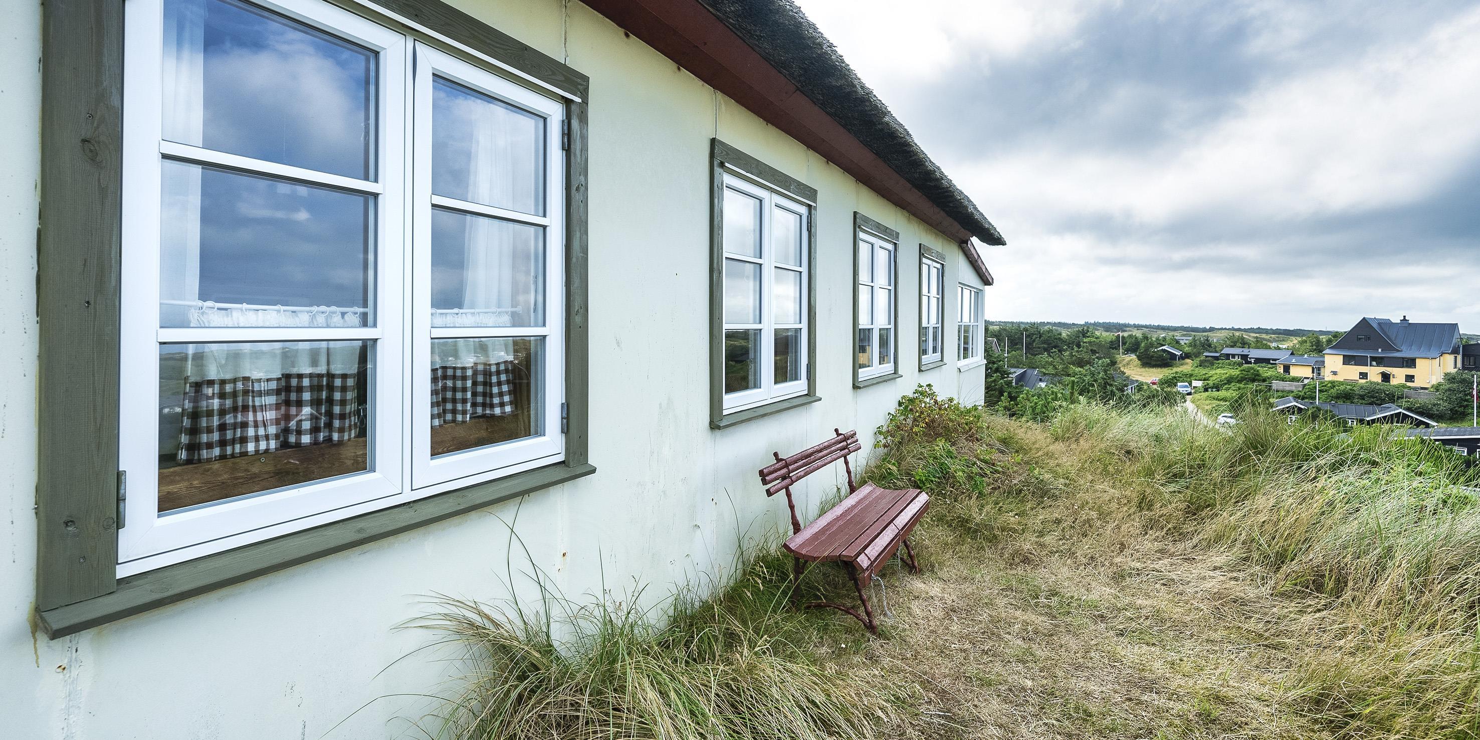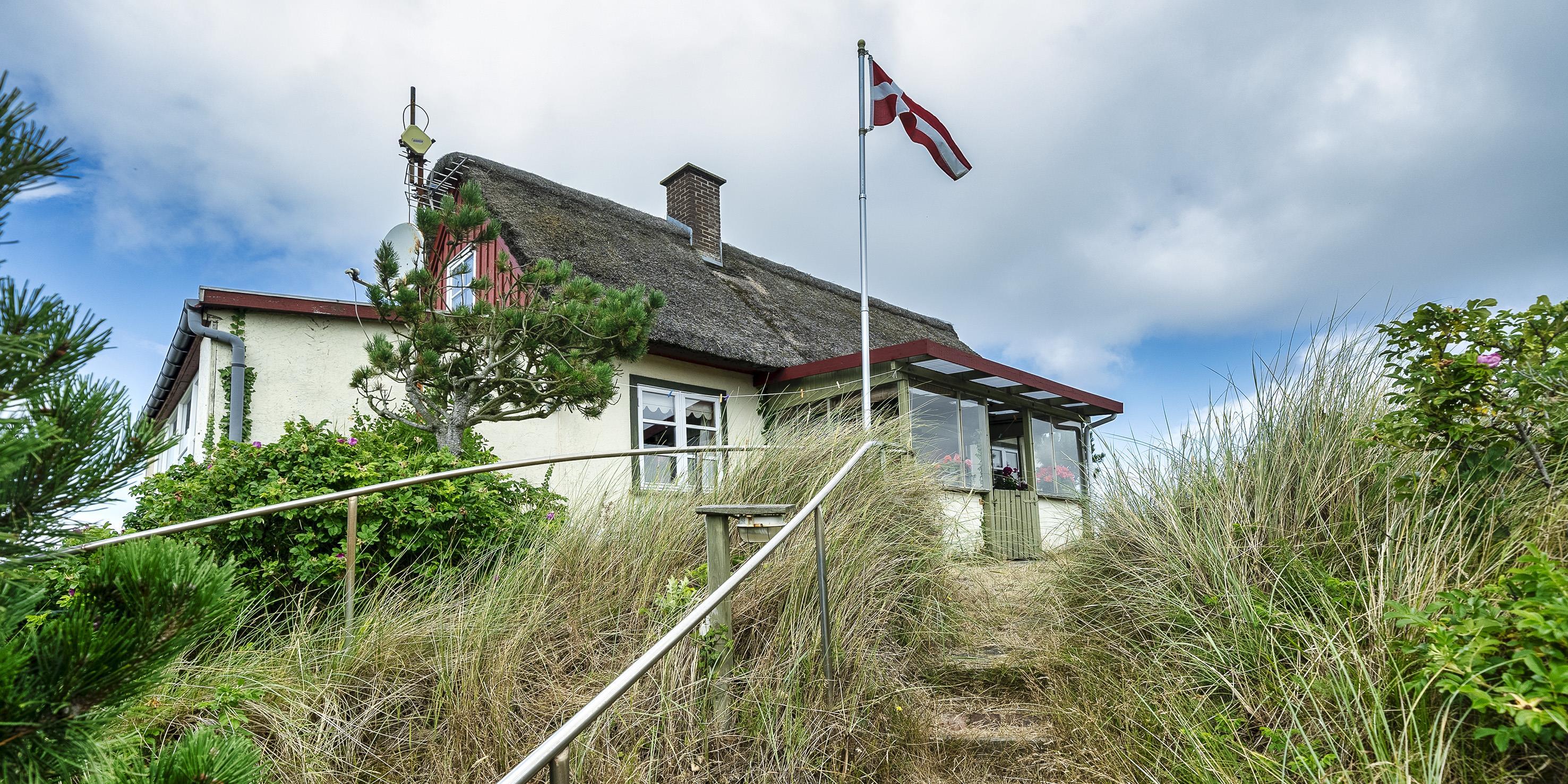 Nostalgisk sommerhus fordelt på 2 etager til 4 personer og en hund, beliggende på klitgrund med panoramaudsigt over havet, ca. 200 meter fra stranden.