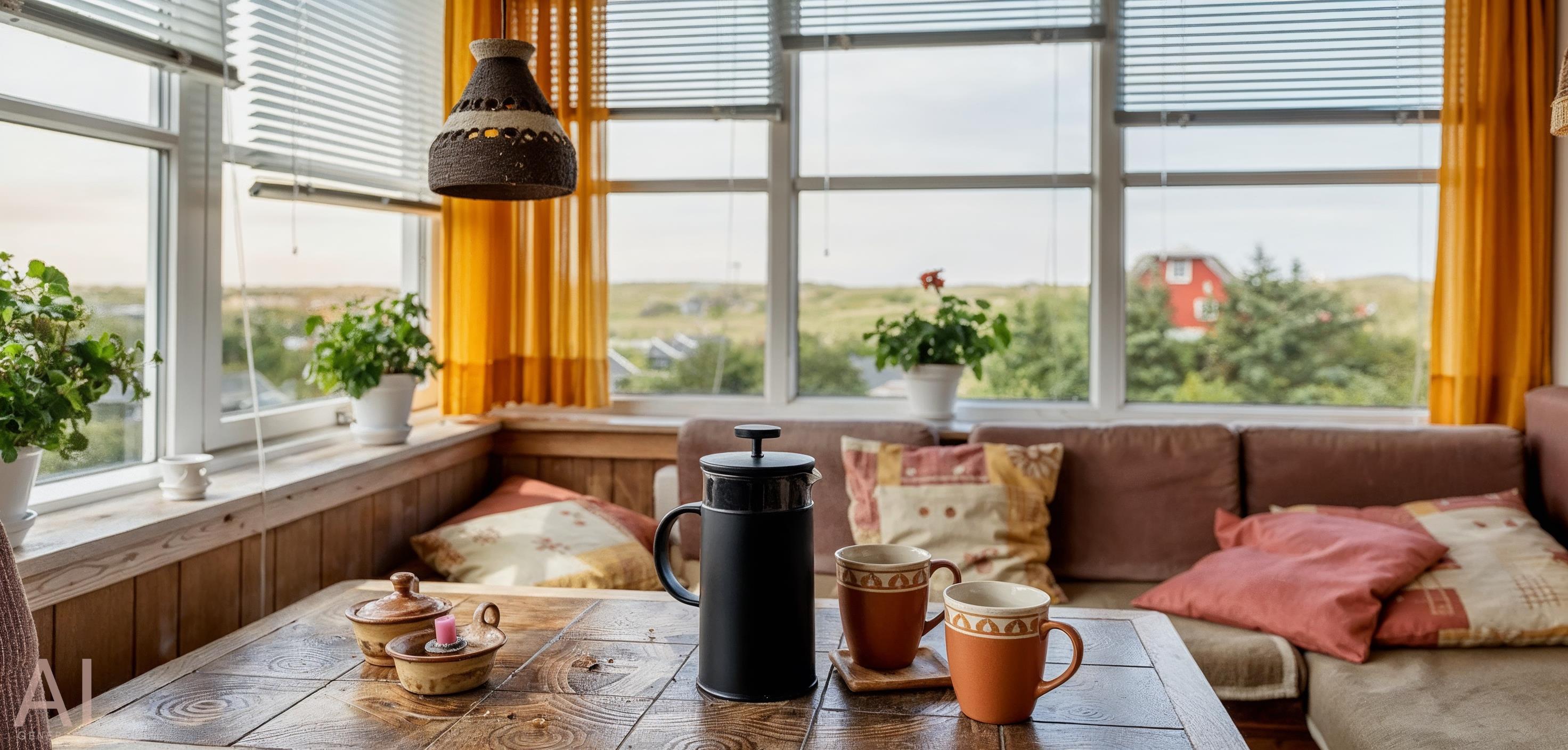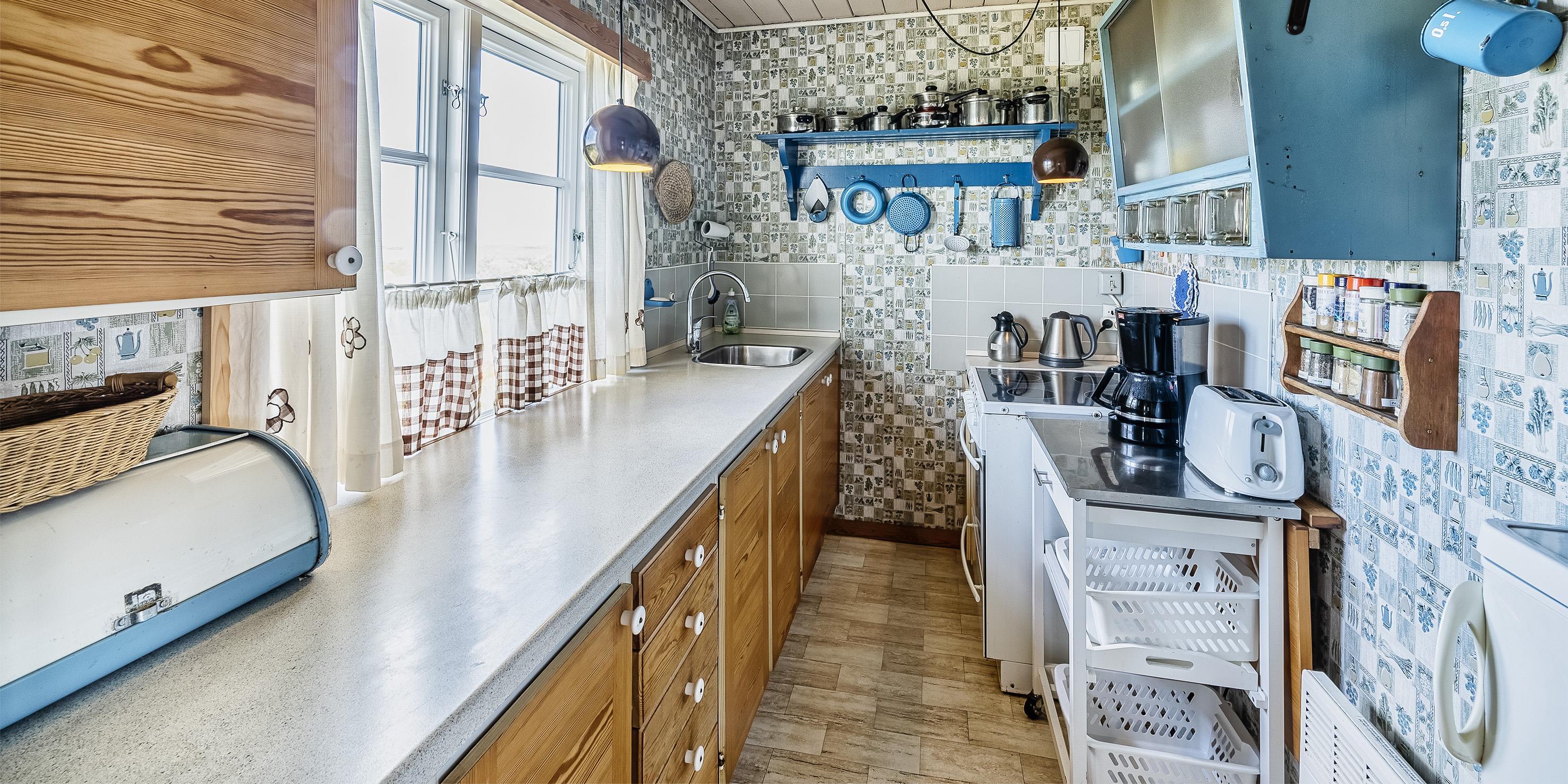 Køkken med køle-/fryseskab med flot udsigt over klitterne til havet.
