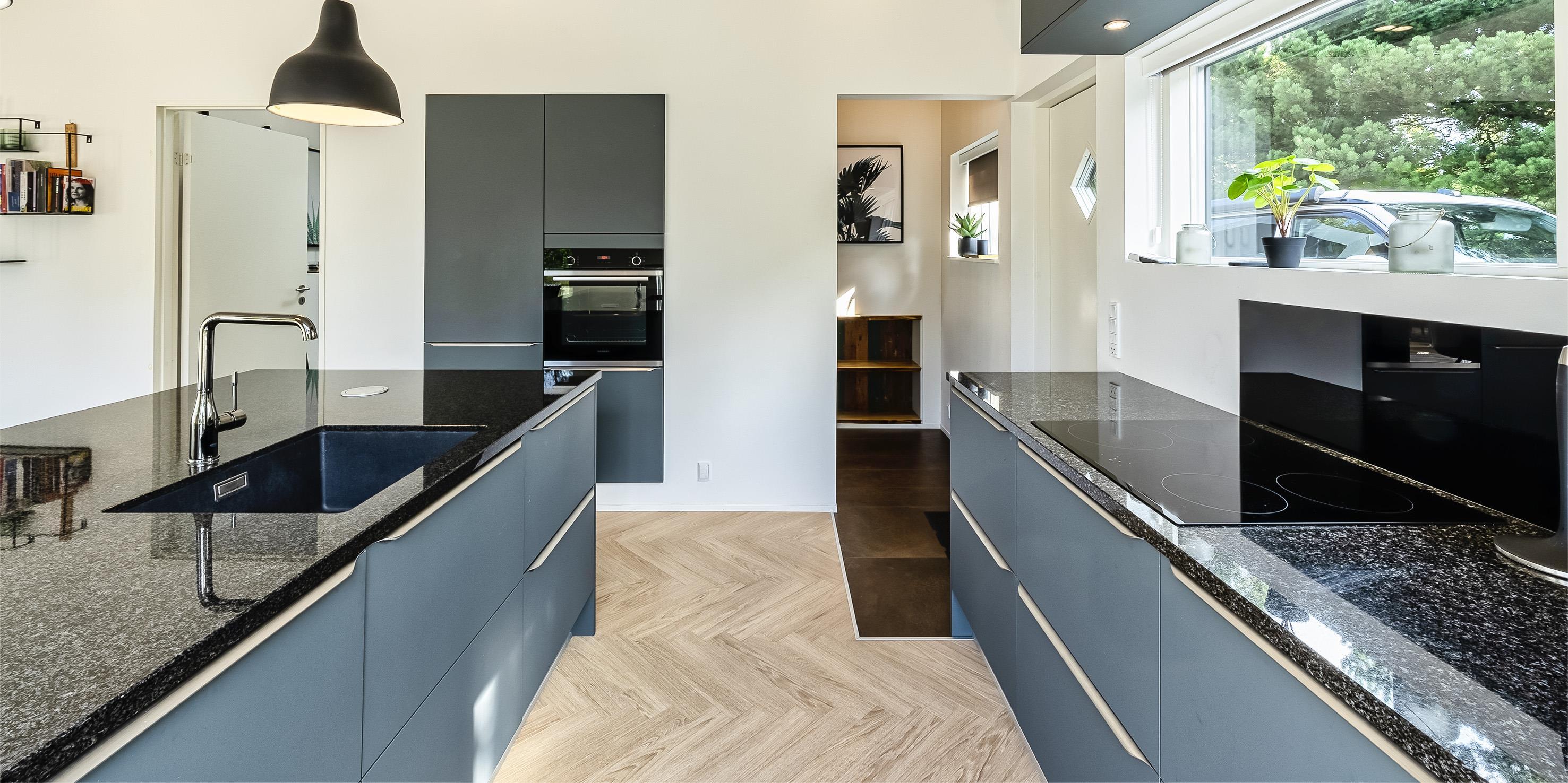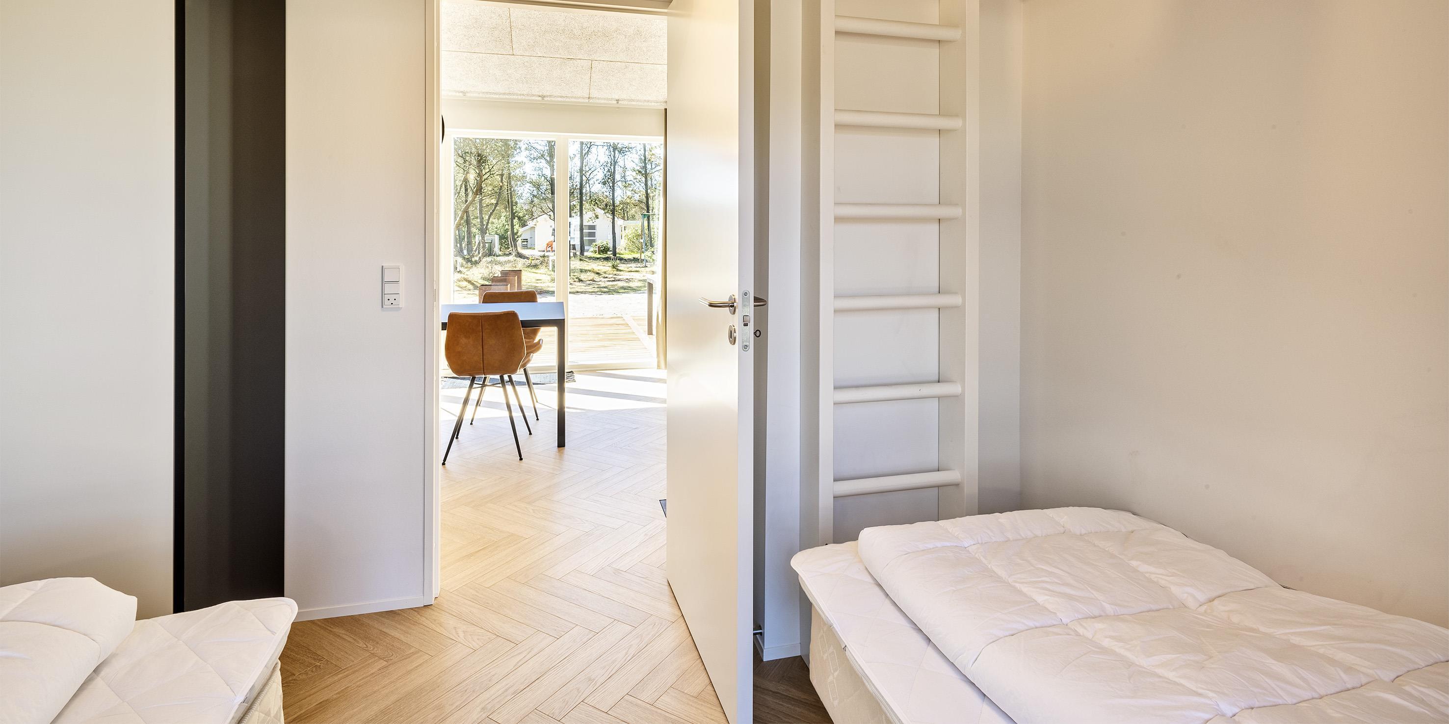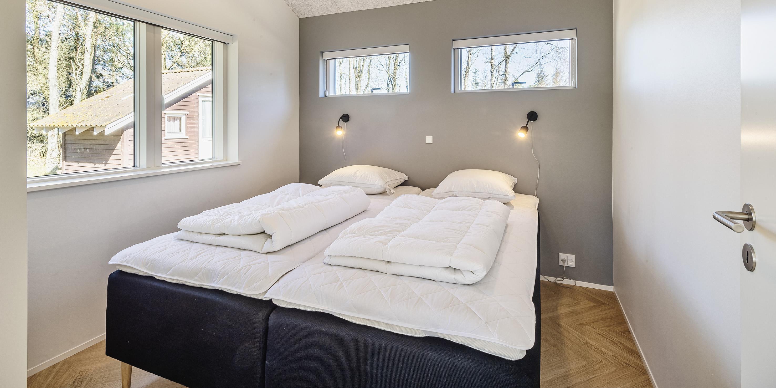2 soveværelser. 1 med dobbeltseng 180x200 cm. 1 med 2 enkeltsenge (á 90x200 cm) og 1 smal dobbeltseng.