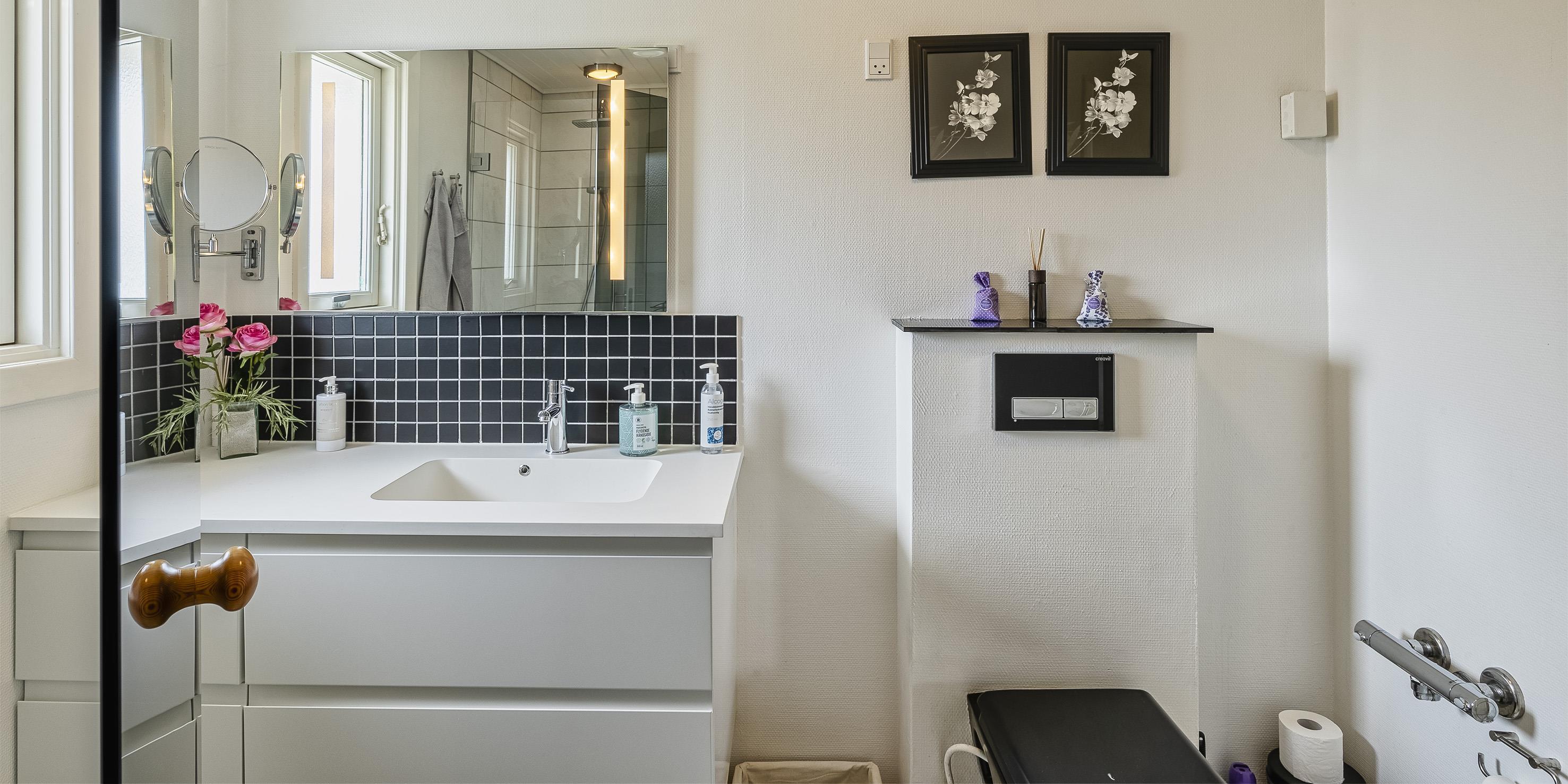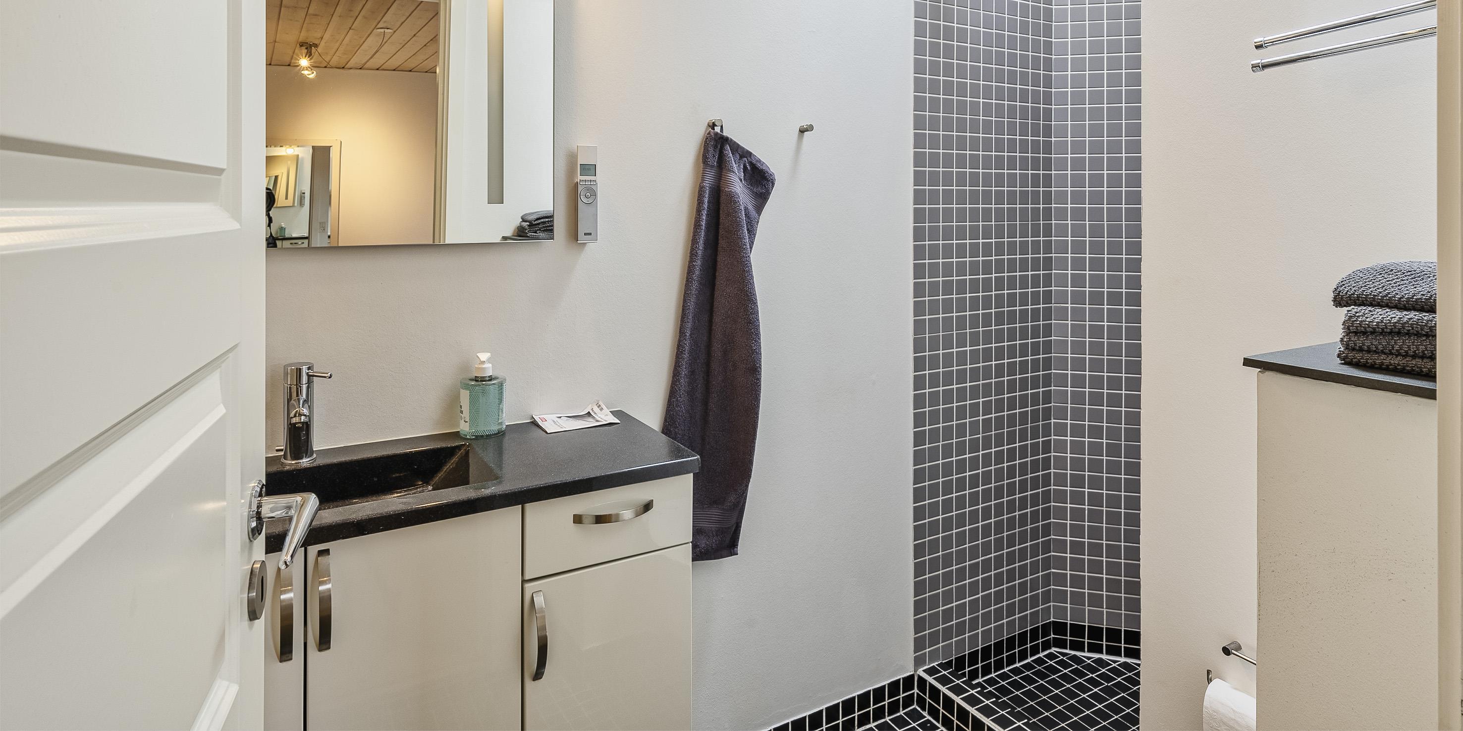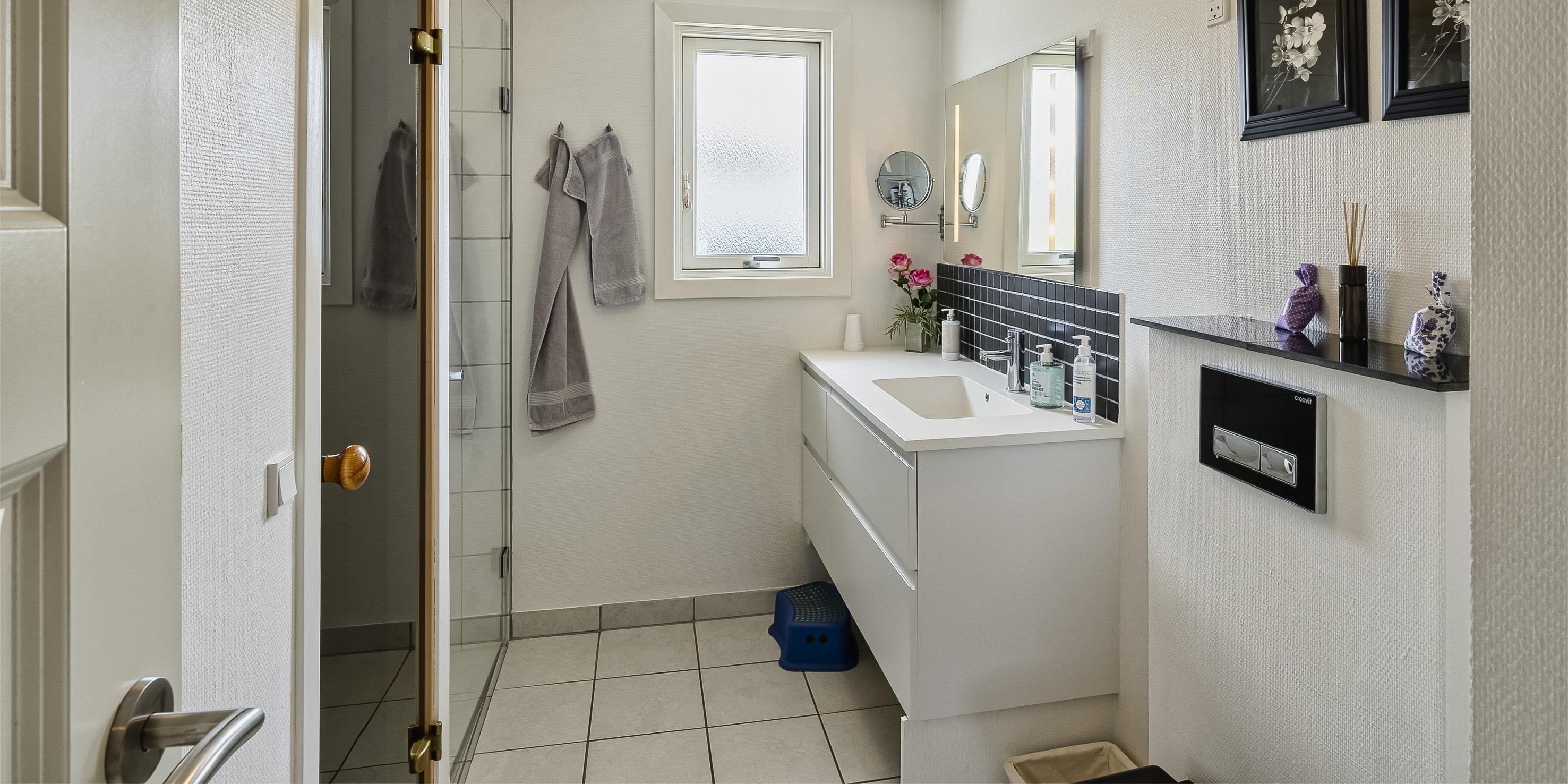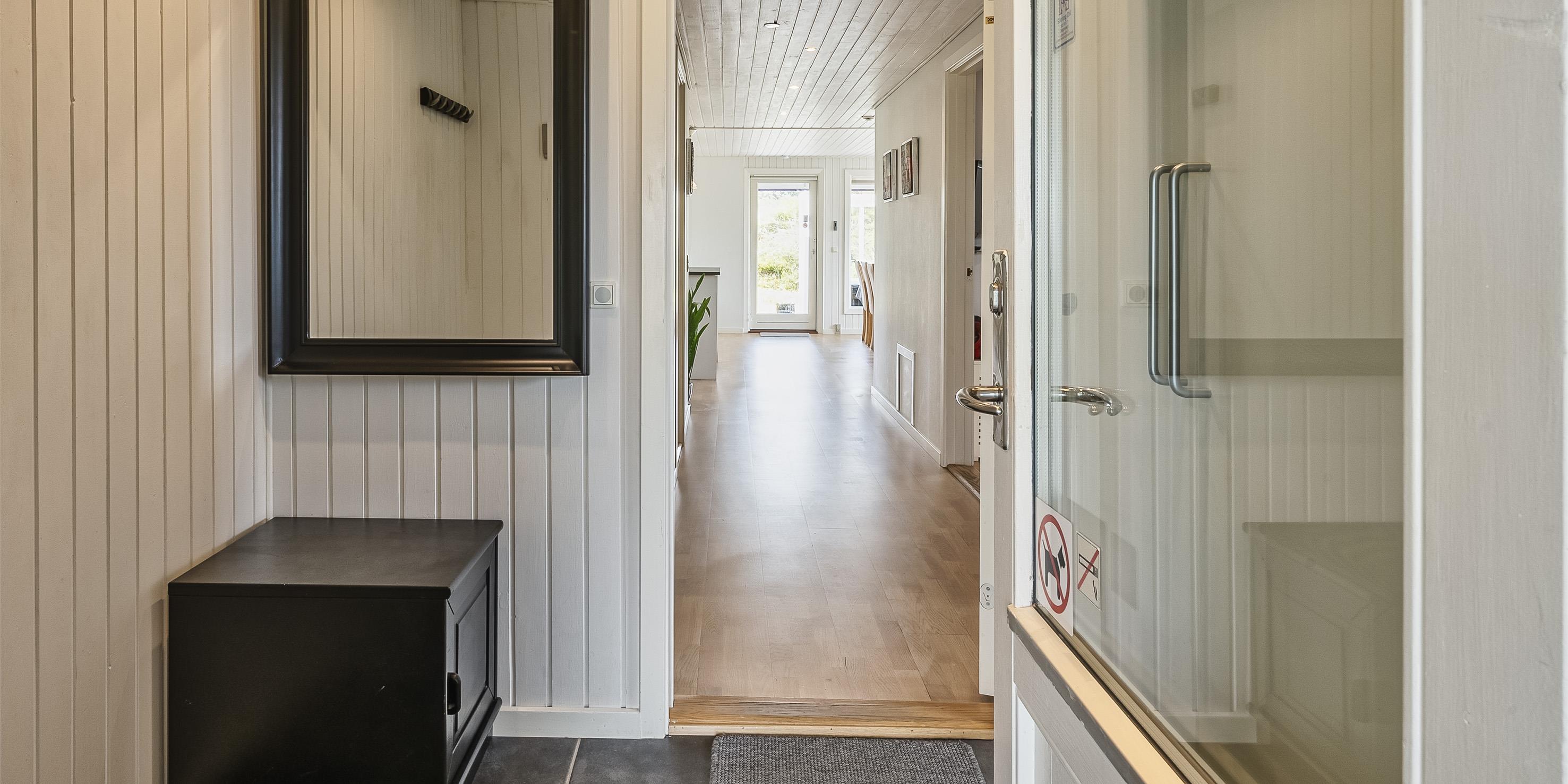 Sommerhuset: Entre med plads til garderoben i forbindelse med garagen. Huset råder over 2 dejlige badeværelser med gulvvarme. Det ene badeværelse har vaskemaskine og tørretumbler. Stort køkkenalrum med god spiseplads. Rummet er lyst og dejligt med gode vinduespartier og udgang til terrassen. Køkkenet fremstår med alt komfort såsom opvaskemaskine, kogeplade, emhætte, køleskab, mikrobølgeovn og fryser. Dejlig opholdsstue med brændeovn, fjernsyn, trådløs internetadgang og udgang til terrassen. Huset har i alt 5 soverum: DS + DS + DS + DS + DS. 3 soveværelser med hver 1 dobbeltseng og 2 soveværelser med hver 1 ¾ dobbeltseng. Dejlig terrasse-miljø med havemøbler og gasgrill. På terrasserne kan dagene nydes fra Morgen til aften. Garage til mindre bil (4,3 meter).
