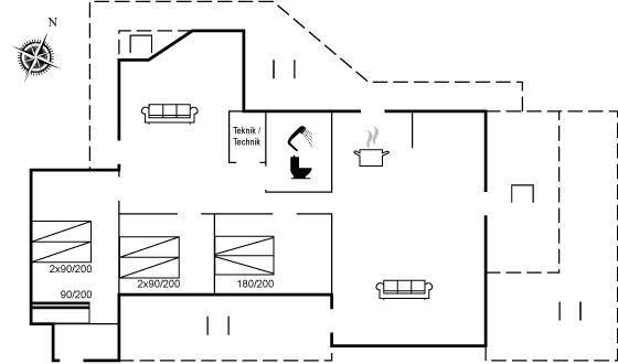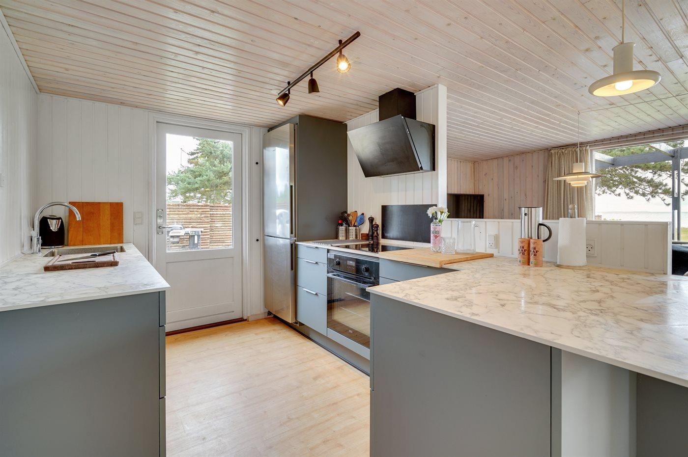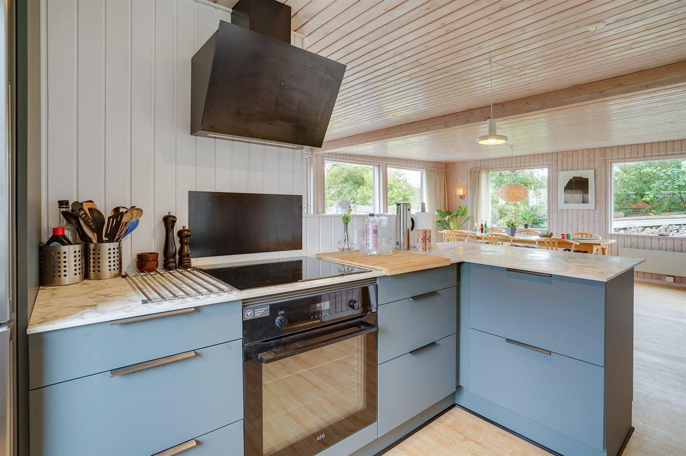 Køkkenet er udstyret med 1 køleskab. Der er 4 induktionskogeplader, varmluftovn, mikrobølgeovn samt opvaskemaskine.