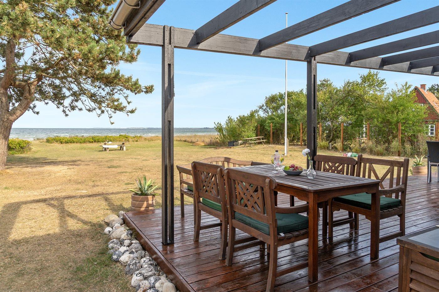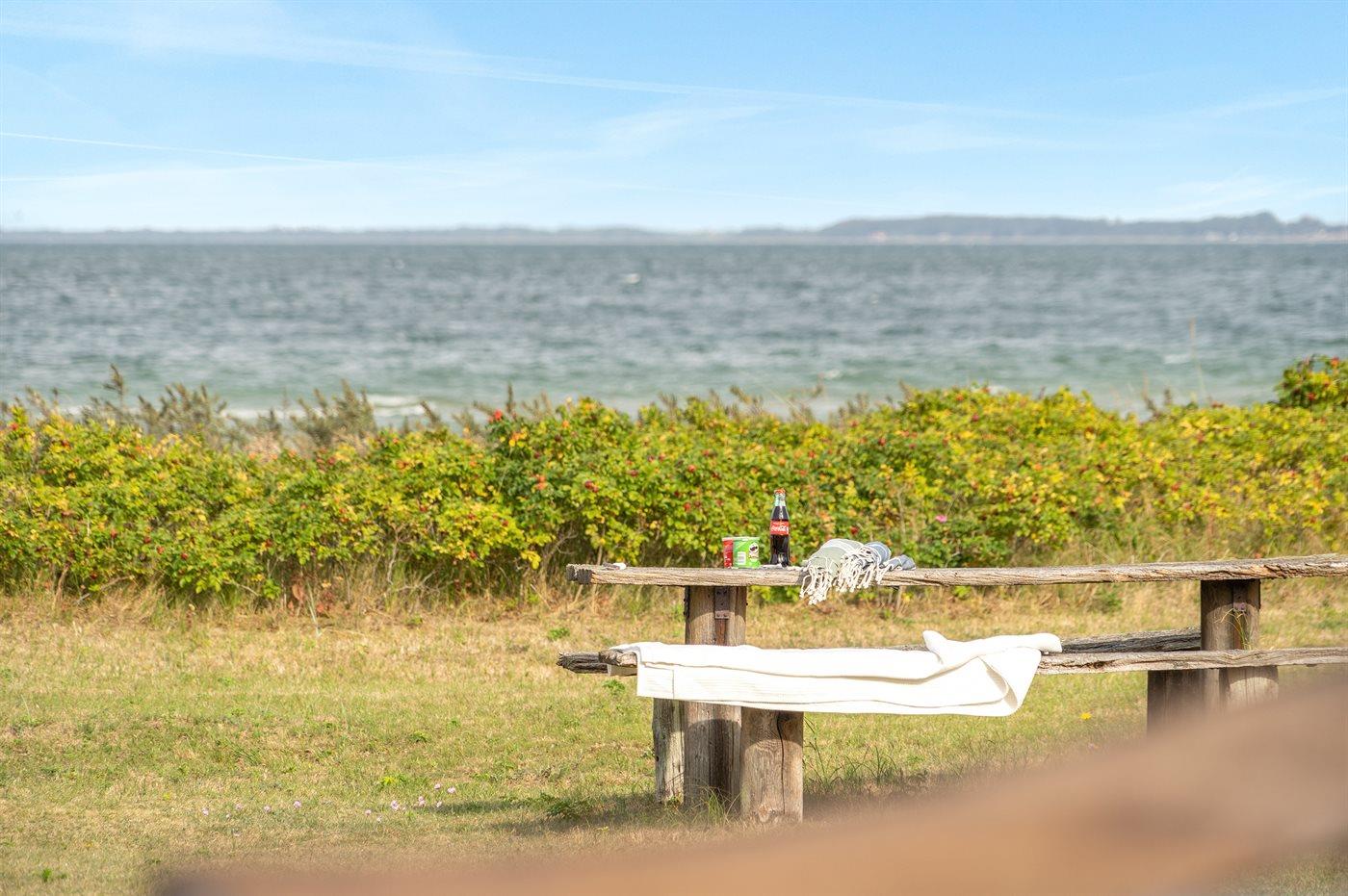 Charmerende sommerhus i 1. række ved Vejlby Fed med havudsigt, stor terrasse og kort afstand til badestrand.