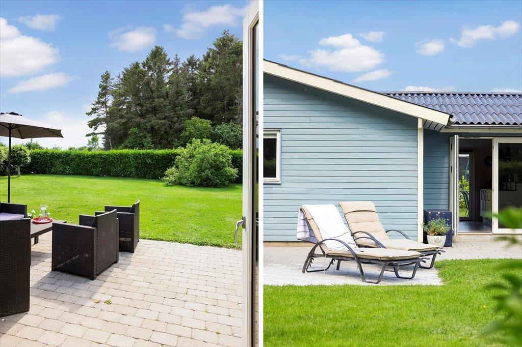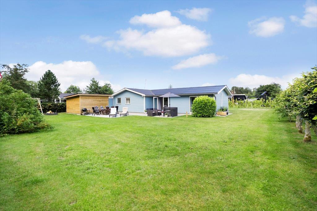 Sommerhusets udendørsarealer er lige så indbydende som indendørs. Fra køkkenet og stuen har du direkte adgang til en fliseterrasse, hvor du kan tænde op i grillen og nyde maden under åben himmel. Terrassen er rummelig og perfekt til lange, afslappede feriemiddage eller bare en stille stund med en god bog. Haven er stor og grøn, med en velplejet græsplæne, hvor børnene kan lege frit, og de mindste kan glæde sig over både gyngestativ og sandkasse. Her er der masser af plads til at nyde de solrige dage og skabe gode ferieminder med familie og venner.