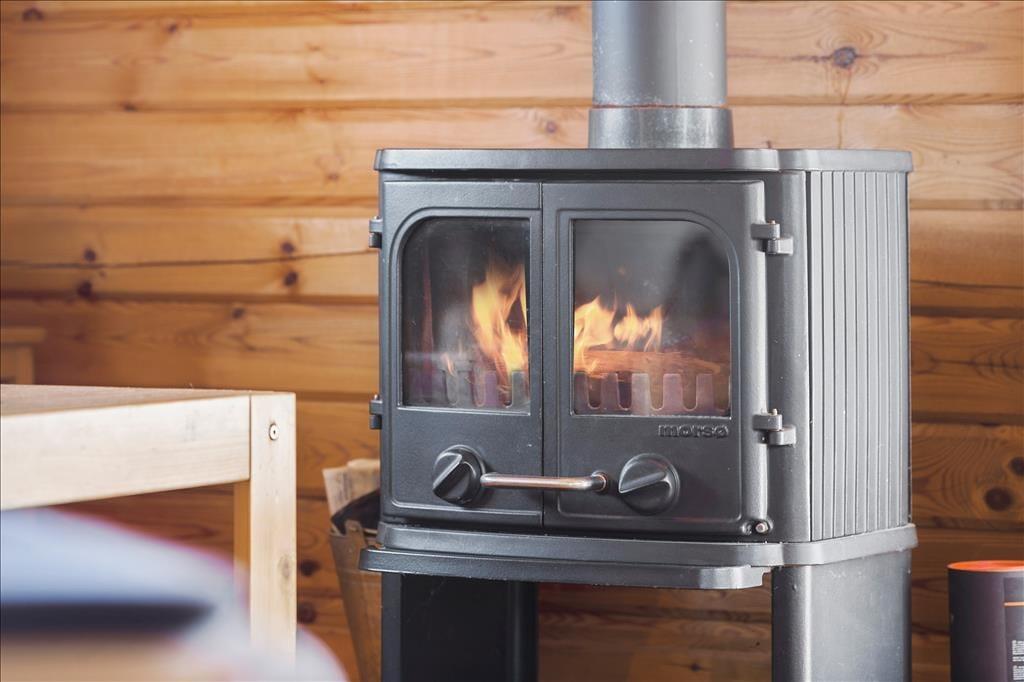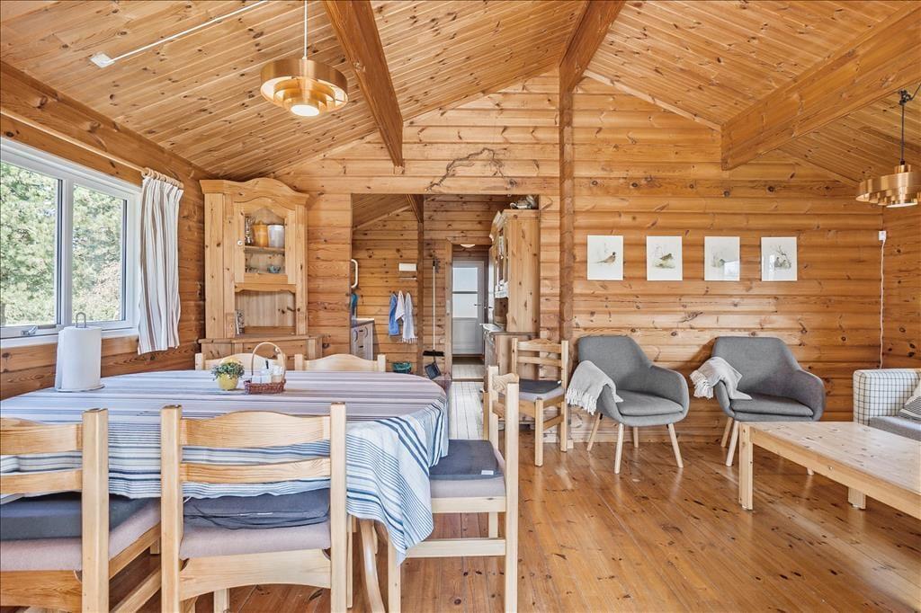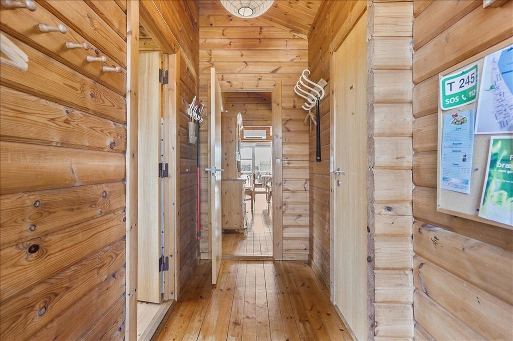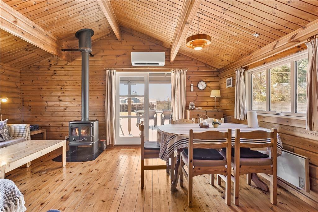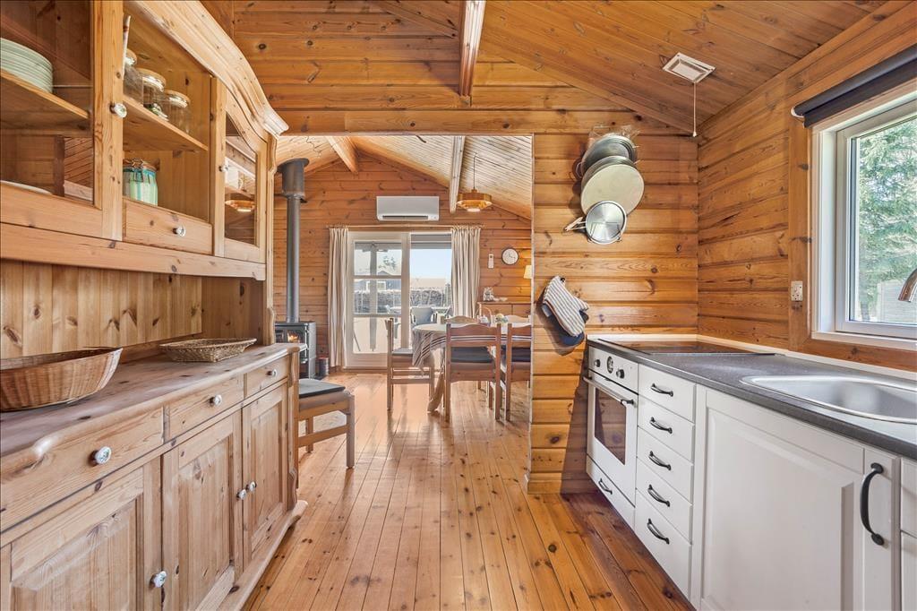 Når du træder indenfor i bjælkehuset, bliver du mødt af en særlig hygge, der opstår, når træ er det dominerende materiale fra gulv til loft. De synlige bjælker og trævæggene skaber en varm og indbydende atmosfære, og det føles næsten som at træde ind i en skovhytte. Fra det åbne køkken har du direkte adgang til stuen, hvor en brændeovn og en varmepumpe sikrer, at du altid kan have det behageligt – uanset årstiden. Her kan I samles om et godt måltid ved spisepladsen eller nyde en hyggelig aften med brætspil foran den knitrende brændeovn. Køjeværelset ligger over for badeværelset, som har en rummelig brusekabine.