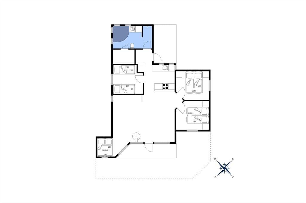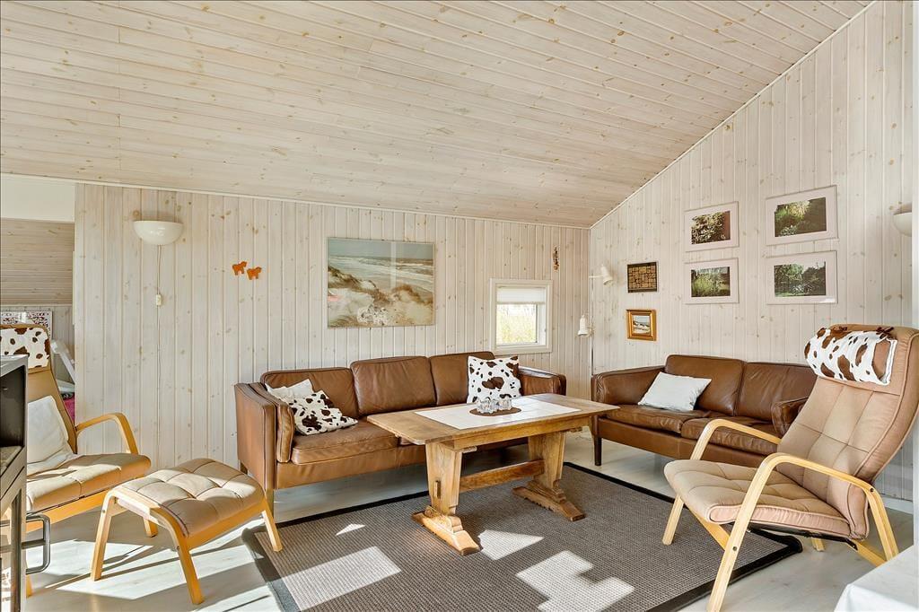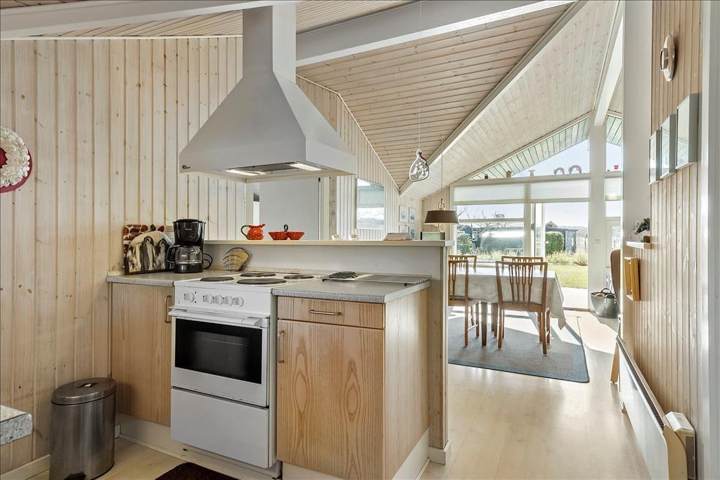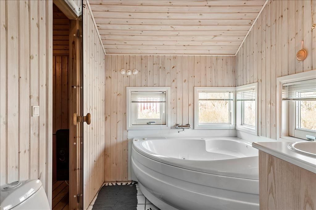 Sommerhuset byder dig varmt indenfor med sit åbne og lyse opholdsrum, hvor stuen og køkkenet går i ét. Her kan du samle familie og venner om hyggelige stunder, hvad end I spiller spil i den indbydende alkove, nyder et måltid ved spisepladsen eller slapper af i sofaen foran den knitrende brændeovn. Den store træterrasse, som har direkte adgang fra stuen, inviterer til måltider under åben himmel og afslappende dage i liggestolen med udsigt til haven og havet i horisonten. Badeværelset er et af sommerhusets helt store trækplastre med sit luksuriøse spabad og sauna – et ideelt sted at lade kroppen få ro efter en dag ved stranden eller en tur i området.