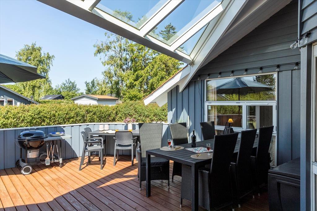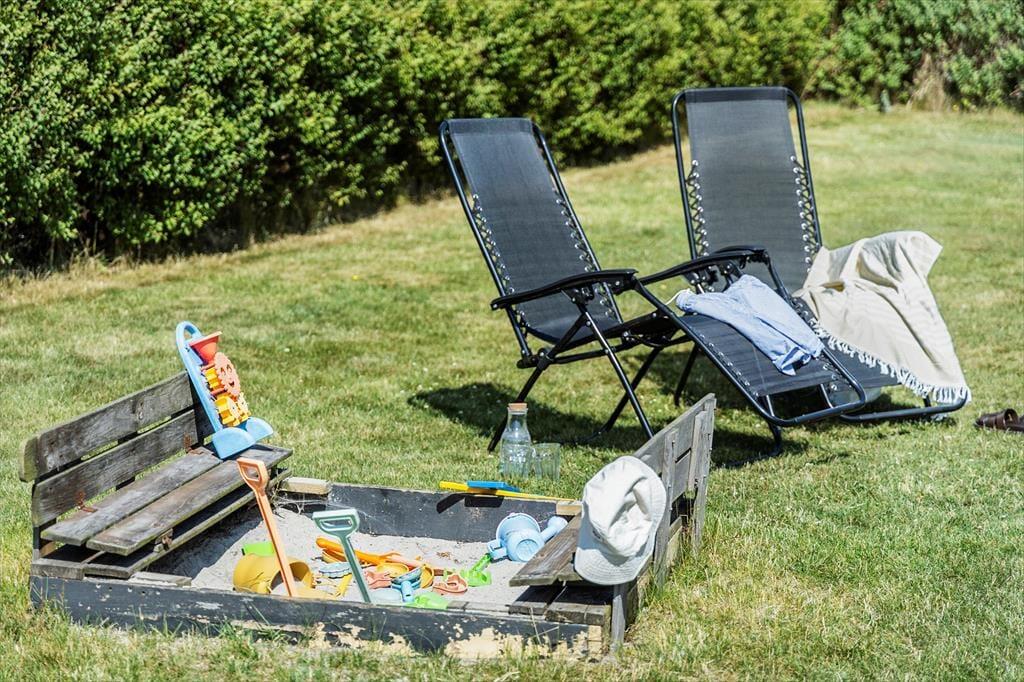 Udenfor venter en stor, velplejet græsplæne, der indbyder til afslapning og leg. Her kan du tage børnene med ud til bålstedet for at riste skumfiduser eller nyde en rolig eftermiddag, mens de svinger sig på gyngestativet eller leger i sandkassen. Trænger du til at komme helt ned i gear, kan du lægge dig på den store træterrasse i baghaven, hvor der er rigeligt med plads til solbadning. Om aftenen kan du tænde op i grillen og nyde et måltid under åben himmel, mens dagens sidste solstråler varmer. Der er også en mindre terrasse ved hovedindgangen, hvor du kan nyde morgenkaffen i stilhed.