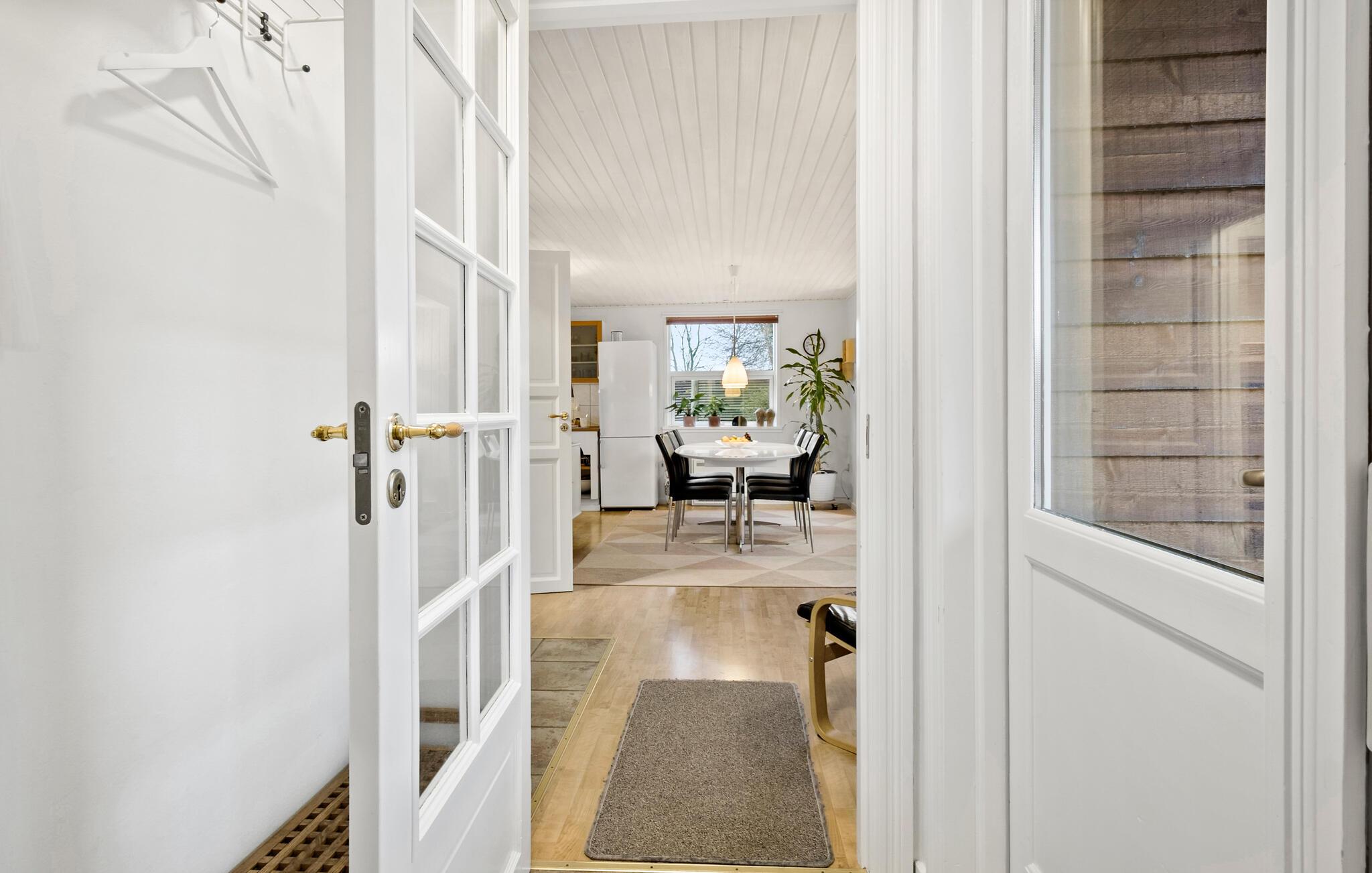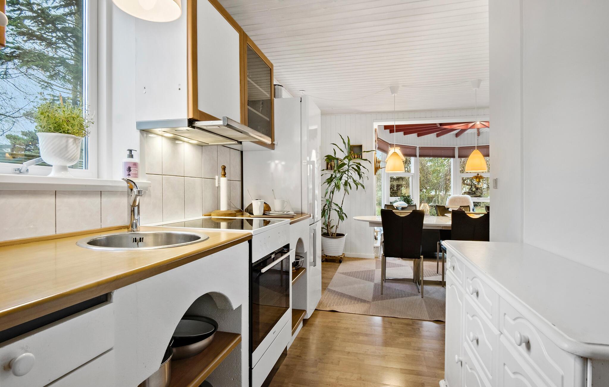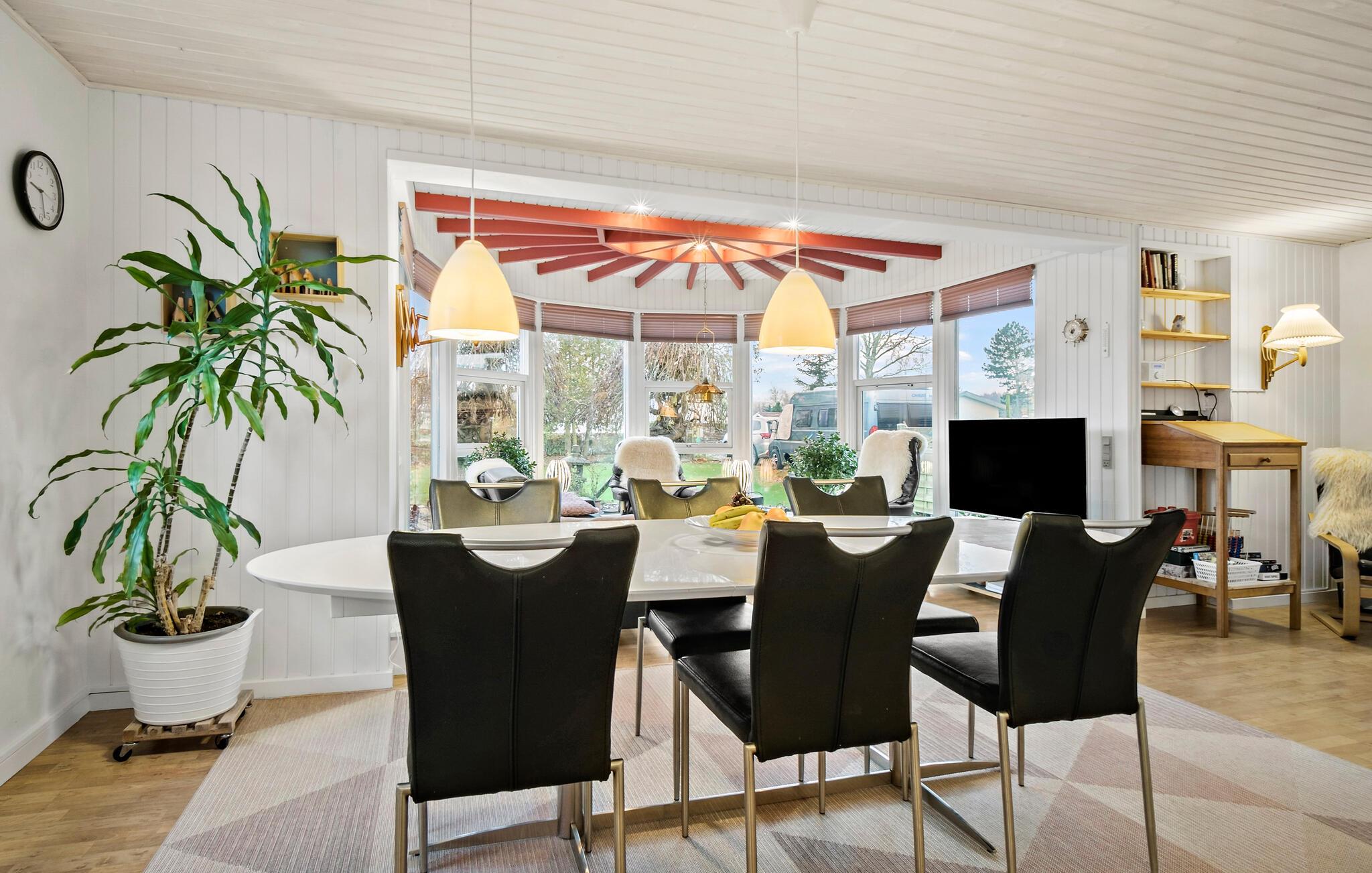 En masse komfort og moderne møbler venter på dig i det hyggelige sommerhus. Hjertet i huset er stuen, der er åben over for køkkenet og ligger i en slags rund vinterhave med store vinduer. Der er også 4 soveværelser og 1 badeværelse.