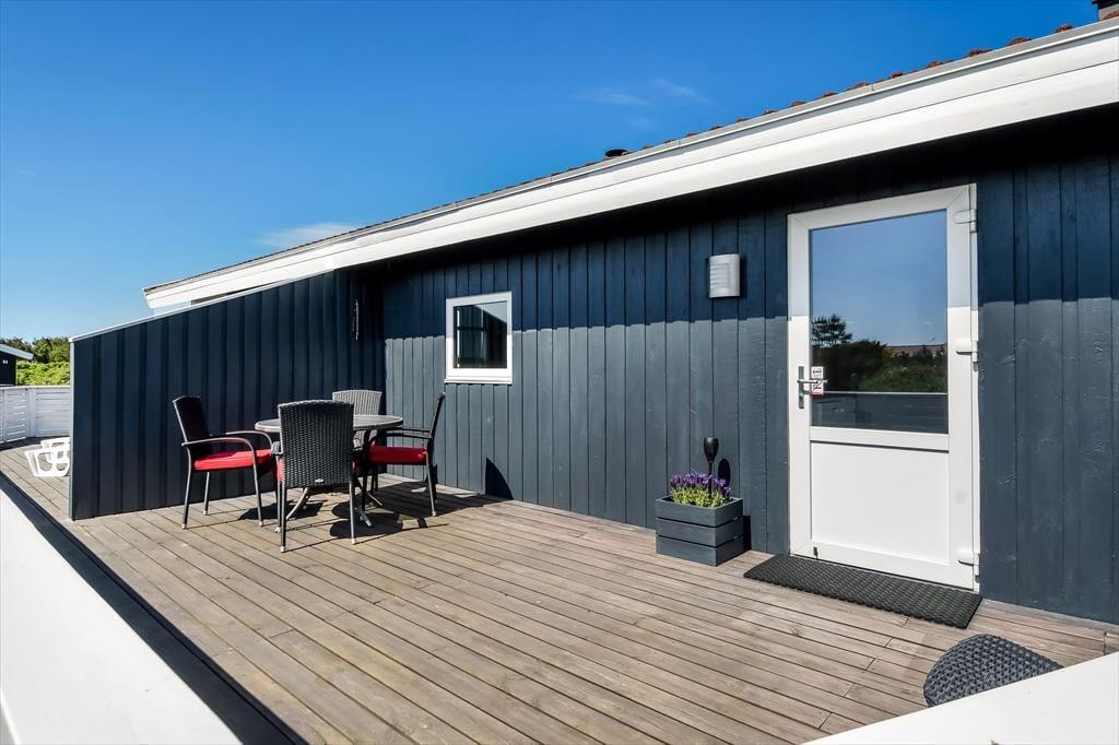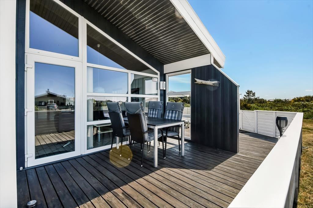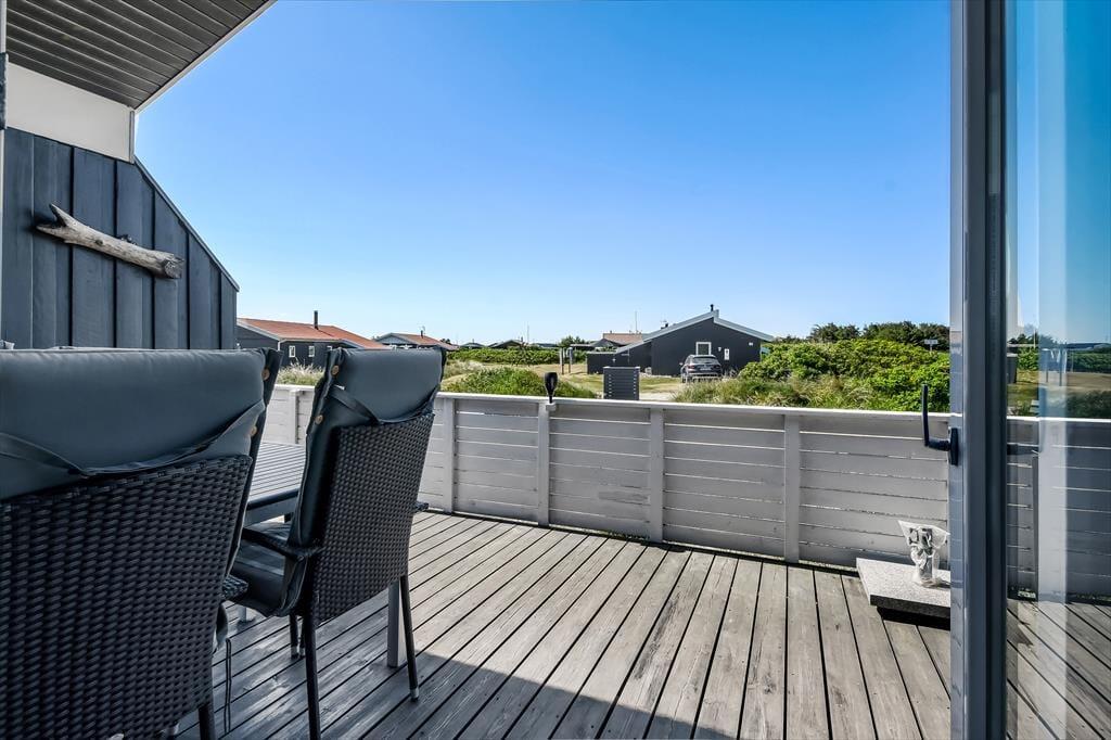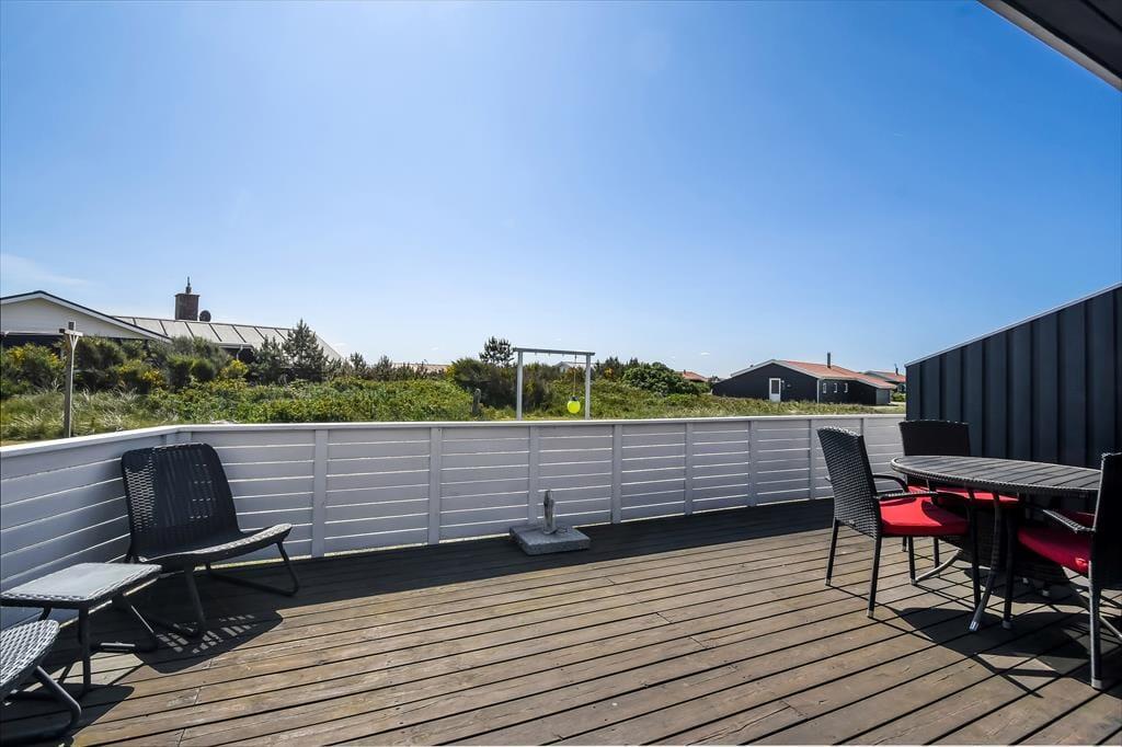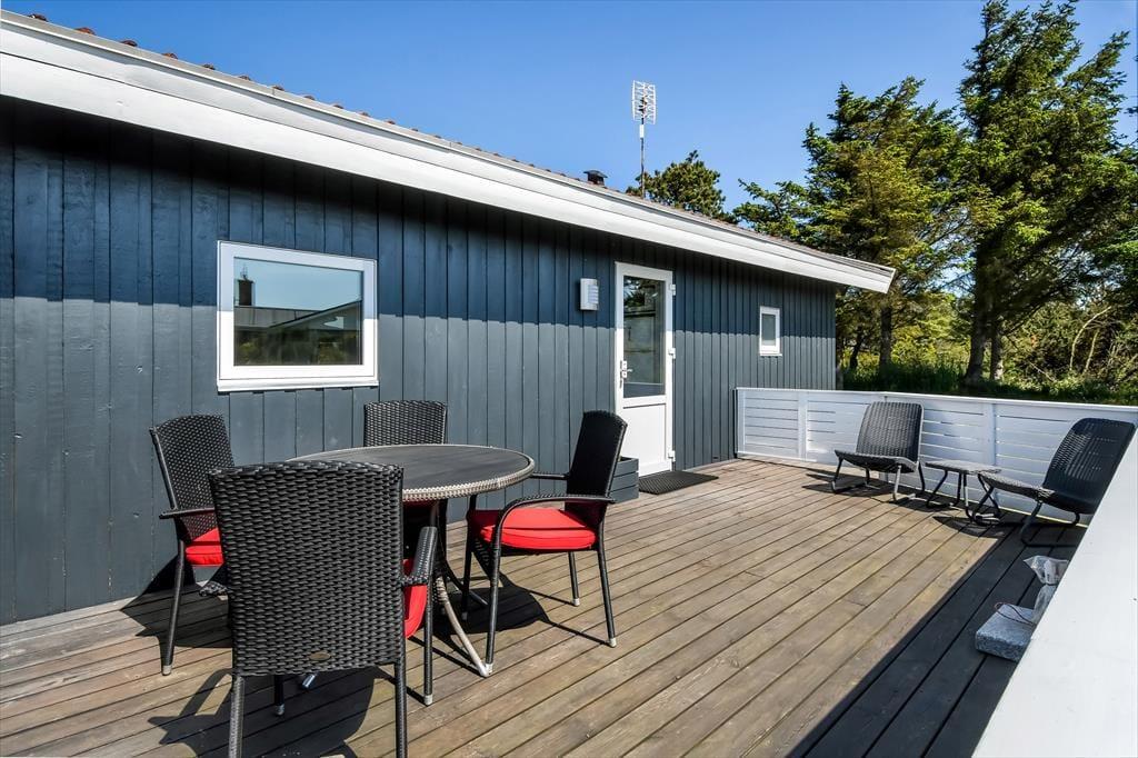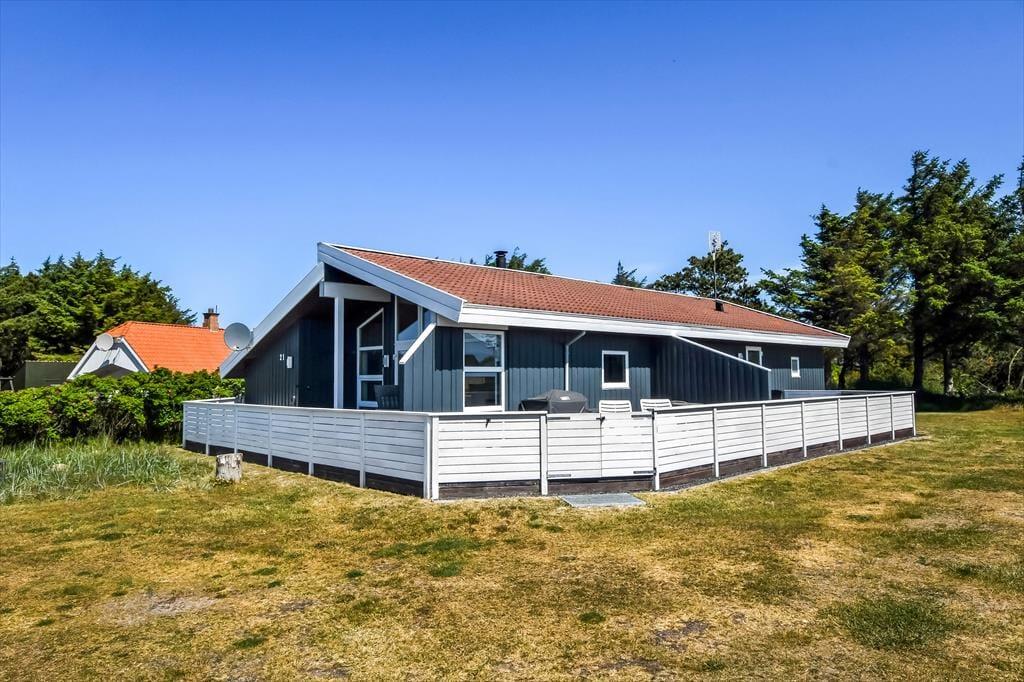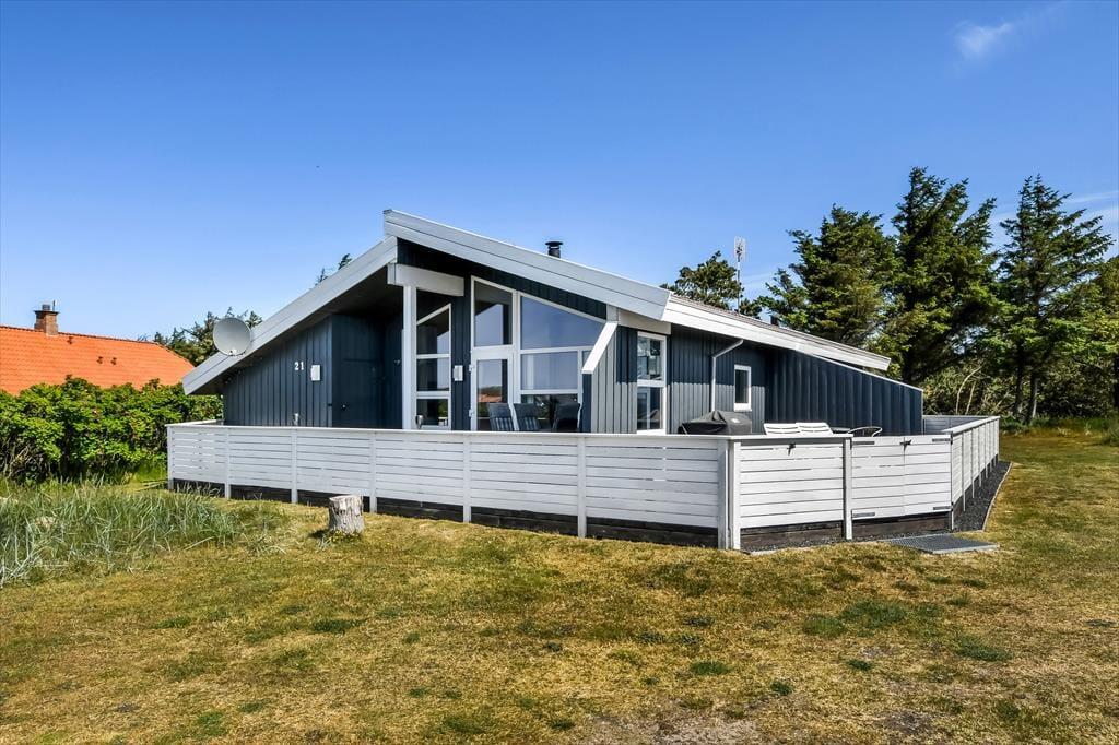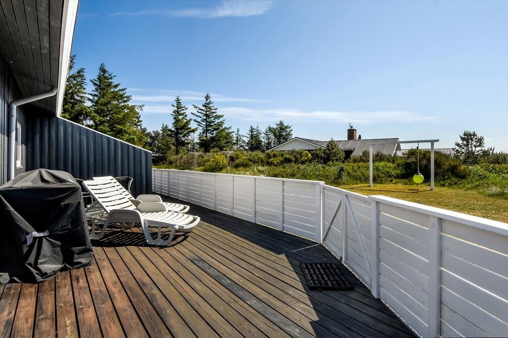 Sommerhuset er omgivet af en stor naturgrund, hvor børnene kan lege frit, og boltre sig. Den delvist overdækkede terrasse er udstyret med havemøbler og liggestole, perfekt til afslapning med en god bog eller en kop kaffe i solen. Om aftenen kan I samles omkring grillen og tilberede et lækkert måltid, mens solen går ned over klitterne. For de yngste gæster er der en gynge, hvor de kan få timer til at gå med leg og latter.