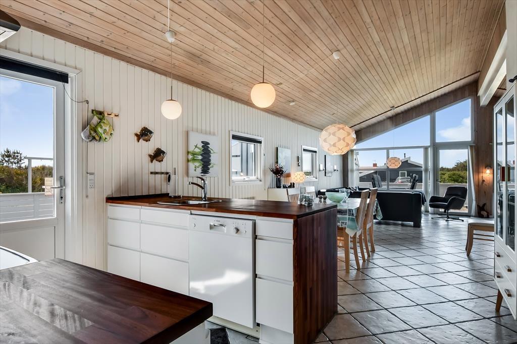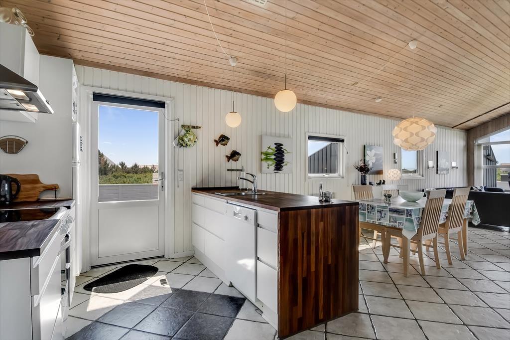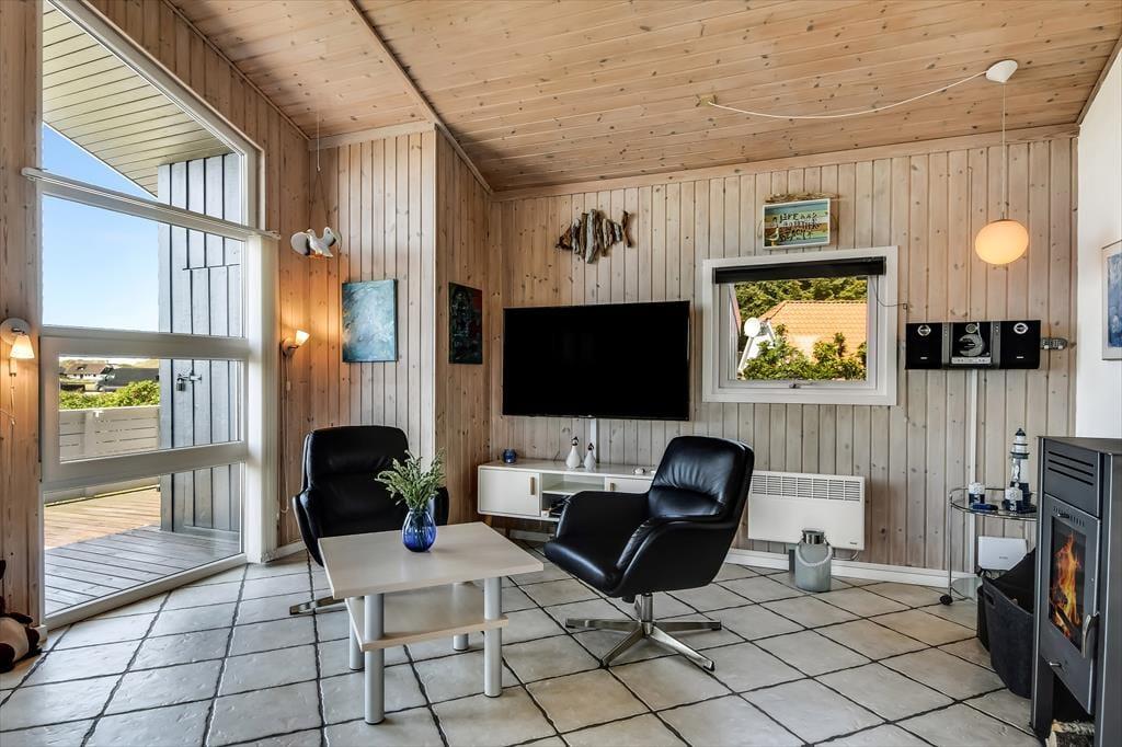 Når du træder ind i sommerhuset, mødes du af en rummelig stue med komfortable møbler og en knitrende brændeovn, der skaber en varm og hyggelig stemning på kølige aftener. Det åbne køkken gør det nemt at tilberede lækre feriemåltider, som kan nydes sammen med familien omkring spisebordet. De tre soveværelser er indrettet med behagelige senge, der sikrer en god nats søvn efter en dag fuld af oplevelser. Badeværelset er lyst og har gulvvarme, så du kan starte dagen med en behagelig temperatur under fødderne.