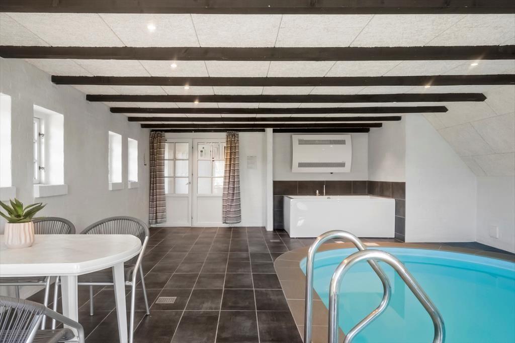 Huset er opdelt i to sammenhængende afdelinger, forbundet af en solrig gårdhave. I den ene afdeling finder du et nyrenoveret poolområde med en 22 m² swimmingpool og et indbydende spabad, hvor du kan lade hverdagens stress forsvinde. Efter en svømmetur kan du nyde varmen i saunaen, som også er tilgængelig her. På første sal er der en hyggelig opholdsstue med en dobbelt sovesofa, ideel til børn, samt to soveværelser. Den anden afdeling rummer et veludstyret køkken i åben forbindelse med spise- og opholdsområdet, hvor familien kan samles omkring måltider og hyggelige aftener. Her er der også to soveværelser på første sal.