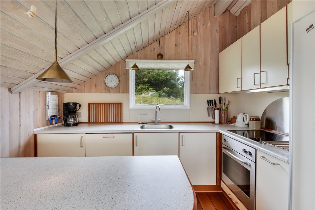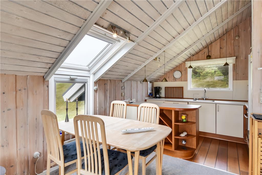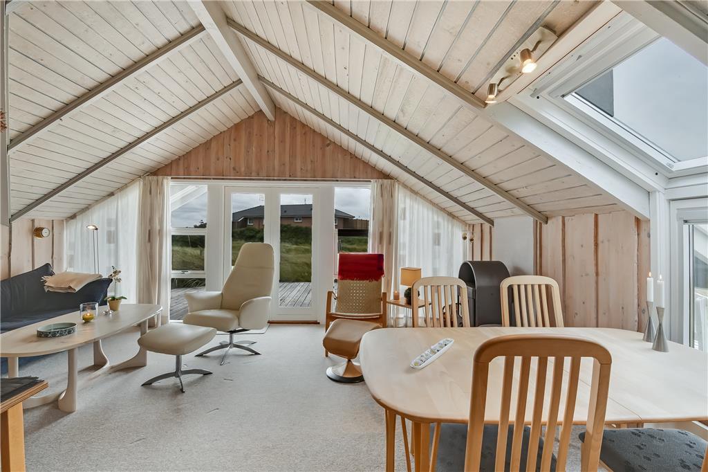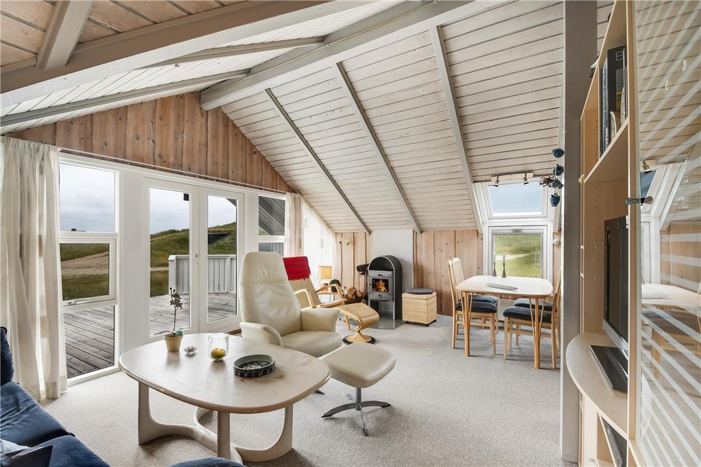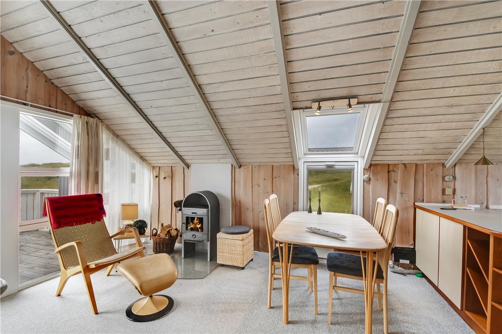 Det første, du lægger mærke til, når du træder ind i sommerhuset på Merchantvej 10 C, er den varme og afslappede stemning. Huset er enkelt indrettet i klassisk sommerhusstil med lyse overflader og en funktionel planløsning, der får de fælles stunder til at flyde naturligt. Køkken og stue ligger i åben forbindelse med spiseområdet, så du kan lave mad uden at gå glip af hyggen. Store vinduer og terrassedøre inviterer det skiftende vestjyske lys helt ind i rummene, og udsigten til klitterne udenfor giver følelsen af at være ét med naturen. Det er et sommerhus, hvor roen hurtigt indfinder sig – perfekt til små familier eller et par, der ønsker at koble af og nyde stilheden tæt på havet.