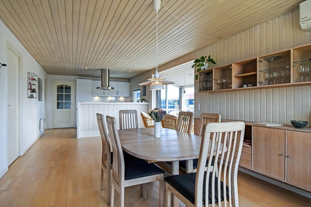 Sommerhuset byder på en behagelig og hjemlig atmosfære, hvor du hurtigt falder ned i gear. I stuen er der indrettet et rart opholdsområde med brændeovn, så du kan nyde varmen og de levende flammer, når vinden rusker i tagrenderne og ferien står på indendørshygge. Køkken og spiseområde ligger i åben forbindelse med stuen, så hele familien nemt kan være samlet – uanset om I laver mad, spiller spil eller bare hygger jer med en god film. Indretningen er lys og enkel, og vinduerne lukker det omkringliggende landskab helt ind i rummet. Sommerhuset er ideelt for både par og familier, som ønsker et roligt og stemningsfuldt udgangspunkt for ferien ved Vesterhavet.