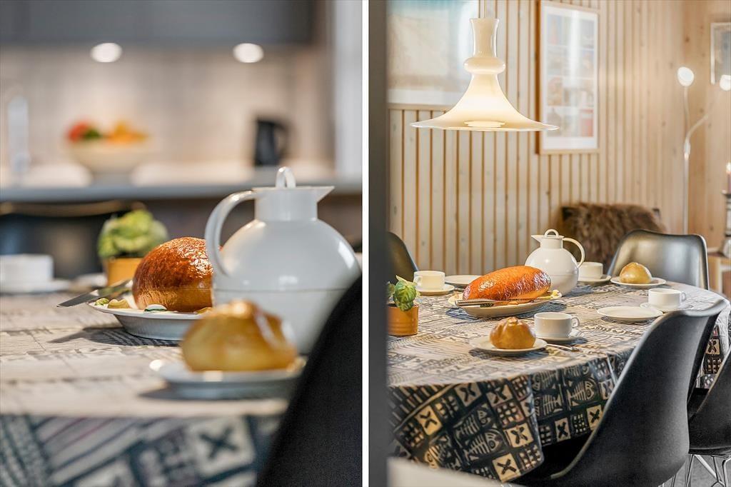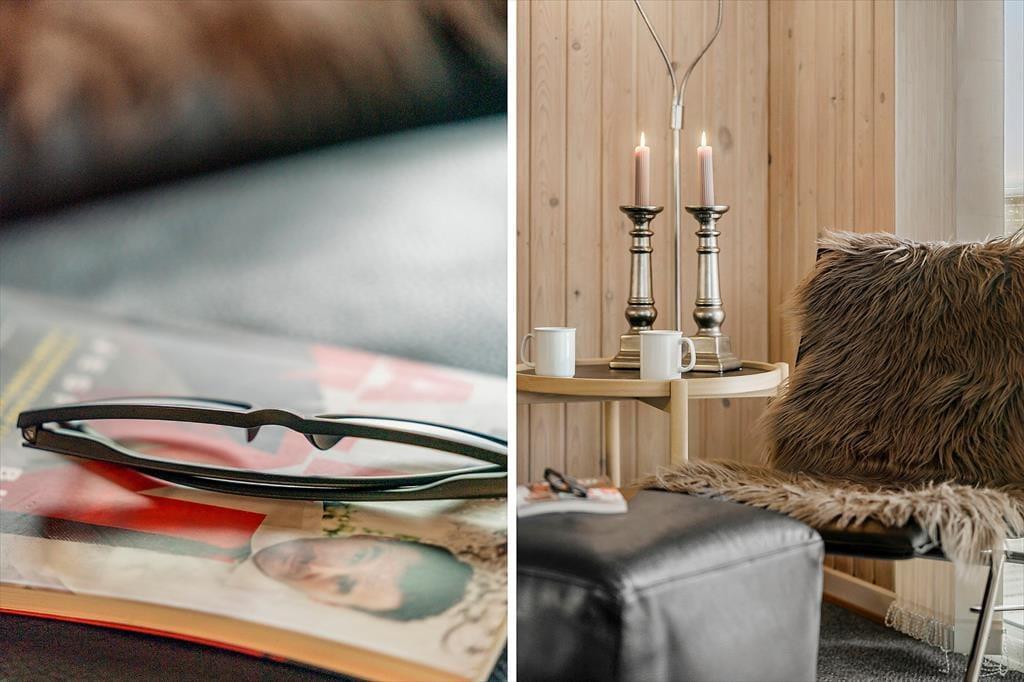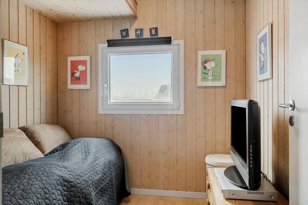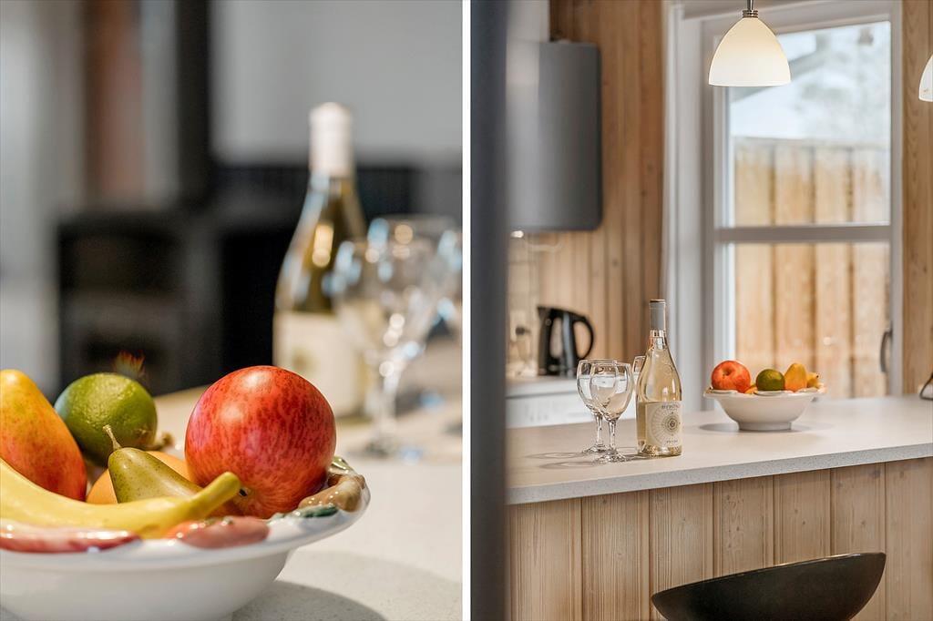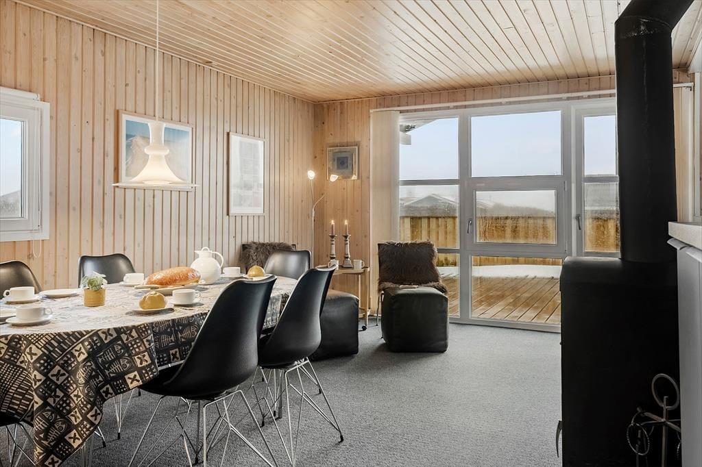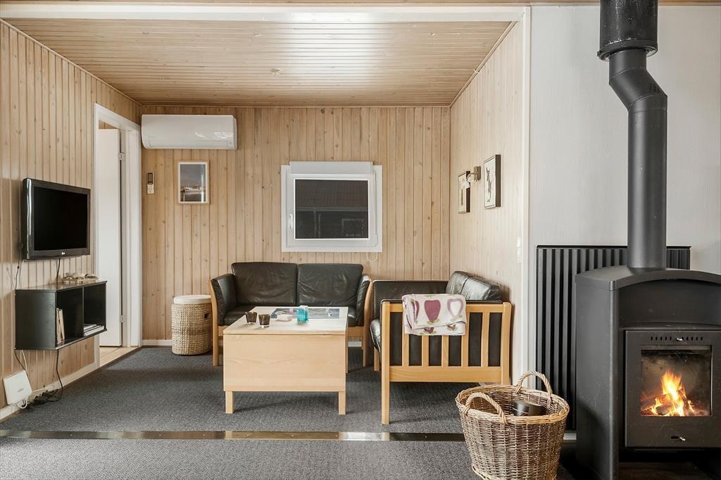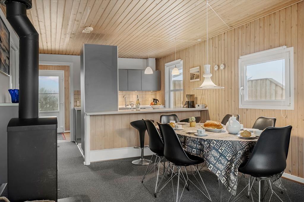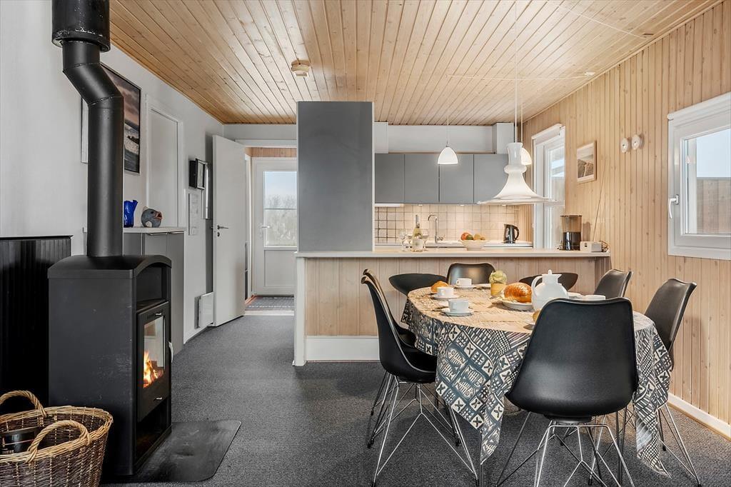 Allerede ved ankomsten mødes du af en rar og afslappet atmosfære. Sommerhuset har en lys og funktionel indretning, hvor stue og køkken smelter sammen i ét stort opholdsrum – perfekt til hyggelige stunder med familie og venner. Det åbne køkken gør det let at være fælles om madlavningen, mens du stadig kan deltage i samtalen eller holde øje med børnene, der tegner eller spiller spil ved spisebordet. Når mørket falder på, og temperaturen daler, er det oplagt at tænde op i brændeovnen og finde tæpperne frem – så bliver stuen hurtigt forvandlet til det mest indbydende hyggehjørne, hvor du kan nyde roen og samværet, mens flammerne flakker bag ruden.