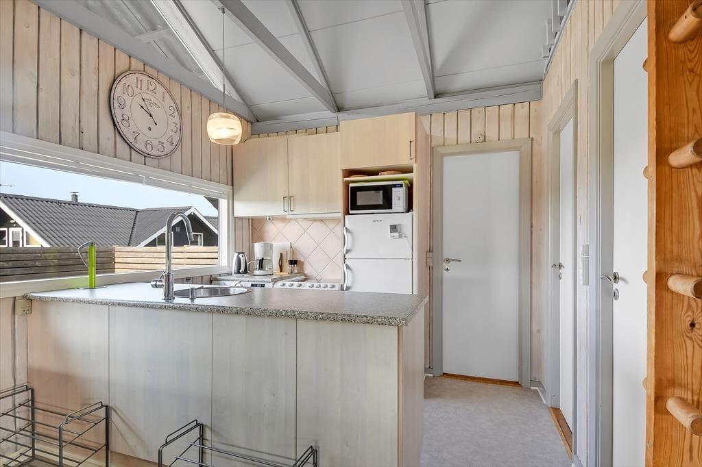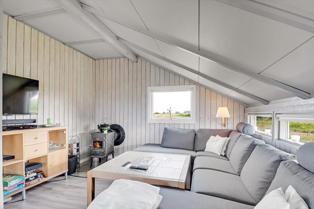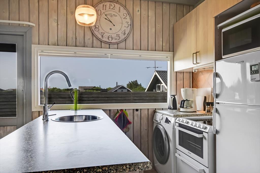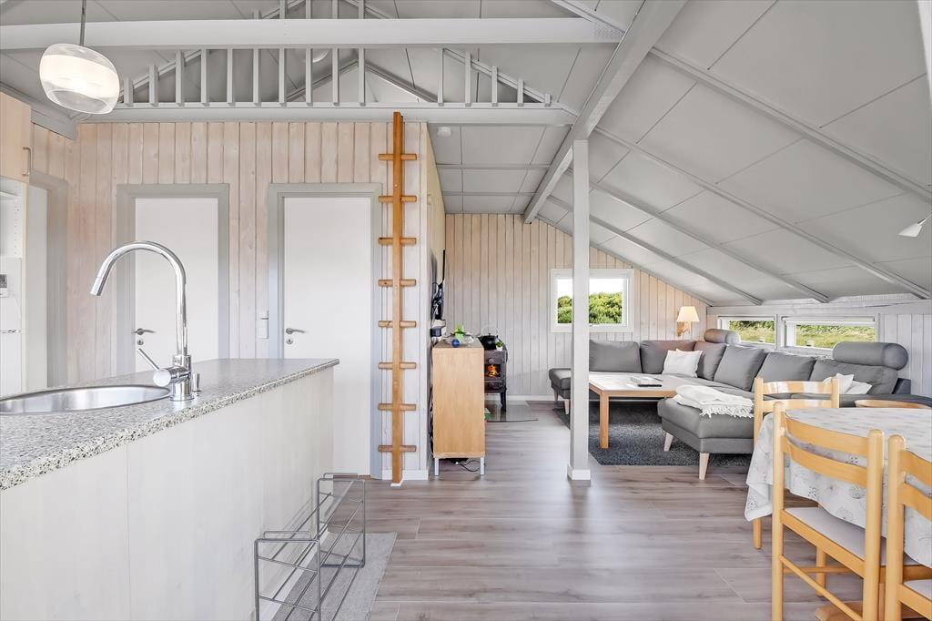 Indenfor mødes du af en lys og venlig atmosfære, hvor den funktionelle indretning gør det let at finde sig til rette. Køkken og stue er forbundet i et åbent opholdsrum, der indbyder til samtale og fælles stunder – uanset om du laver aftensmad, spiller spil eller bare læner dig tilbage med en god bog. Store vinduer trækker dagslyset ind og skaber en behagelig stemning, og selv på en blæsende dag er det let at føle sig tryg og hjemme i de varme og hyggelige omgivelser. Her kan du både høre vinden suse udenfor og nyde lyden af grin og liv indenfor – alt sammen med naturen som kulisse.