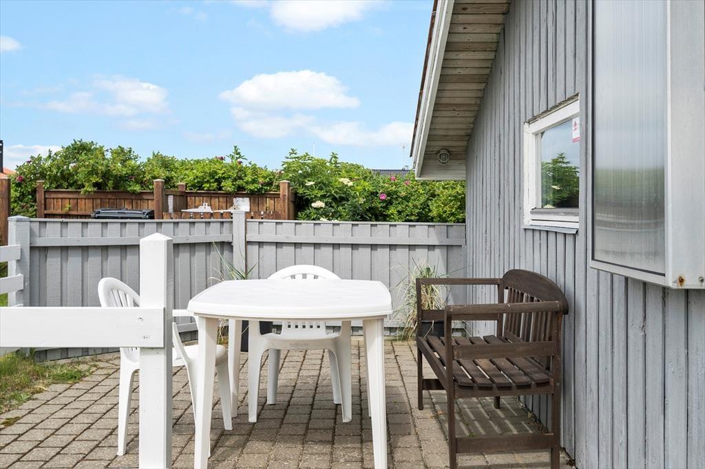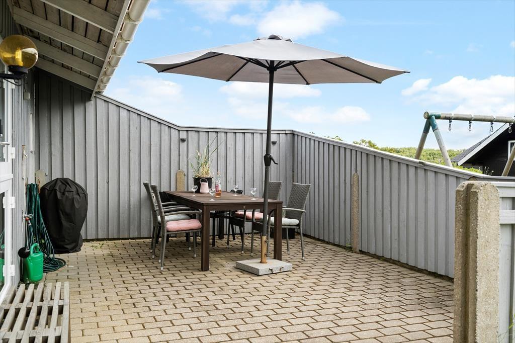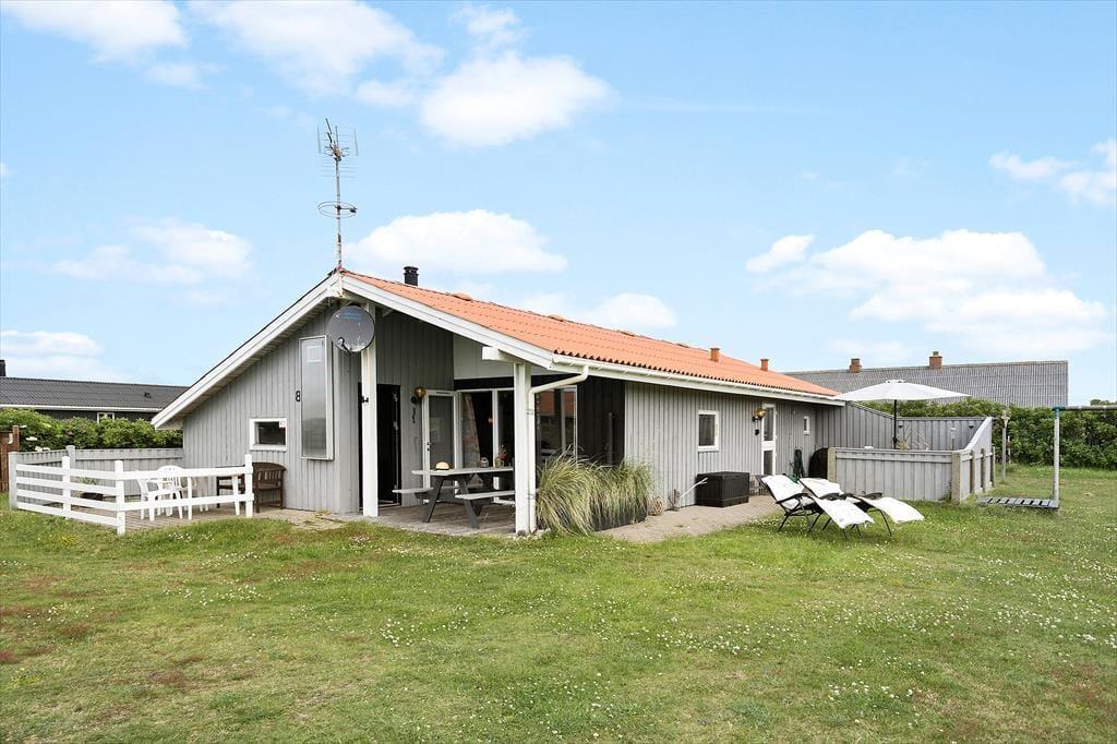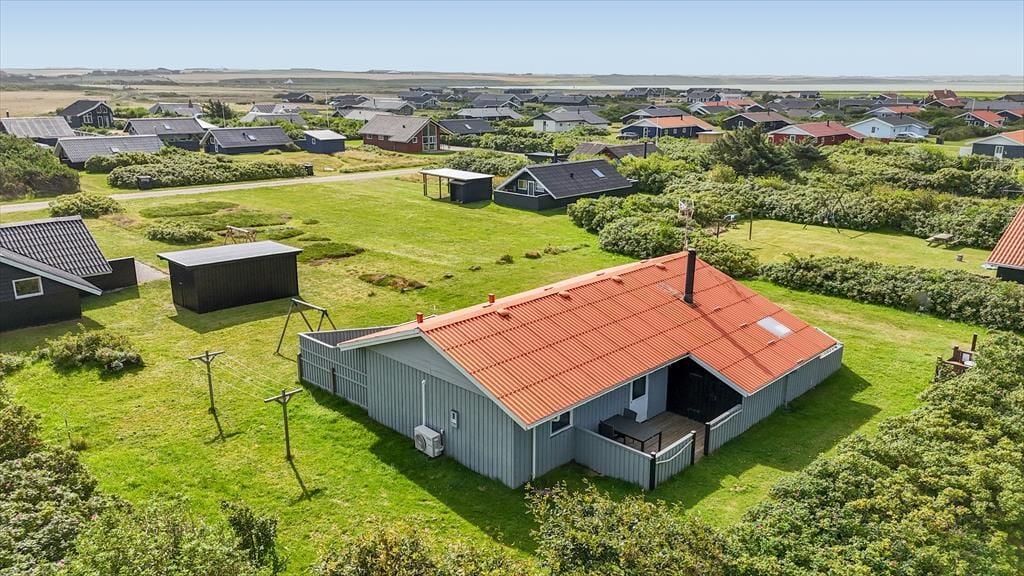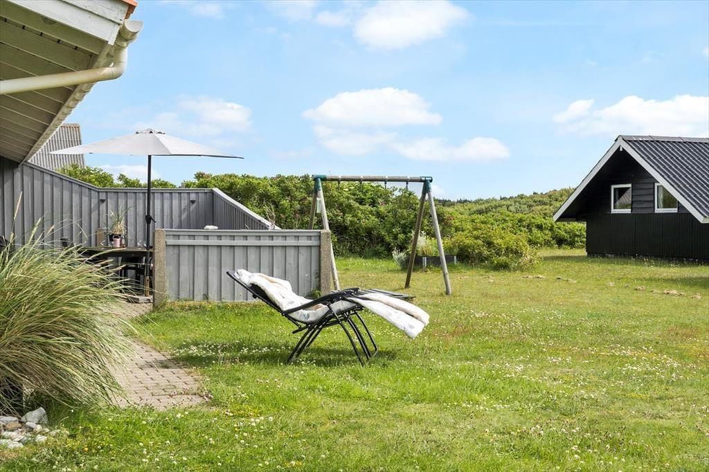 Sommerhusets udearealer er lige så indbydende som det, du finder indenfor. Der er både en åben og en overdækket terrasse med havemøbler og grill, så du altid kan finde en god siddeplads – i solen eller i læ. Her kan du nyde lange sommeraftener, tænde op i grillen og lade roen sænke sig over området, mens solen går ned over klitterne. Haven rummer også gode legemuligheder for børn med både gynge og sandkasse, og den grønne plæne indbyder til boldspil og leg. Du får altså masser af plads til at nyde udelivet – uanset alder og ferieform.