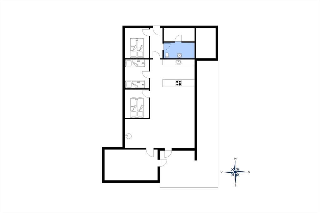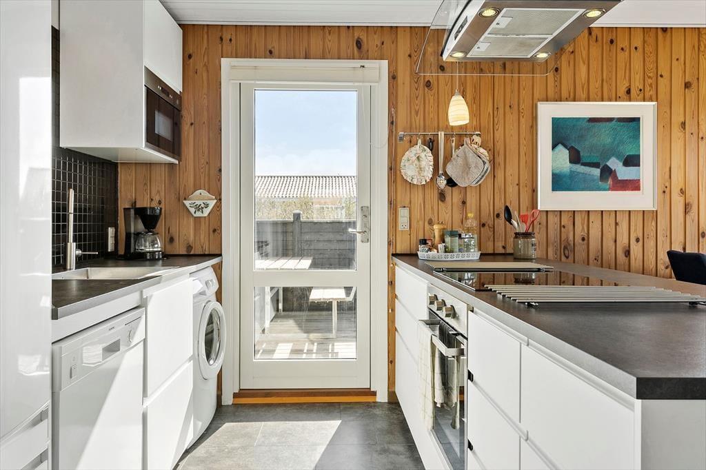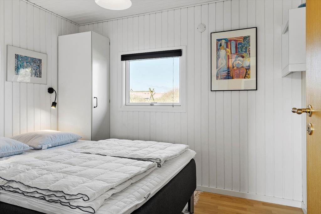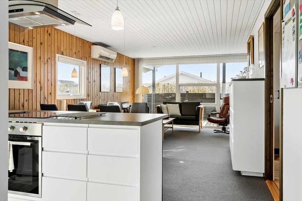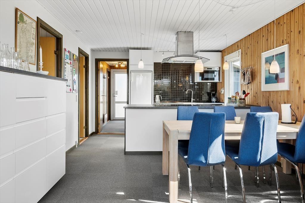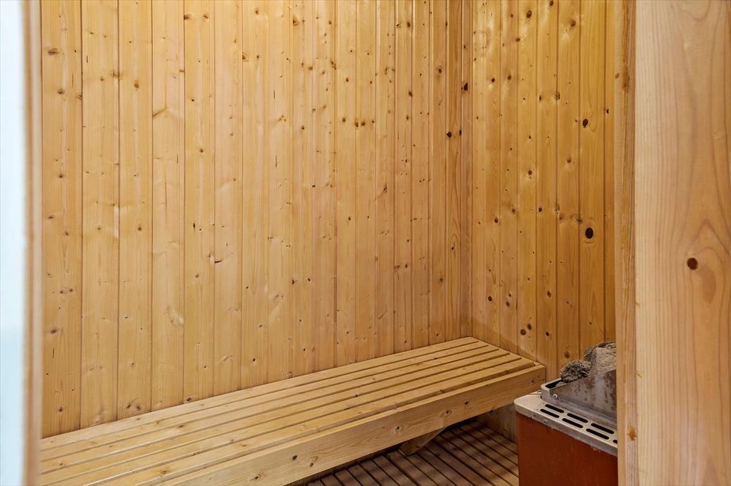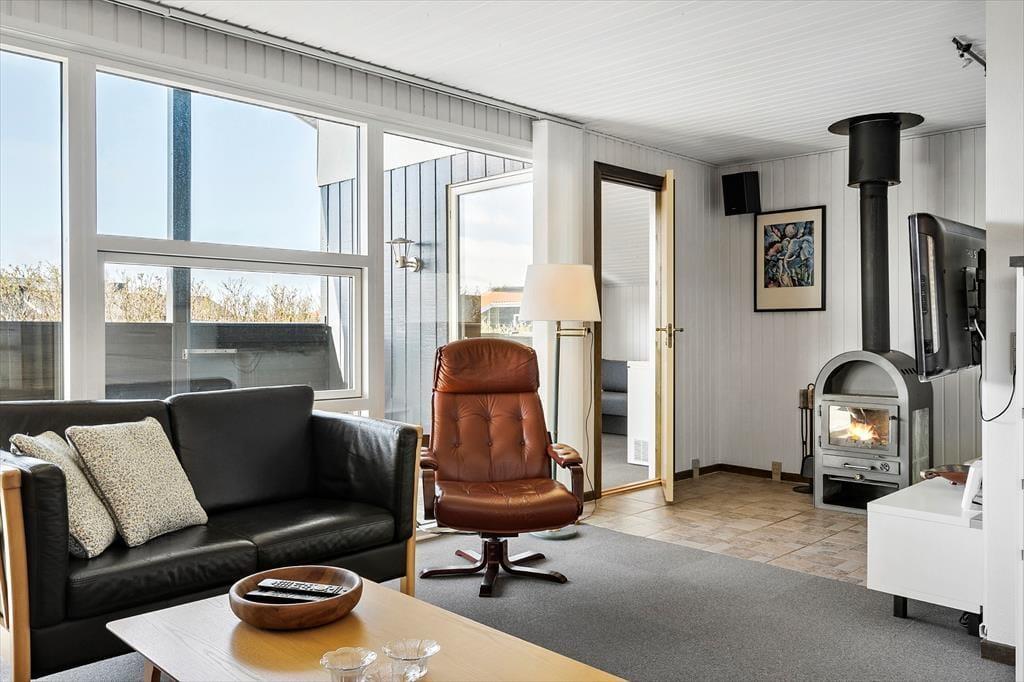Sommerhusets indre byder på en lys og venlig atmosfære, hvor feriestemningen hurtigt melder sig. Den åbne planløsning forbinder stue og køkken i ét samlet opholdsrum, hvor hele familien kan samles om madlavning, morgenkaffe eller spil ved spisebordet. I den ene ende af rummet står brændeovnen klar til at varme jer op efter en dag i naturen, og det knitrende ildsted giver ekstra hygge, når vejret indbyder til indendørs aktiviteter. Badeværelset har både bruseniche og sauna – en luksus, der især er skøn efter en lang gåtur ved havet eller en dukkert i det friske Vesterhav. Her er det nemt at koble af, uanset om du søger ro og nærvær eller bare et sted, hvor hverdagen kan glemmes for en stund.