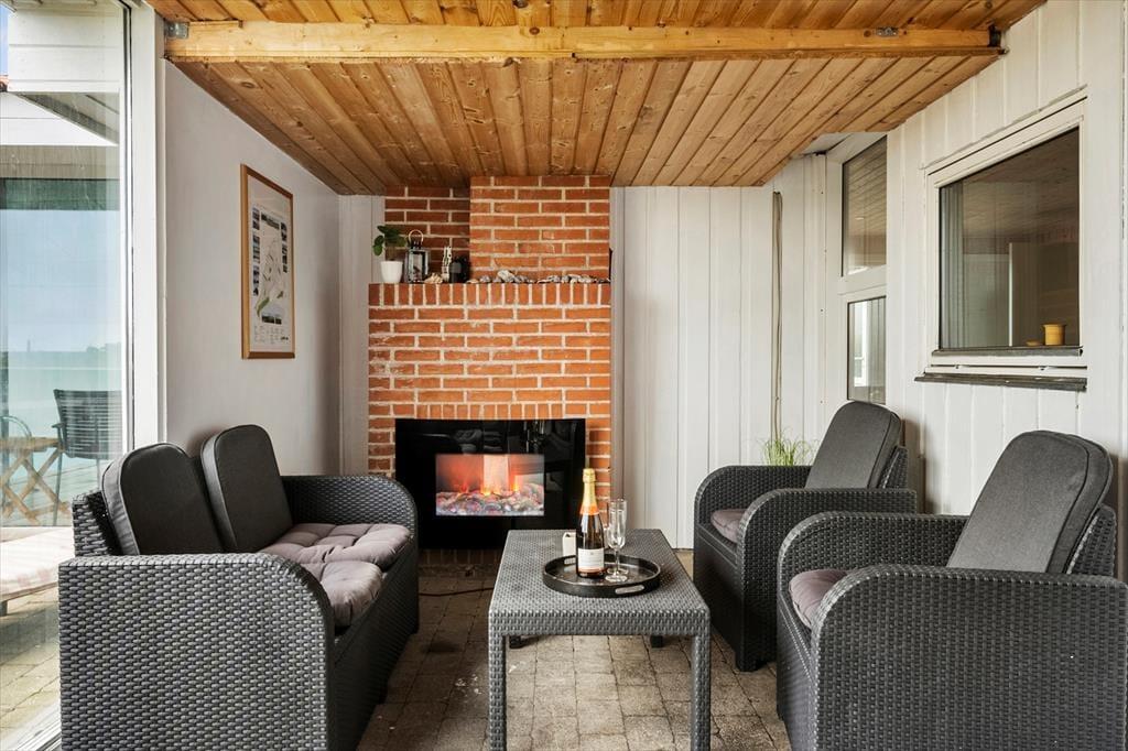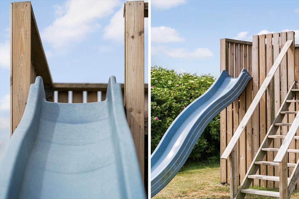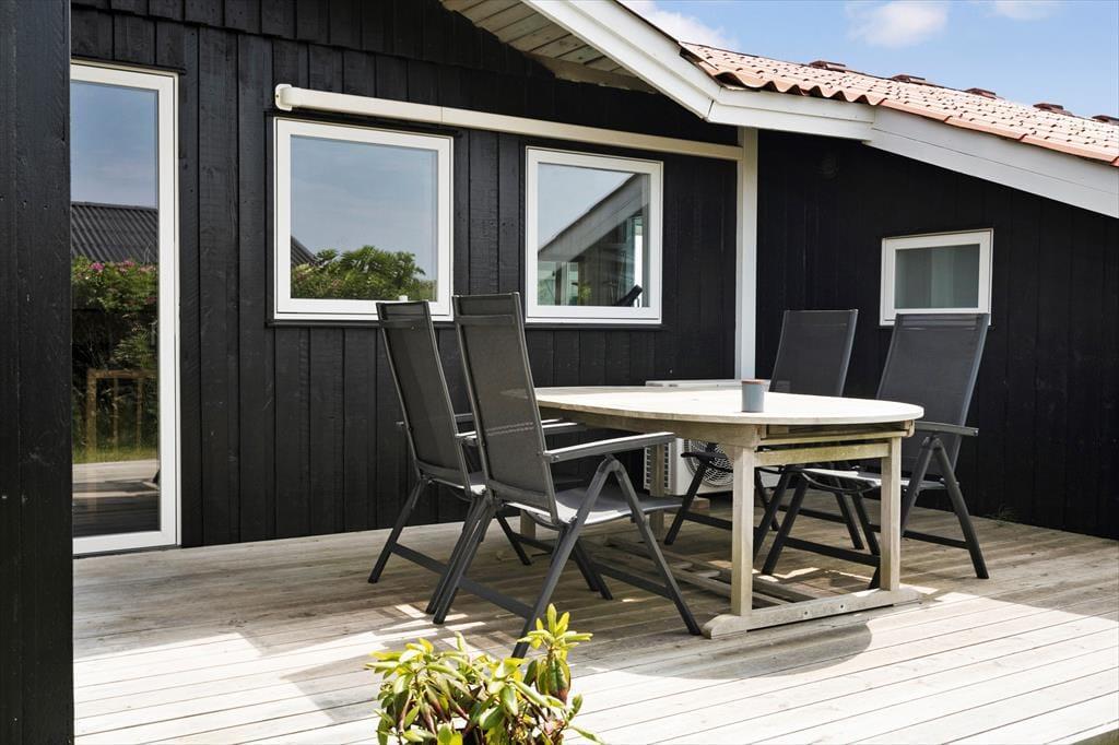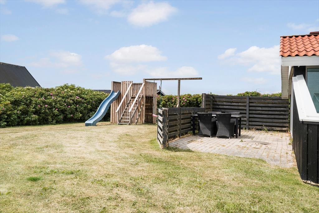 Udendørsområdet byder på en dejlig terrasse mod syd/øst, hvor du kan nyde morgenkaffen, mens du lytter til fuglenes kvidren og indånder den friske havluft. For børnene er der et legetårn, og de vil desuden elske den nærliggende offentlige legeplads, hvor de kan lege og møde nye venner. Efter en dag med aktiviteter er det skønt at slappe af på terrassen mod vest og måske grille en lækker middag, mens solen går ned i horisonten.