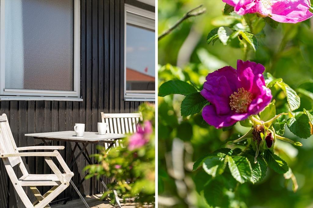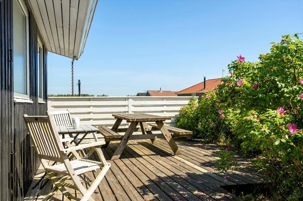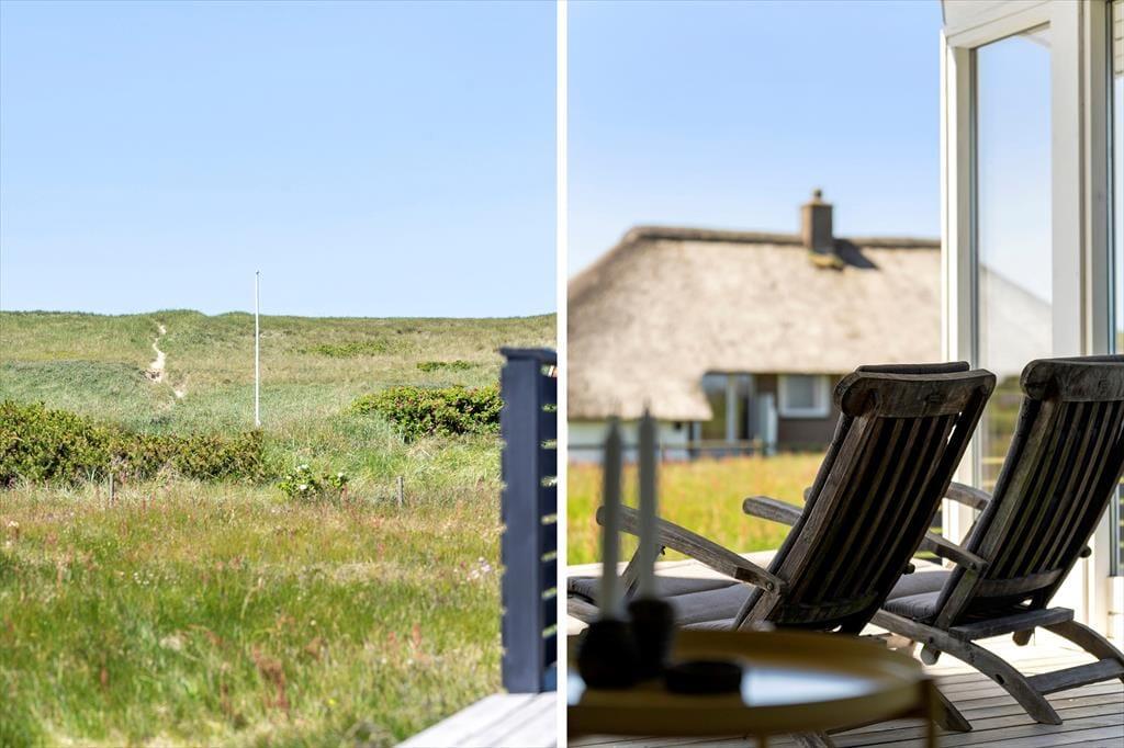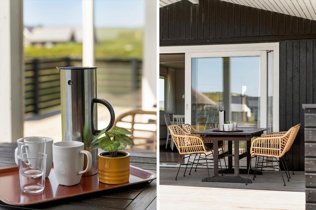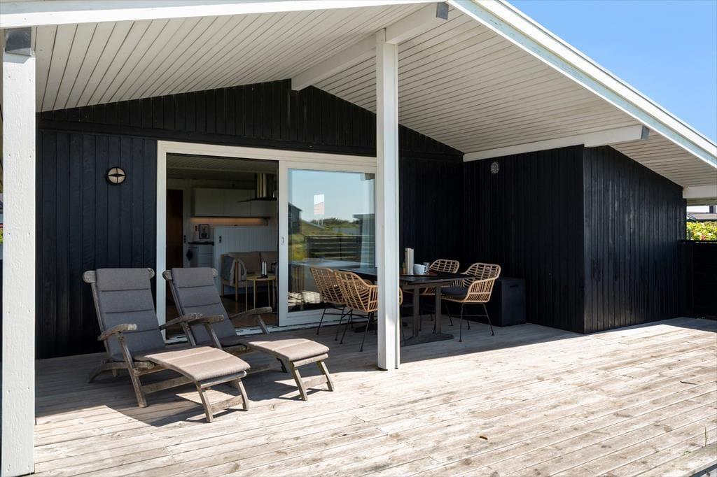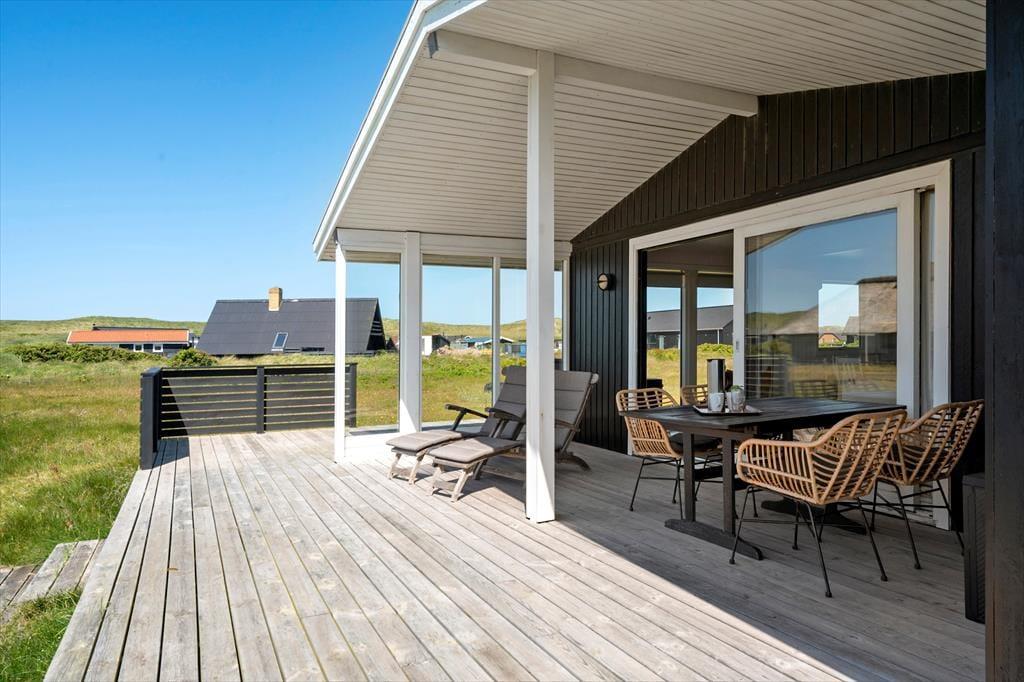 Terrasserne er uden tvivl en af sommerhusets store styrker. Med hele tre forskellige terrasser – heraf en overdækket – kan du altid finde en lækrog eller et sted i solen, uanset vindretning og tidspunkt på dagen. Den overdækkede terrasse er perfekt til de lange sommeraftener, hvor I griller og nyder maden udendørs, mens solen går ned over klitterne og lyset bliver blødt og gyldent. Rundt om huset er der god plads til leg og afslapning, og uanset om du nyder morgenkaffen i ro og mag eller lader børnene tumle rundt udenfor, så er det let at mærke feriestemningen brede sig. Og når du sidder her i solen, omgivet af marehalm og klitlandskab, føles hverdagen pludselig meget langt væk.