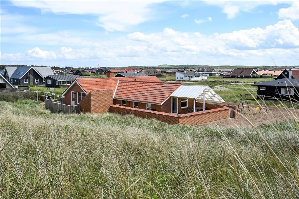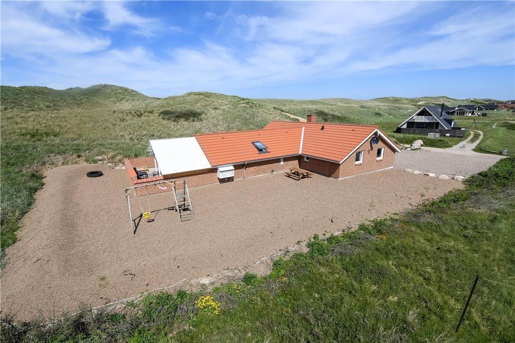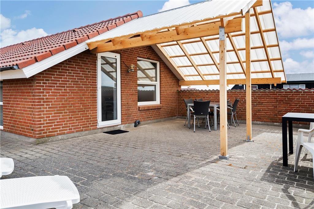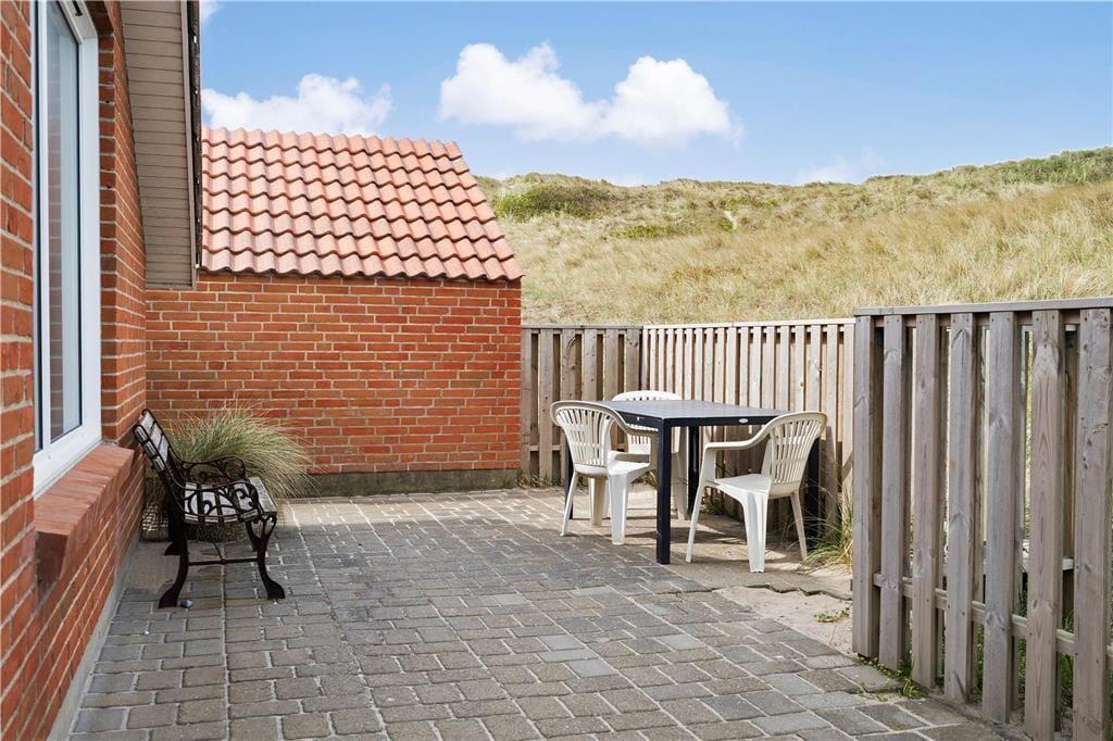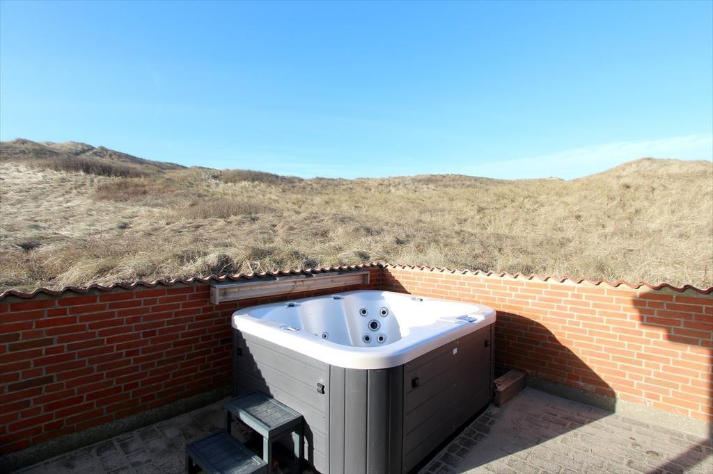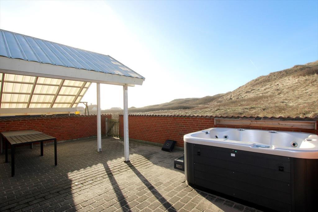Udendørsområdet byder på en stor, delvist overdækket terrasse, hvor du kan nyde solen hele dagen. Med havemøbler, liggestole og en grill er der lagt op til hyggelige grillaftener med familien, mens børnene leger i sandkassen eller gynger. Den indhegnede terrasse sikrer, at både børn og eventuelle hunde kan lege frit og trygt. Efter en gåtur langs stranden er det skønt at kunne slappe af i det udendørs spabad, mens du lytter til Vesterhavets bølger i baggrunden.