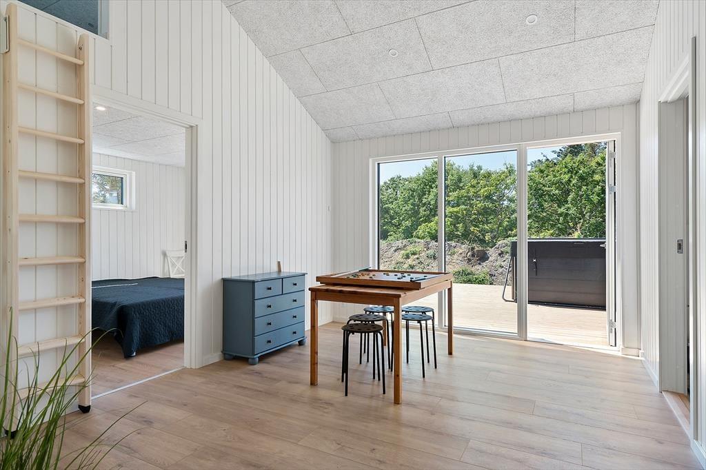 Når dette nye sommerhus står færdigt, bliver det en lys og indbydende base for afslapning og hygge. Store vinduespartier vil trække lyset og naturen helt ind i opholdsrummene, hvor køkken, spiseplads og stue smelter sammen til ét stort, åbent samlingssted. En knitrende brændeovn vil sørge for en varm og hyggelig atmosfære på de kølige dage, mens husets moderne soveværelser og badeværelse sikrer høj komfort under hele opholdet. Her bliver der plads til at trække sig tilbage og lade op – eller samle familien til hyggelige stunder med spil og fælles madlavning.