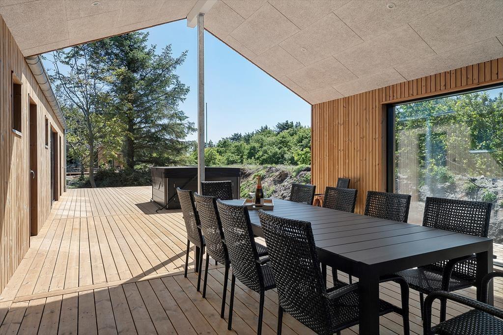 Sommerhuset ligger blandt træer, der skaber en privat og fredfyldt ramme om udelivet. Den store terrasse, der bygges som en del af huset, bliver et oplagt sted at nyde solens stråler eller finde skygge på varme dage. Med grillfaciliteter og masser af plads bliver det let at skabe hyggelige stunder udendørs, hvor børn og hunde trygt kan lege.