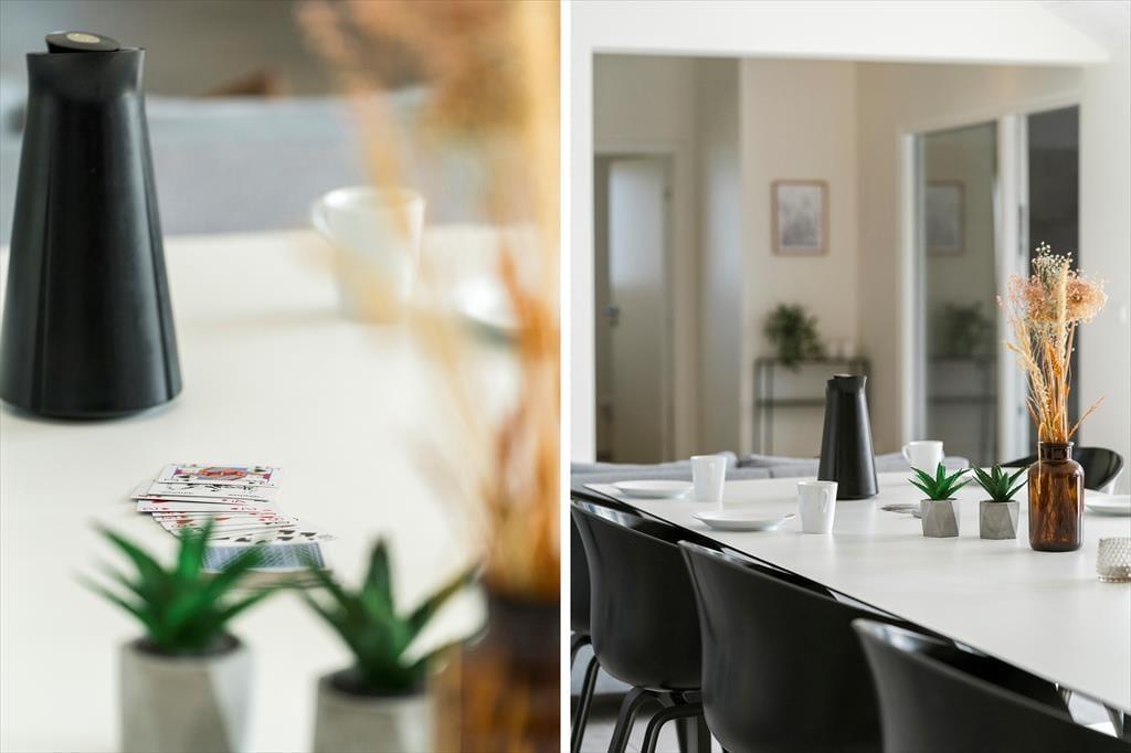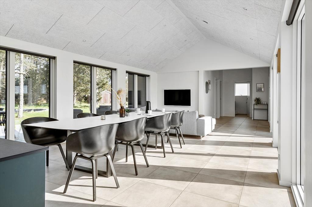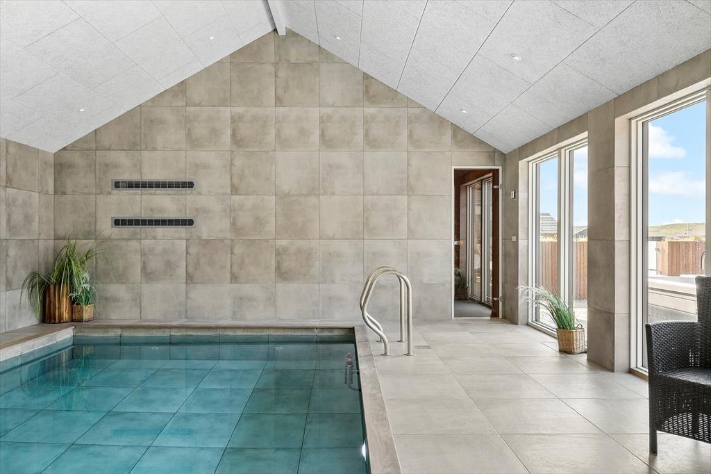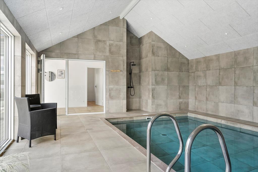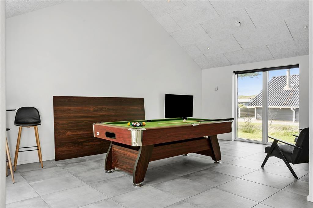 Allerede når du træder ind i sommerhuset, mærker du den afslappede stemning, der præger alle rum. Det store, åbne køkken-alrum udgør et naturligt samlingspunkt, hvor du nemt kan forestille dig at lave morgenmad i ro og mag, mens sollyset strømmer ind gennem vinduerne. Herfra er der åben forbindelse til stuen, så alle kan være sammen – også selvom nogle slapper af i sofaen, mens andre dækker op til fælles måltider. Når I er klar på lidt konkurrence og grin, kan I gå videre ind i aktivitetsrummet, hvor billardbordet lægger op til timevis af hygge og sjove udfordringer. Når dagens energi skal bruges op, venter husets indendørs pool, hvor både børn og voksne kan boltre sig i det varme vand. Det er sådan et sted, hvor selv en regnvejrsdag føles som ferie.
