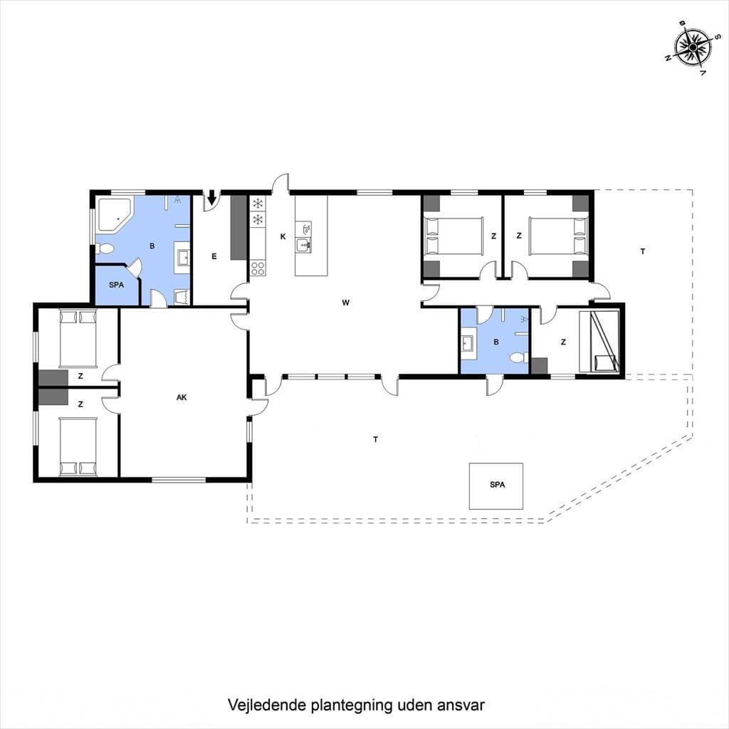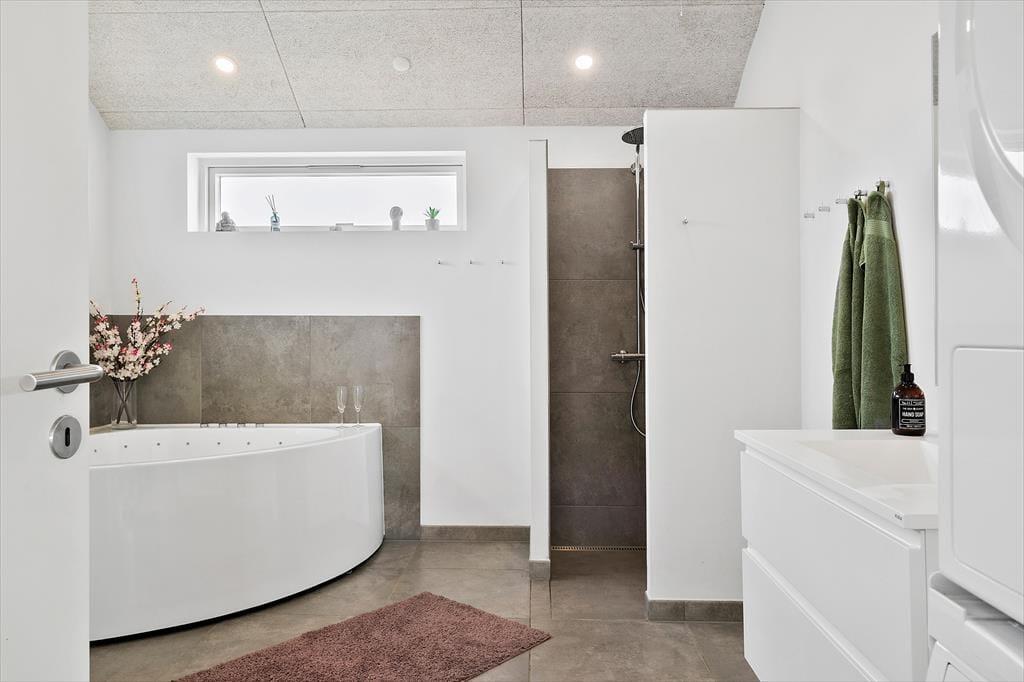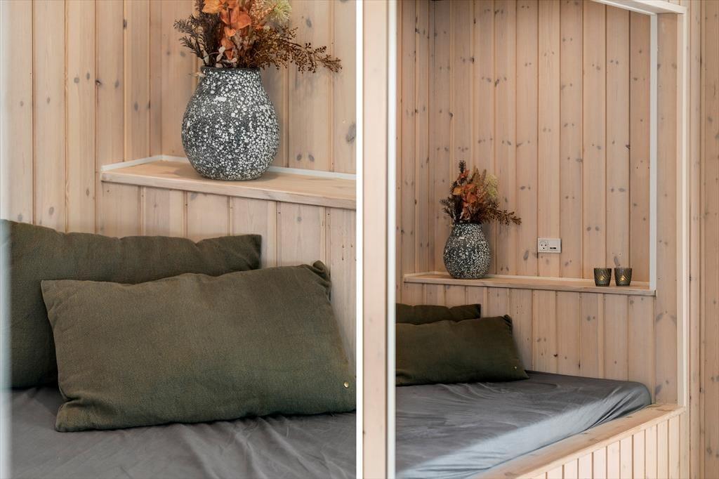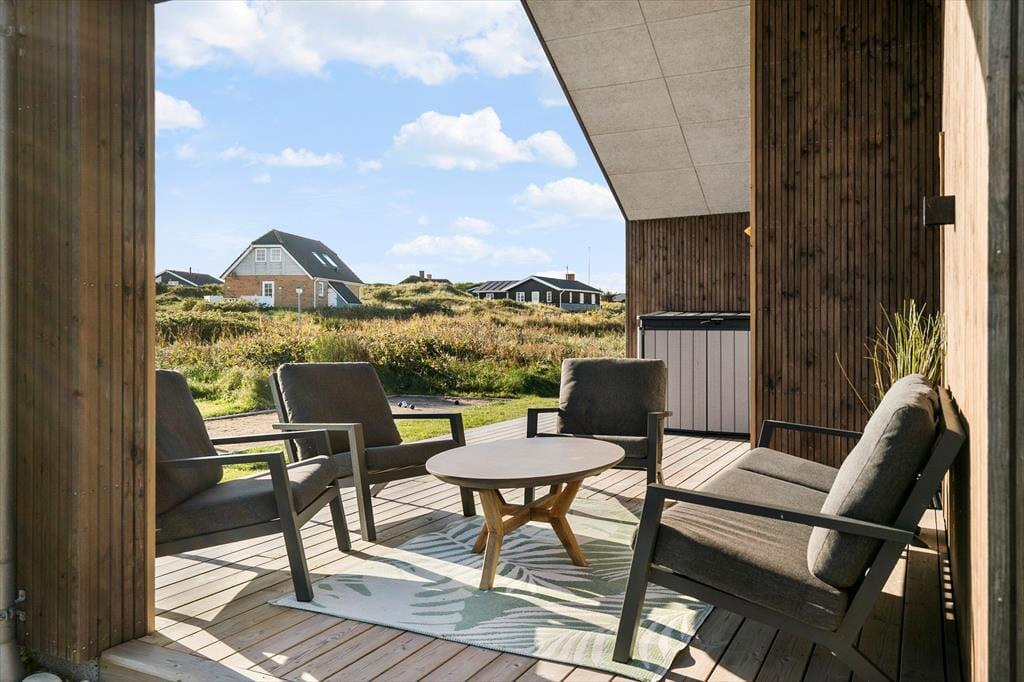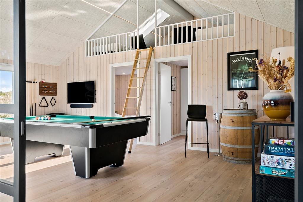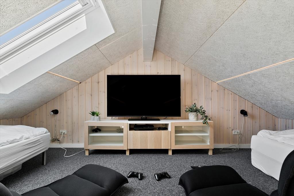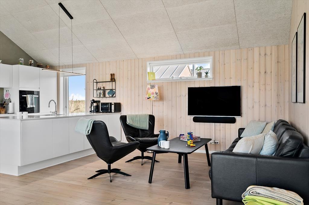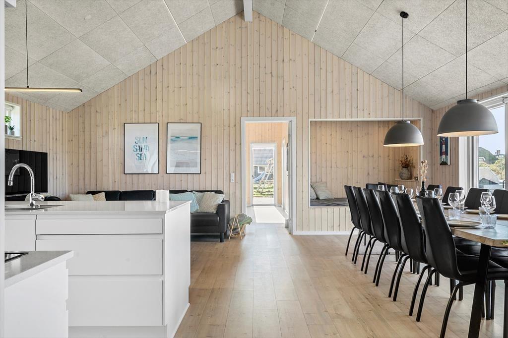 Når du træder ind i sommerhuset, bliver du mødt af et lyst og rummeligt køkken/alrum, der danner det naturlige samlingspunkt for ferieoplevelserne. Det åbne rum indbyder til fælles madlavning, lange måltider og hyggelige aftener med spil og snak. Sommerhuset har en moderne indretning, men uden at gå på kompromis med den afslappede stemning, man forventer af et feriehus ved vestkysten. En hems giver ekstra opholdsplads, som børnene vil elske at indtage som deres eget lille fristed. Når dagens aktiviteter har sat deres spor i kroppen, kan du forkæle dig selv med en tur i den indendørs spa eller en afslappende stund i saunaen – og mærke hvordan ferieroen for alvor sætter ind.