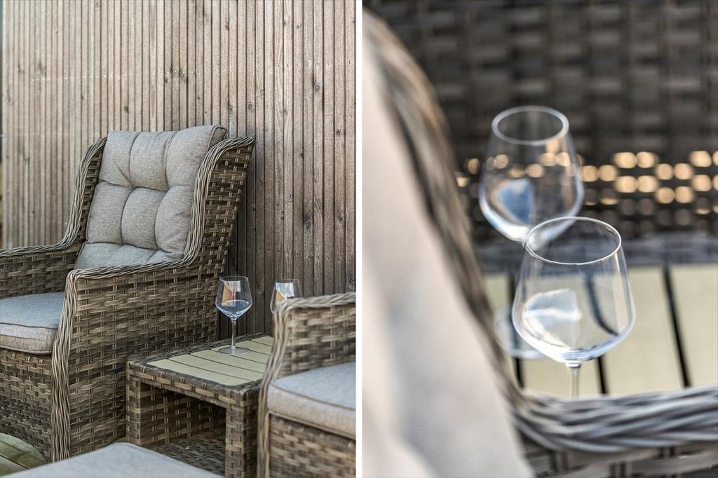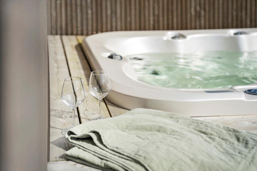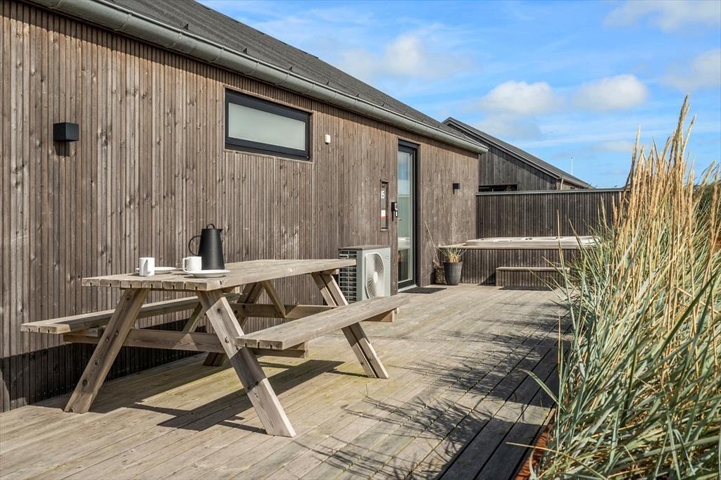 Når solen skinner, trækker livet naturligt udenfor – og her leverer sommerhuset i den grad. Den udendørs spa er det oplagte sted at begynde eller afslutte dagen, mens du nyder den friske vestjyske luft og måske udsigten til stjernehimlen om aftenen. Haven er indrettet med legestativ, gynger og rutsjebane, så børnene har masser at tage sig til, mens de voksne nyder en stille stund på terrassen med en god kop kaffe. Der er tænkt på alt – også familiens firbenede medlem, for her er det selvfølgelig tilladt at medbringe hund. Udelivet her emmer af frihed og ro, hvor ferien får lov at folde sig ud i sit eget tempo.