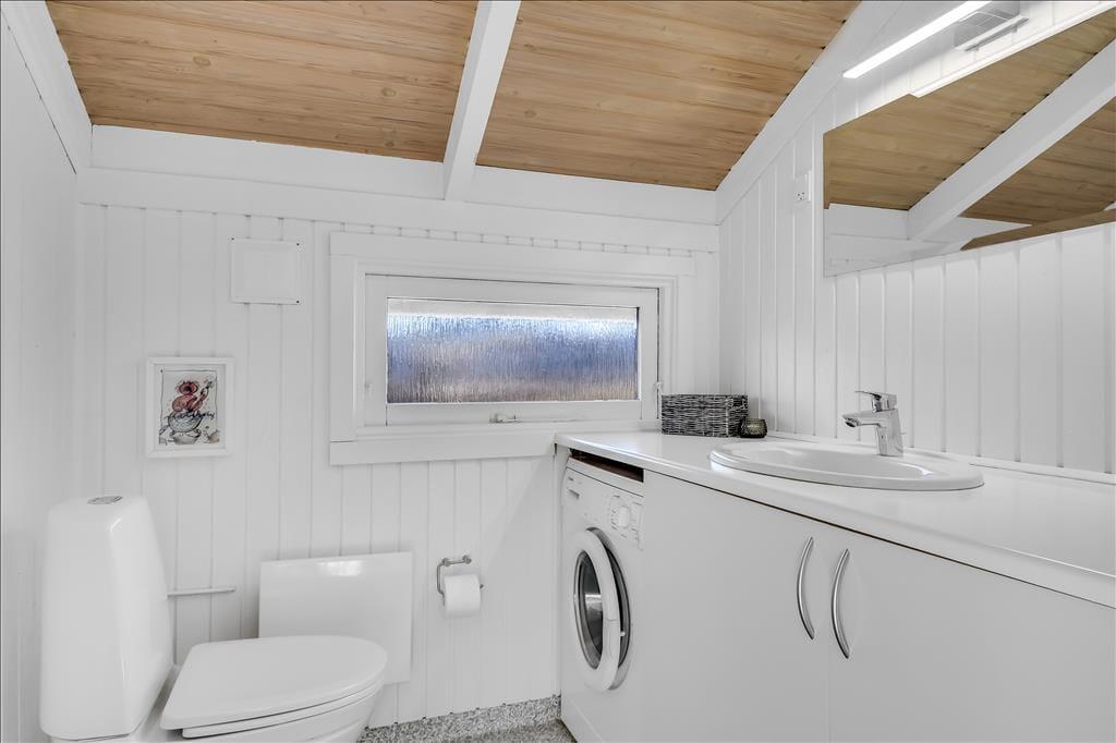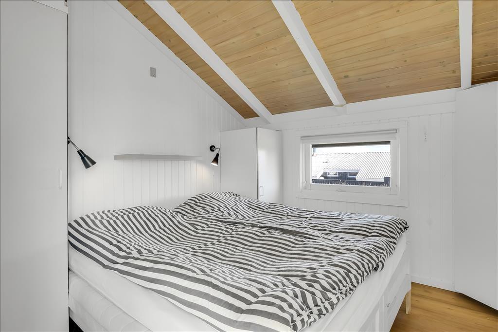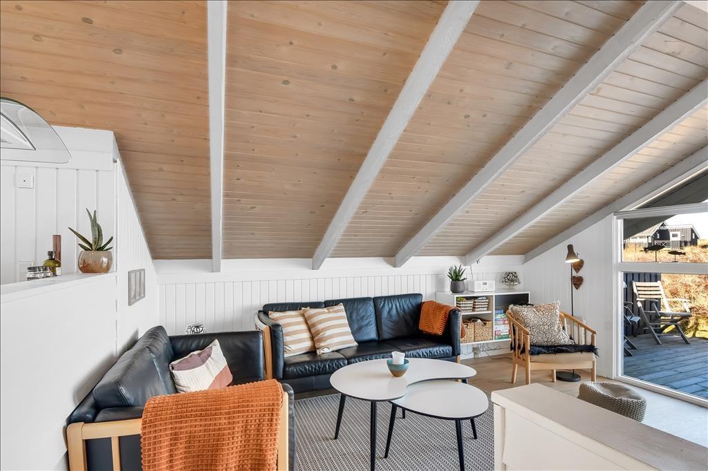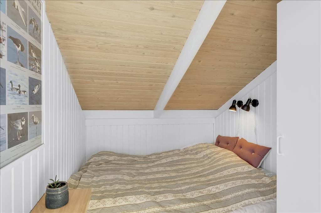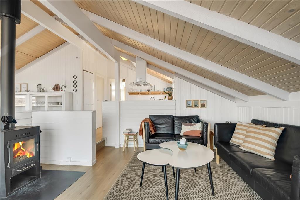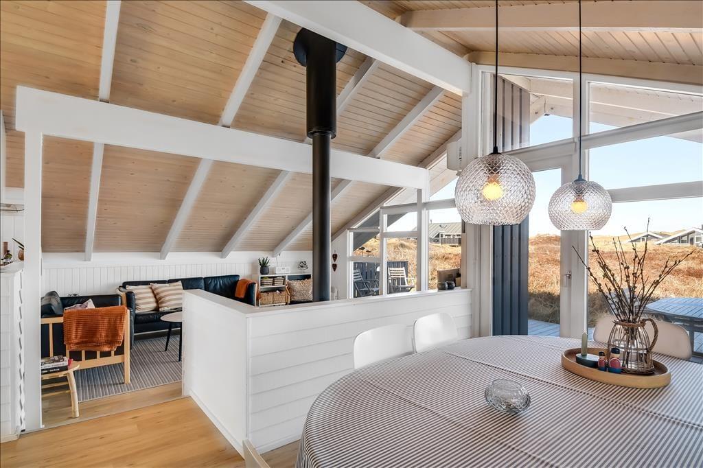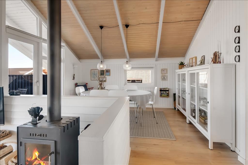 Indretningen er enkel og hjemlig, med fokus på at skabe en afslappende base for både par og familier. Store vinduespartier trækker dagslyset helt ind i det åbne opholdsrum, hvor køkken og stue ligger i naturlig forlængelse af hinanden. Her er god plads til at samles om måltiderne, finde ro med en god bog eller lade samtalerne flyde frit hen over spisebordet. Stilen er klassisk sommerhus – med varme træoverflader og lyse nuancer, der understreger nærheden til naturen udenfor. Her er der plads til at lade skuldrene sænke sig og finde ind i feriens rolige rytme.