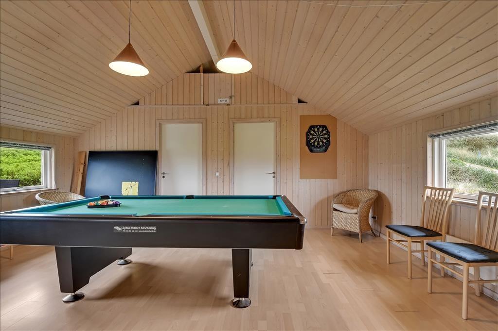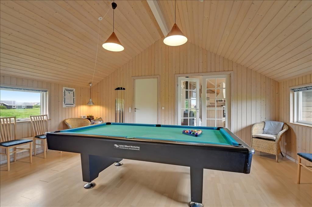 Sommerhuset byder på en varm og indbydende atmosfære, hvor der er tænkt over både hyggen og funktionaliteten. Den lyse stue er et naturligt samlingspunkt med brændeovnen som hyggeligt midtpunkt, og fra sofagruppen kan du både nyde synet af flammerne og udsigten til klitterne udenfor. Køkkenet ligger i åben forbindelse med stuen, så samtaler og samvær kan flyde frit, mens der kokkereres eller dækkes op til fælles måltider. Når du trænger til forkælelse, kan du trække dig tilbage i husets spa og lade kroppen synke ned i det varme vand – måske efterfulgt af en tur i saunaen, der fuldender wellness-oplevelsen. I aktivitetsrummet kan I dyste i bordtennis, spille pool og dart eller bare hænge ud sammen, når vejret kalder på indendørs sysler. Der er kort sagt plads til både ro og livlige stunder under samme tag.