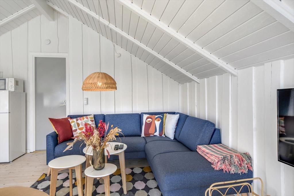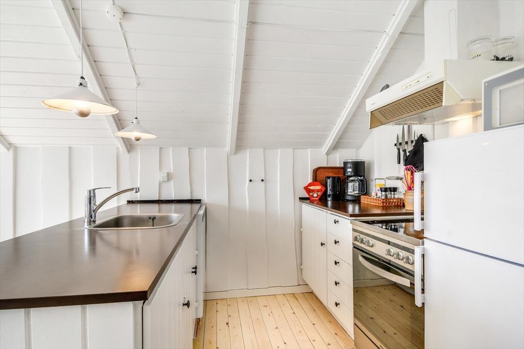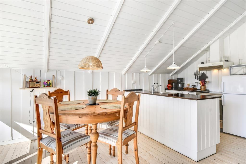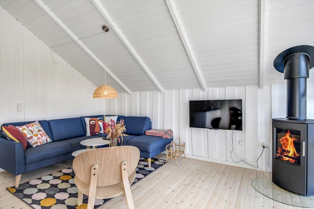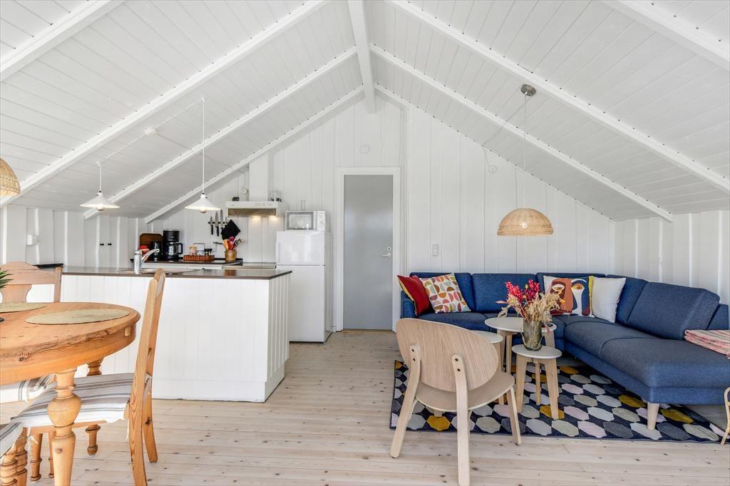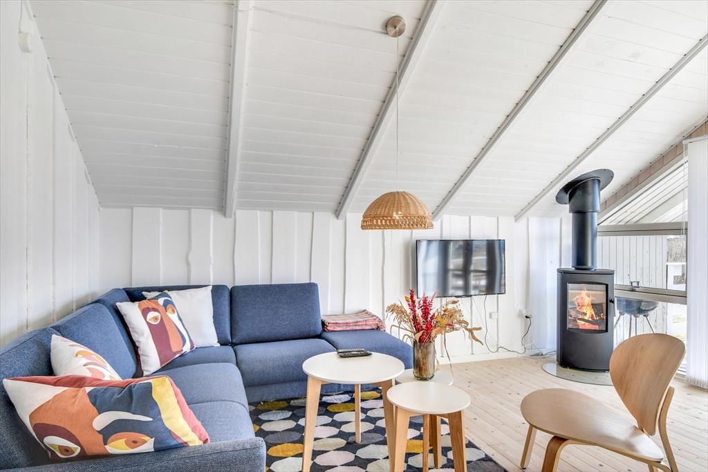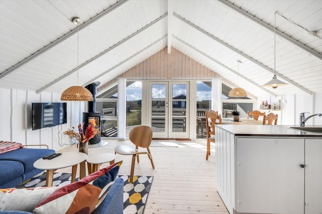 Sommerhuset har en enkel og hjemlig indretning, der straks får skuldrene til at sænke sig. Med loft til kip og masser af naturligt lys får du en skøn fornemmelse af luft og rum, og den åbne planløsning gør det nemt at være sammen, uanset om du laver mad, læser en bog eller nyder en rolig stund foran brændeovnen. Stilen er klassisk og hyggelig – med varme træoverflader og et afslappet udtryk, der passer perfekt til ferie ved vestkysten. Det er et sommerhus, hvor du hurtigt vil føle dig hjemme og finde ro til at lade op.