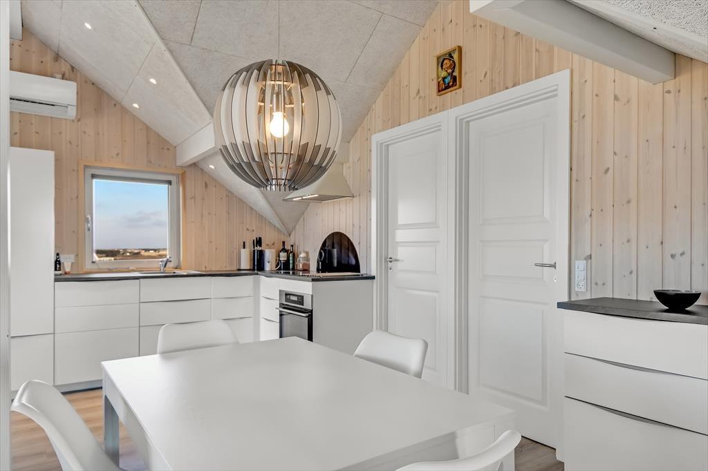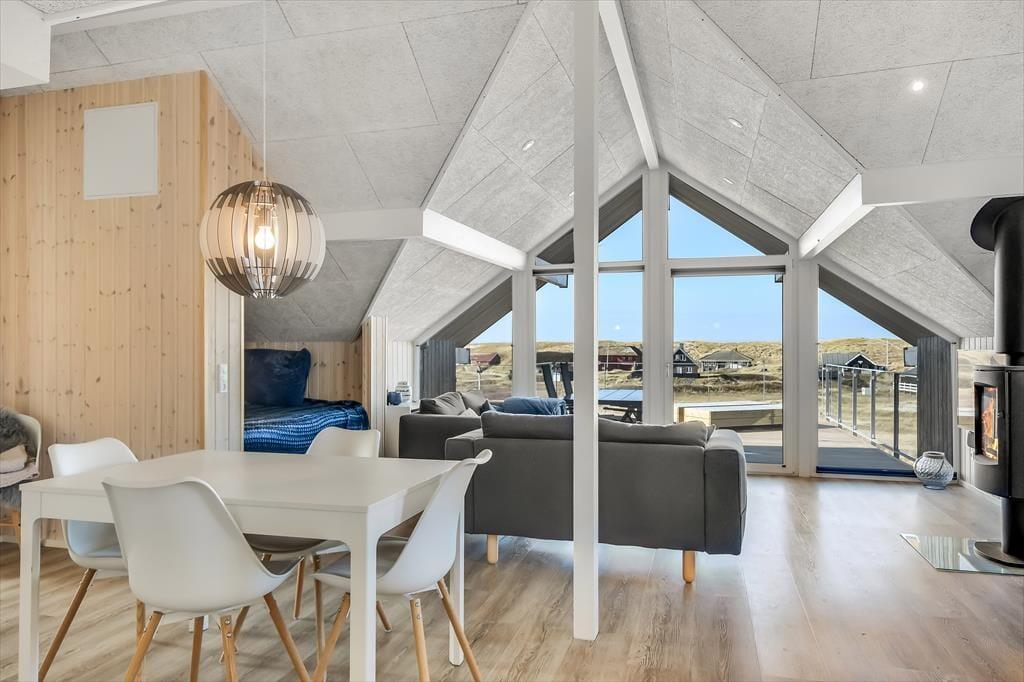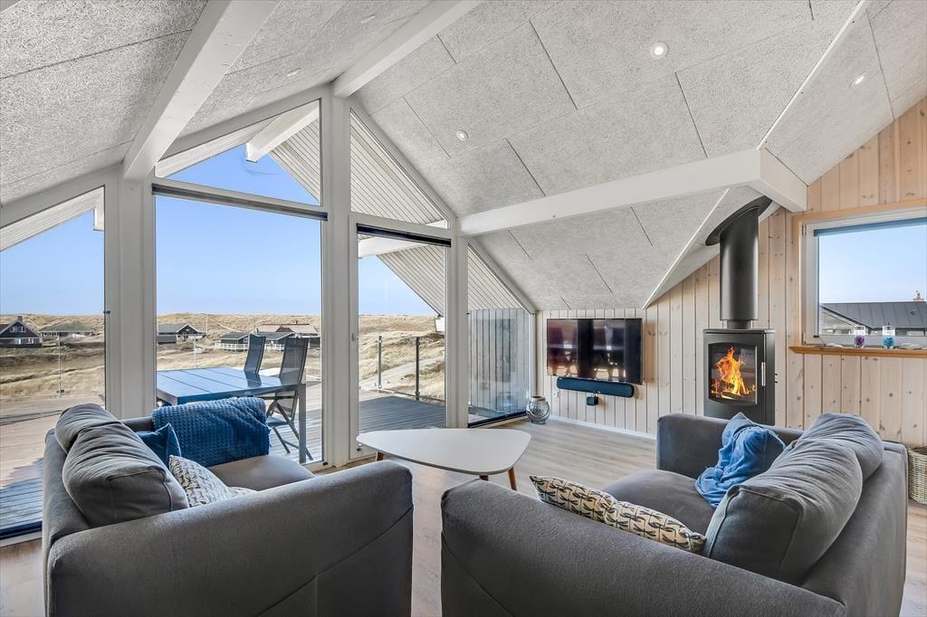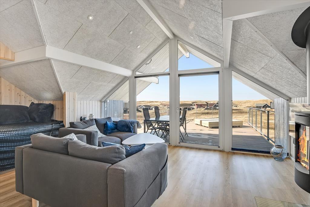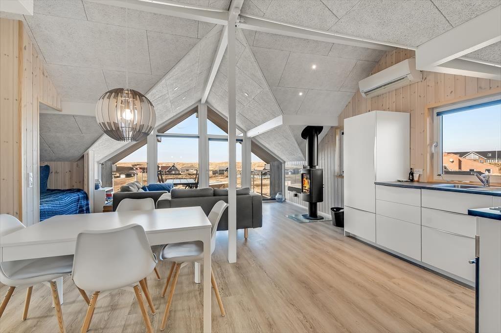 Indenfor mødes du af en lys og luftig atmosfære, hvor store vinduespartier lukker naturen ind og skaber en helt særlig følelse af nærvær med omgivelserne. Den moderne indretning kombinerer æstetik og funktionalitet, så du både kan slappe af og være social i det åbne opholdsrum. Her er loft til kip, så du får en fornemmelse af højde og rummelighed, mens det naturlige lys danser over rummets lyse overflader. Om aftenen kan du tænde op i brændeovnen og mærke varmen brede sig – perfekt efter en lang dag med frisk luft og vestjysk vind i håret. Det er et sommerhus, der inviterer til både ro og fællesskab, og hvor du hurtigt vil føle dig hjemme.