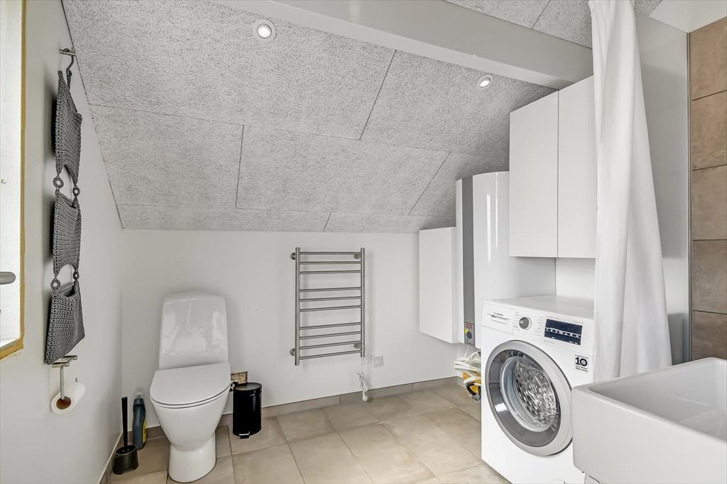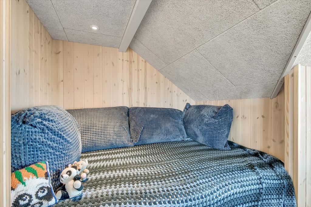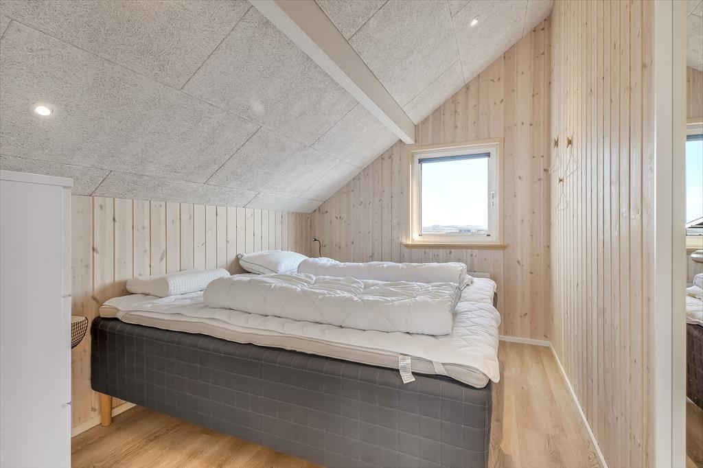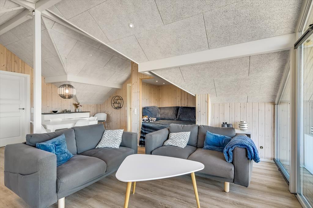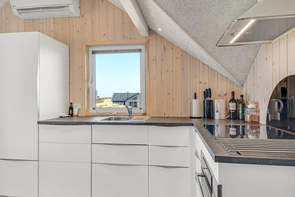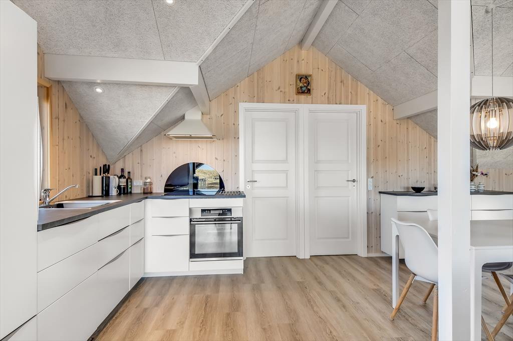 Indenfor mødes du af en lys og luftig atmosfære, hvor store vinduespartier lukker naturen ind og skaber en helt særlig følelse af nærvær med omgivelserne. Den moderne indretning kombinerer æstetik og funktionalitet, så du både kan slappe af og være social i det åbne opholdsrum. Her er loft til kip, så du får en fornemmelse af højde og rummelighed, mens det naturlige lys danser over rummets lyse overflader. Om aftenen kan du tænde op i brændeovnen og mærke varmen brede sig – perfekt efter en lang dag med frisk luft og vestjysk vind i håret. Det er et sommerhus, der inviterer til både ro og fællesskab, og hvor du hurtigt vil føle dig hjemme.
