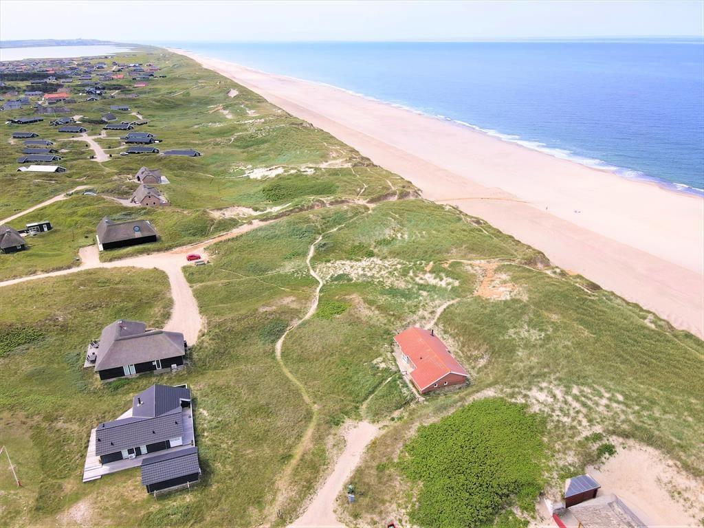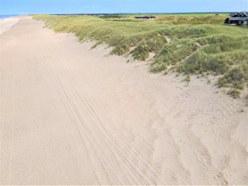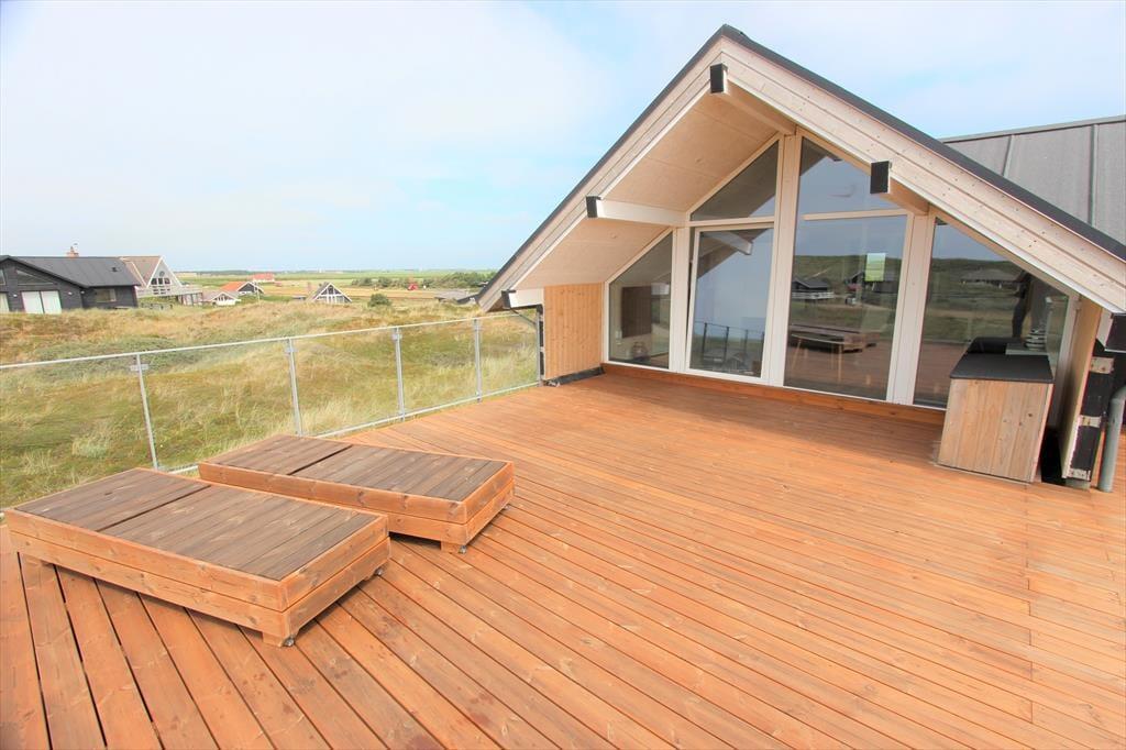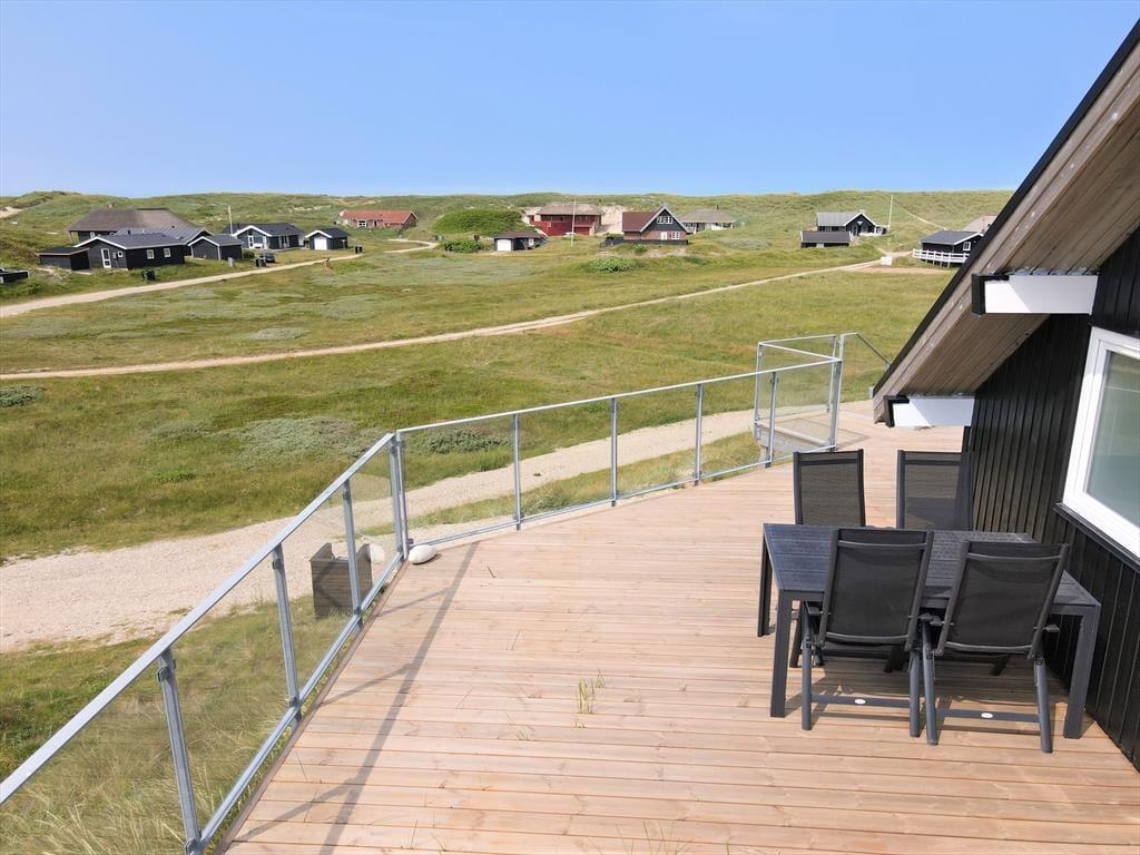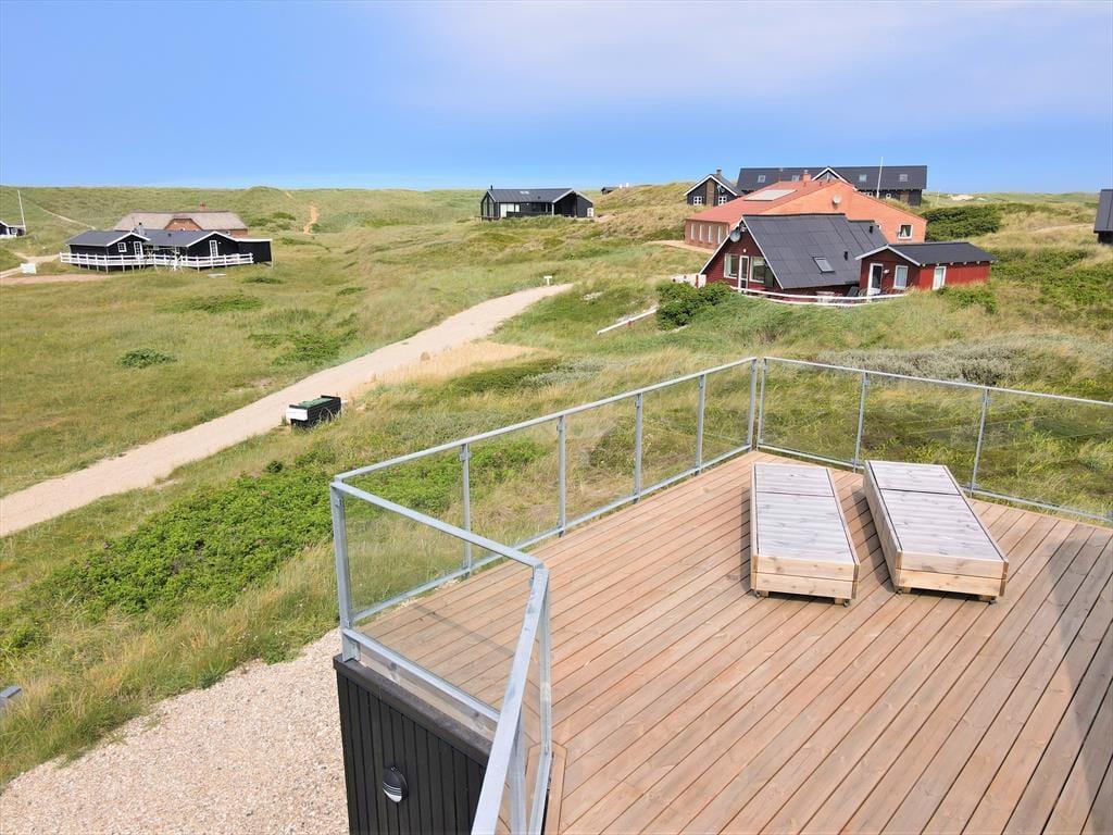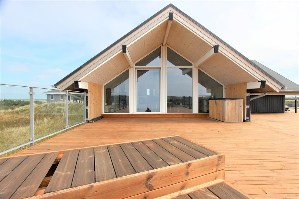 Det er dog udenfor, at sommerhuset for alvor folder sig ud. Den 100 m² store træterrasse strækker sig ud i landskabet og indbyder til både solbadning, måltider under åben himmel og afslapning med panoramisk udsigt over klitterne. Her er plads til at finde sin egen plet i solen – eller i læ – og lade blikket vandre ud over det fredelige landskab. Det føles næsten som at være alene i verden, når du sidder her og lytter til vinden i marehalmen og de fjerne bølger, der skyller ind over stranden. Og da det er tilladt at medbringe hund, kan hele familien – også den firbenede – være med til at nyde ferien i det fri.