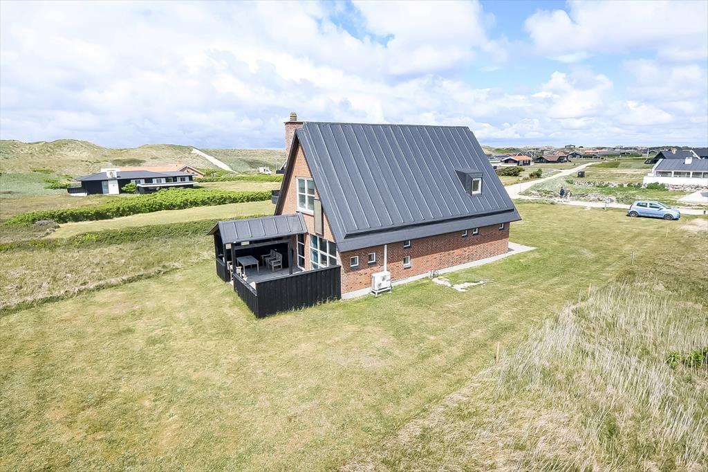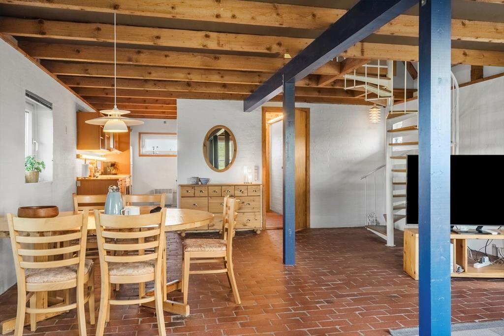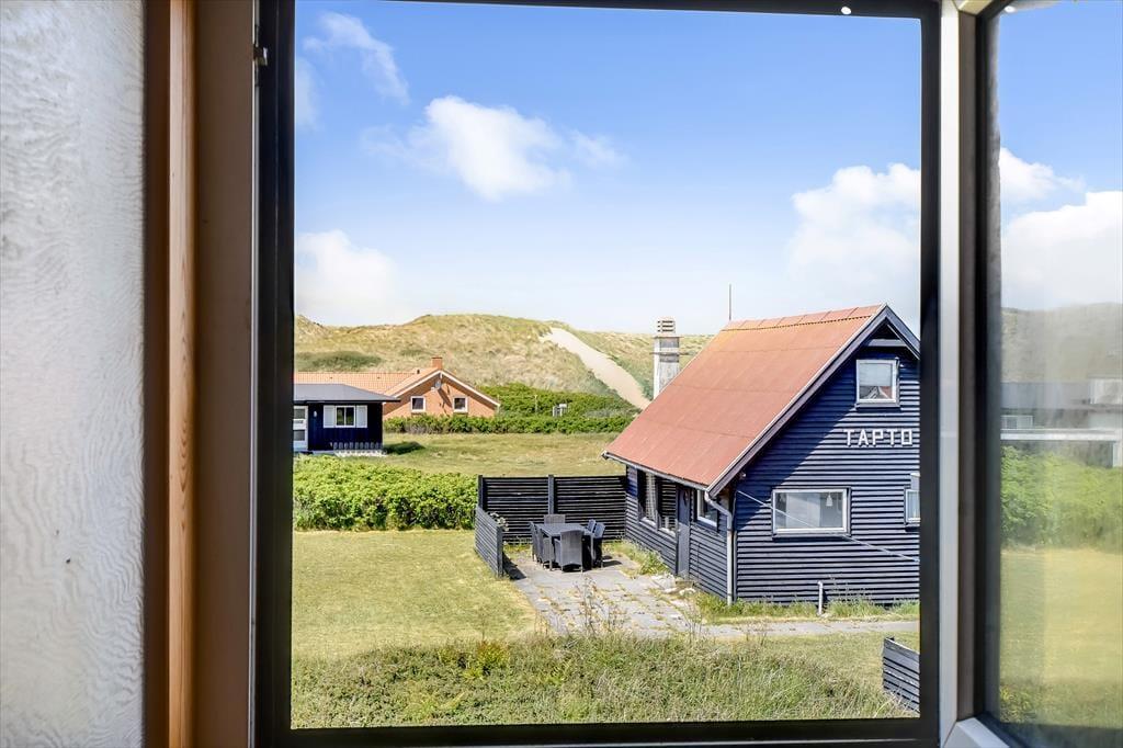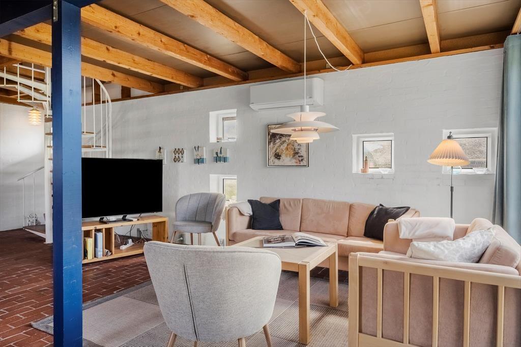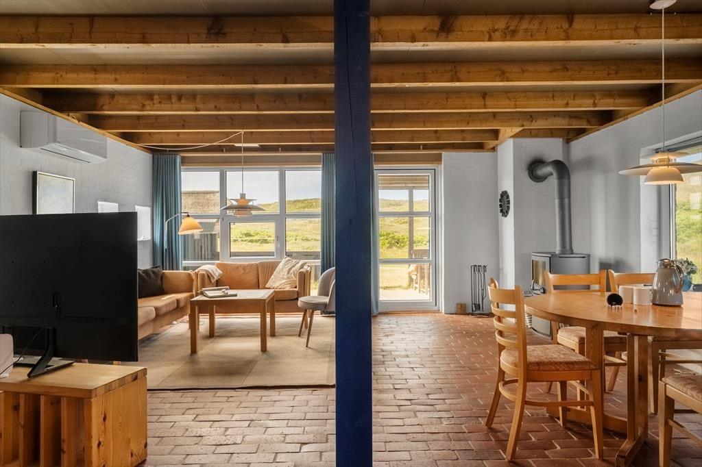 Sommerhuset er opført i mursten og strækker sig over 100 m² fordelt på to etager. Efter en renovering i 2022 fremstår det lyst og indbydende. I stueetagen finder du en hyggelig stue med store vinduer, der giver et smukt lysindfald og udsigt til klitlandskabet. Her kan du slappe af foran brændeovnen på kølige aftener eller nyde en film på TV'et med Chromecast. Køkkenet er åbent og veludstyret, hvilket gør det nemt at tilberede lækre feriemåltider. På første sal er der tre soveværelser, der tilbyder komfortable rammer for en god nats søvn efter en dag fuld af oplevelser.