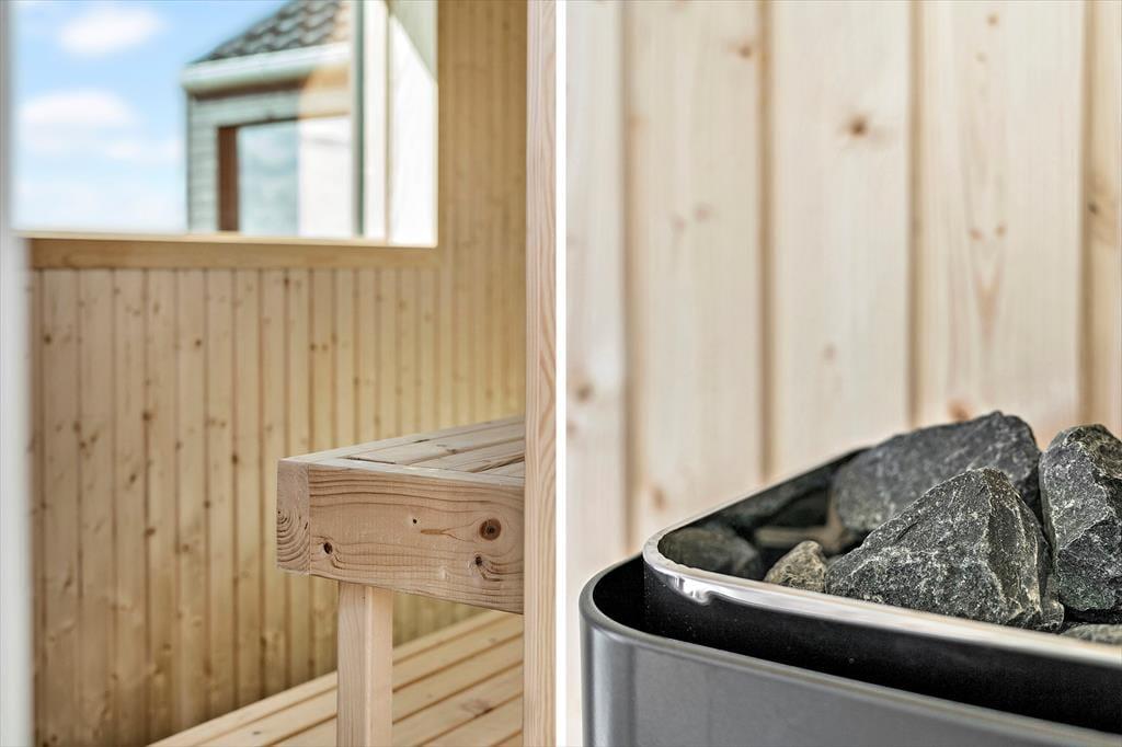Udendørslivet omkring sommerhuset er mindst lige så tiltalende som det, der venter indenfor. Den 100 m² store terrasse er inddelt i forskellige zoner, hvor du kan vælge sol eller skygge, alt efter humør og tidspunkt på dagen. Her kan du nyde morgenkaffen i ro og mag, læse en bog i loungemøblerne eller gøre klar til grillmiddag i det fri. Og så er der selvfølgelig wellness-delen: en skøn udendørs spa, en sauna og en udebruser, der tilsammen giver den ultimative ferieluksus under åben himmel. Imens kan hunden bevæge sig trygt rundt i de rolige omgivelser, og børnene kan lege udenfor, mens de voksne nyder freden.
