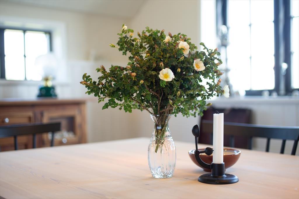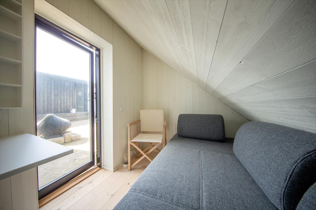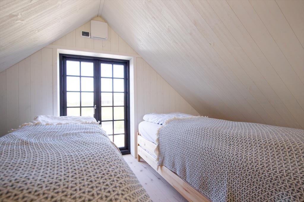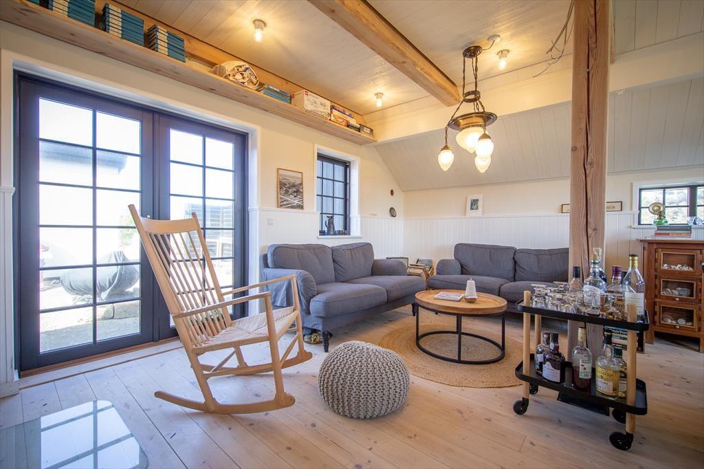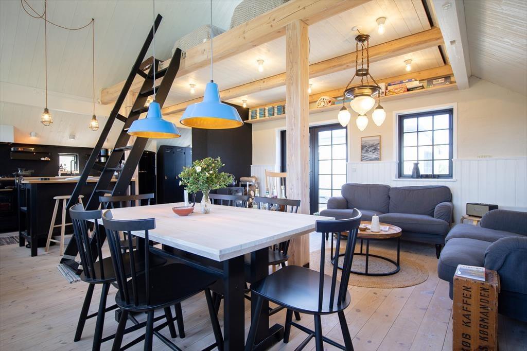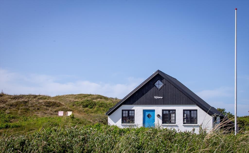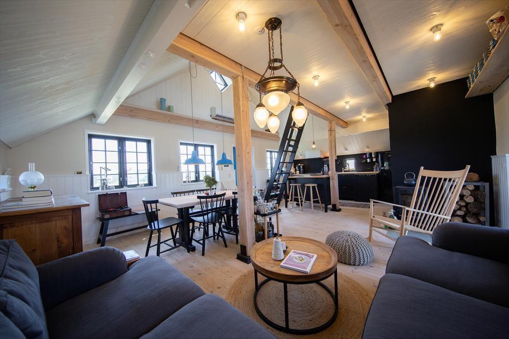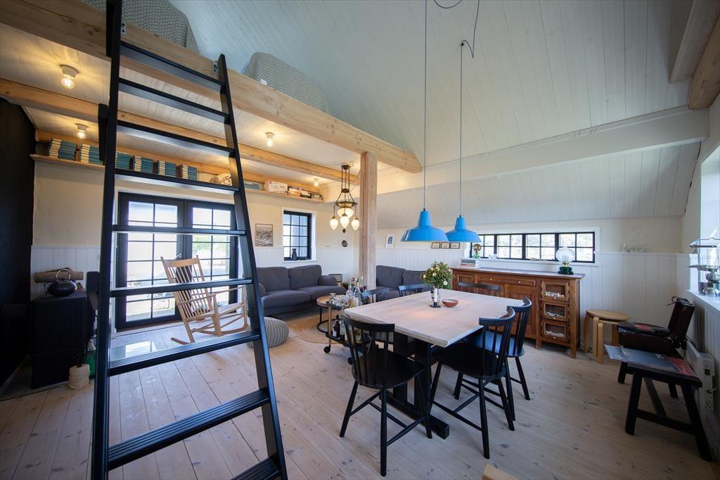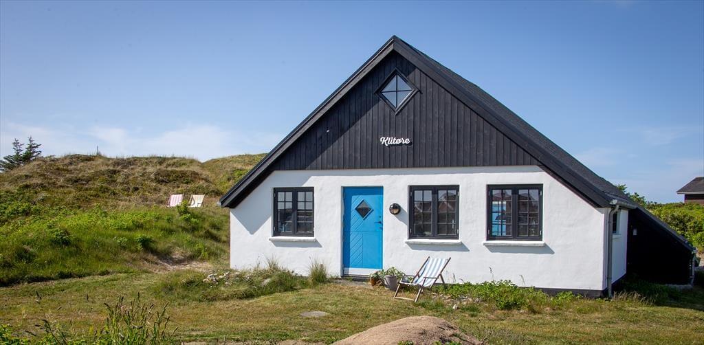 Når du træder ind i sommerhuset Klitøre, bliver du mødt af en unik atmosfære, hvor historie og hjemlig hygge går hånd i hånd. Hver detalje i indretningen vidner om kærlighed til stedet – her er det let at mærke, at mange har holdt ferie med smil og samvær gennem generationer. Den åbne stue og det velindrettede køkken indbyder til fælles madlavning og lange måltider omkring spisebordet. Hvis du vil trække dig lidt tilbage, kan du klatre op ad den stejle trappe til hemsen – en særlig krog, der inviterer til både ro, leg og udsigt over huset. Derudover rummer det tilhørende udehus både ekstra sovepladser og et badeværelse, hvilket giver god fleksibilitet, hvis I er flere, der holder ferie sammen.