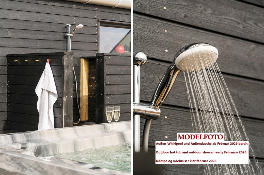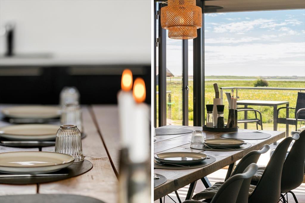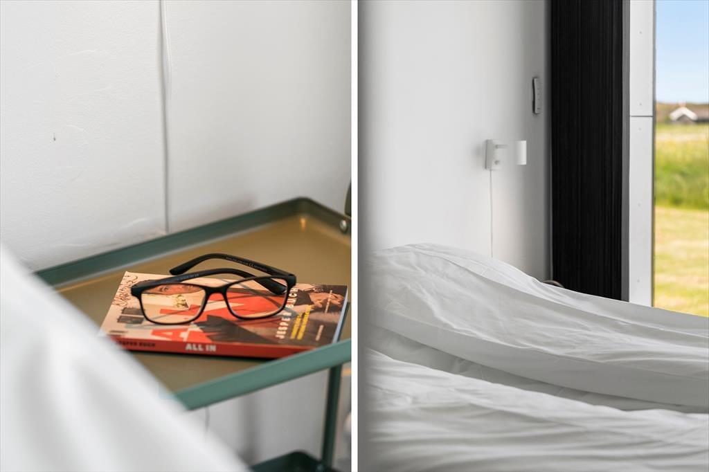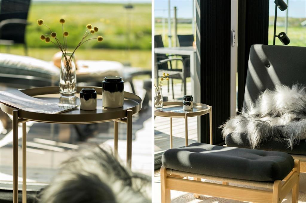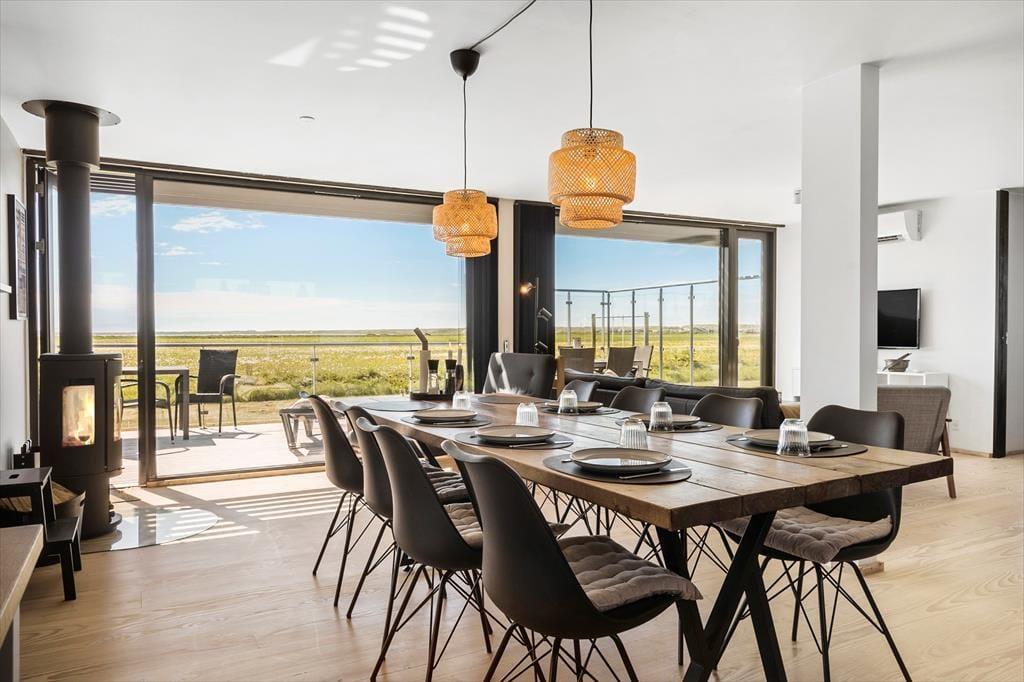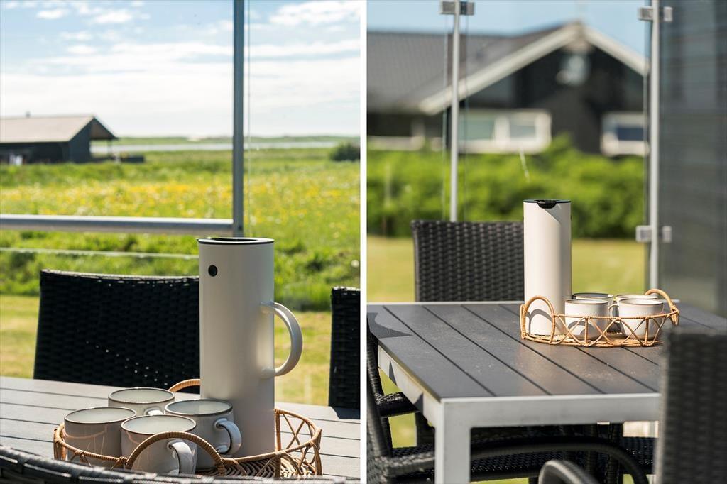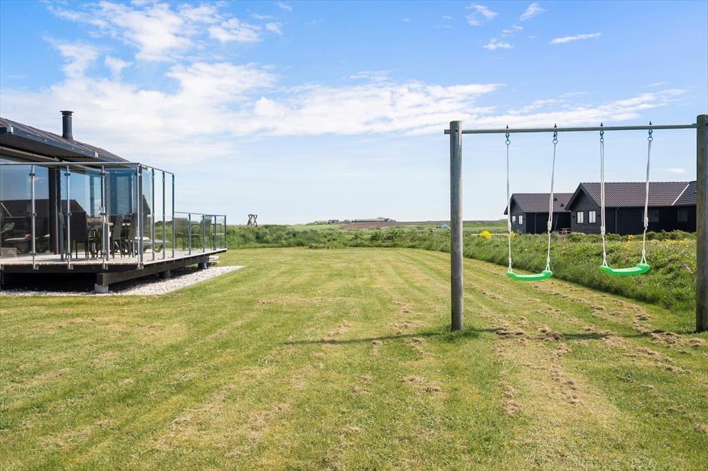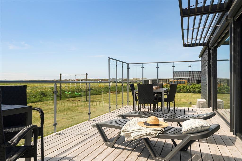 I forlængelse af stuen breder en sydvendt terrasse sig, og her er afskærmningen selvfølgelig lavet af glas, så du kan sidde godt i læ og samtidig have frit udsyn til Ferring Sø, de grønne enge og klitterne i det fjerne. Du finder for øvrigt endnu et terrasseområde på østsiden af huset, som du har direkte adgang til fra to af soveværelserne såvel som annekset: Her kan du passende nyde solen først på dagen, mens du drikker en kop kaffe og lytter til fuglenes første morgensang. Til børnene er der et gyngestativ, og græsplænen indbyder til leg og boldspil, hvis hele familien trænger til at få pulsen op og hygge sig sammen.