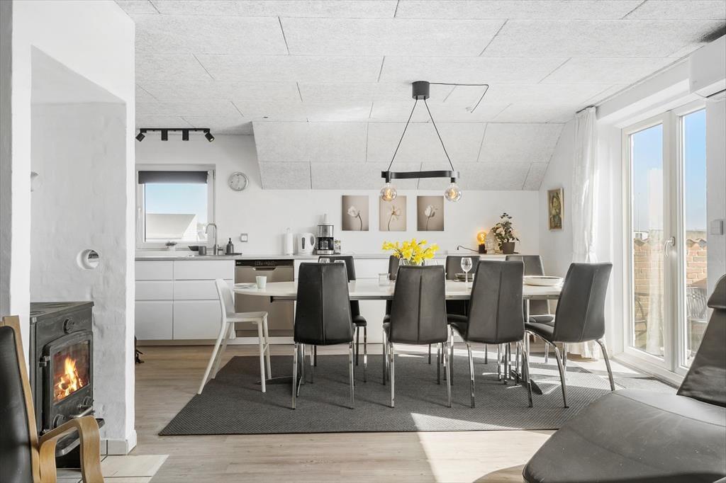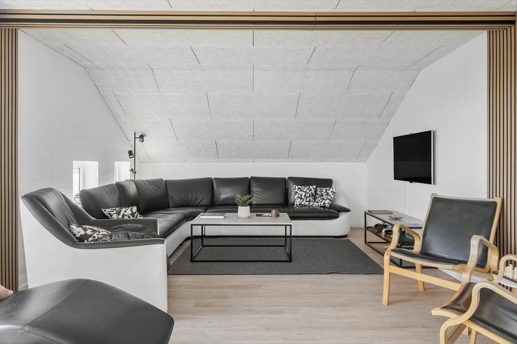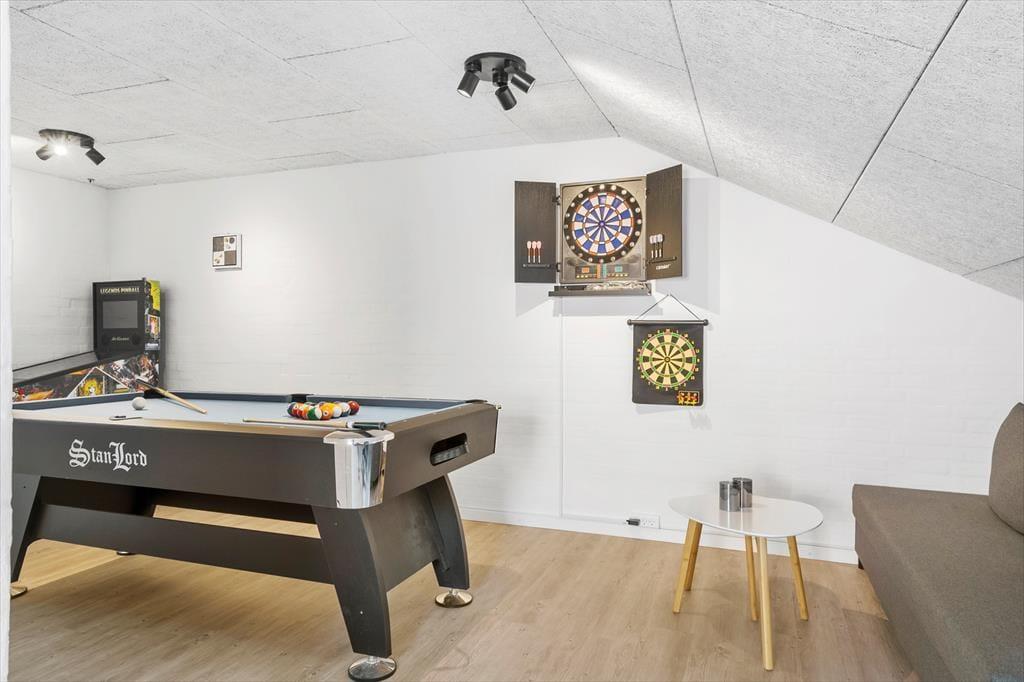 Her i huset er der sengepladser til otte personer, og rumfordelingen er gennemtænkt, så I sagtens kan være to familier, hvis det er ønsket. En entré og to badeværelser hører til de mere praktiske rum i huset – men der er også tænkt på at forsøde tilværelsen i form af en dejlig sauna. I opholdsafdelingen ligger køkken og stue i åben forbindelse, og lige ved siden af er aktivitetsrummet placeret. Her kan du dyste i pool og dart med de andre i selskabet, og du kan også prøve at slå rekorden på den klassiske flippermaskine. Selv husets hems fungerer som en god opholdsplads, for her er der nemlig en PS4-spillekonsol at hygge sig med.