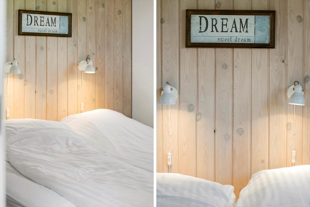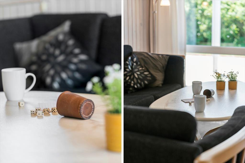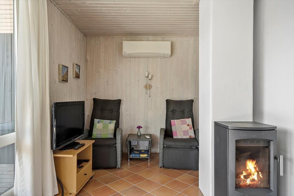 Sommerhuset har en velfungerende indretning til seks personer, og planløsningen passer godt til en familie – måske endda inklusiv bedsteforældre eller et par gode venner. Tre soveværelser ligger side om side, og på badeværelset er der både spabad og sauna, så du og dine kære kan fylde dagene med wellness og afslapning. Mens du får en velfortjent pause i varmen, er der måske andre i familien, der tager sig af madlavningen, og I kan også sagtens gøre det til et fælles hyggeprojekt at røre i gryderne og smage til. Det åbne opholdsrum er indrettet med spisebord og sofaafdeling, og i en niche nær brændeovnen er der indrettet en rigtig hyggekrog med lænestole og fladskærms-tv.