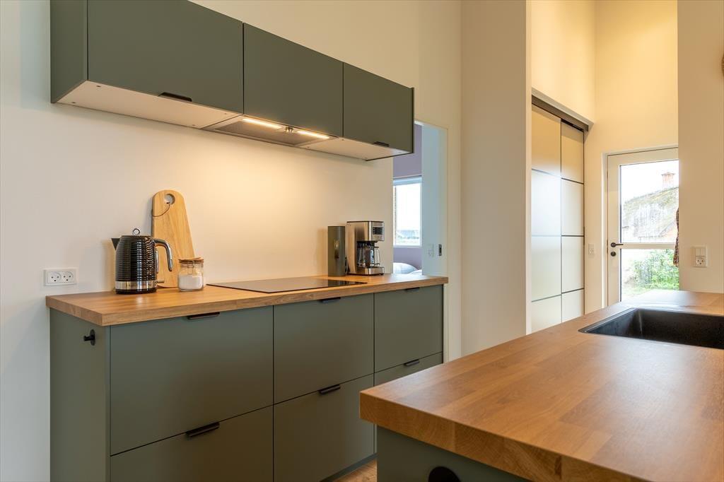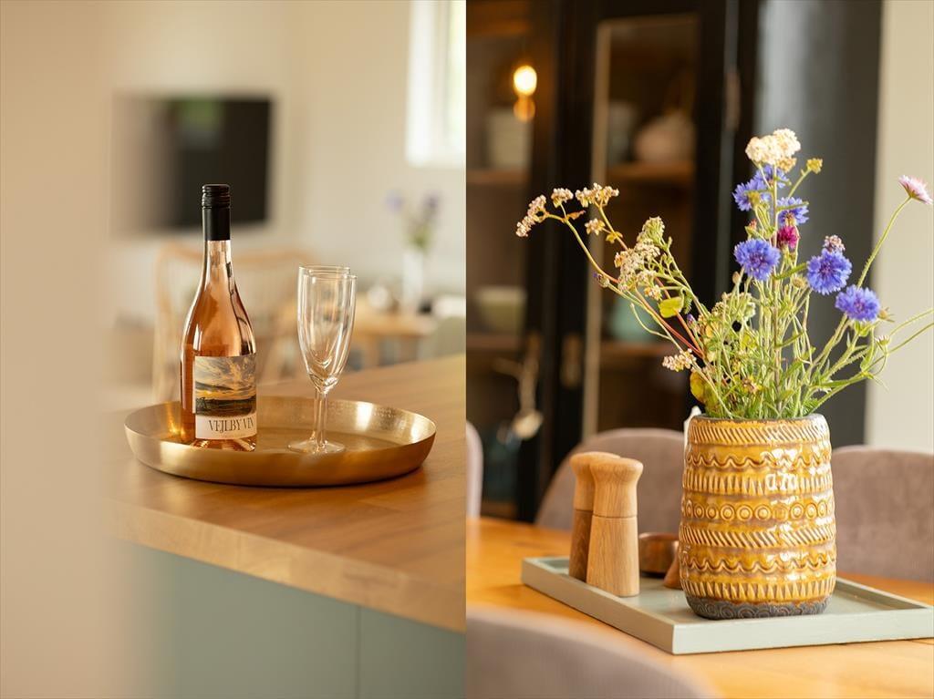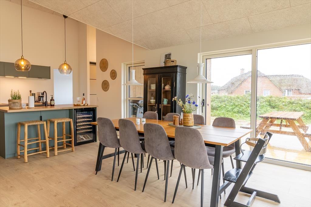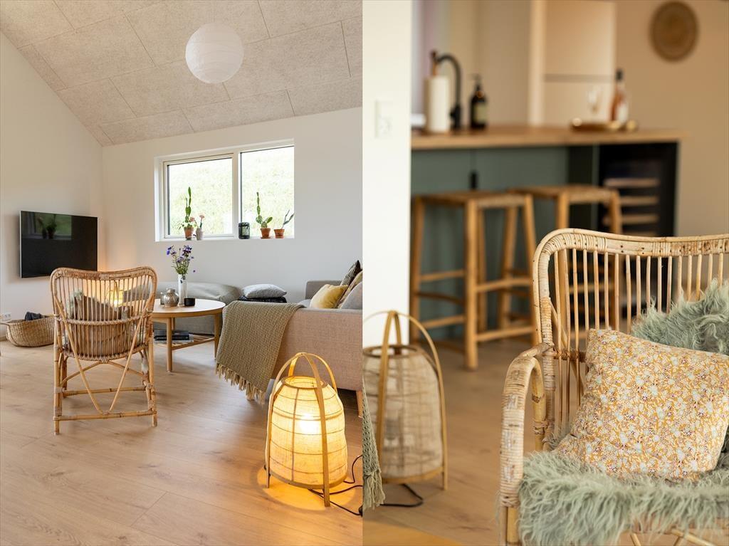 Sommerhuset er opført i 2024 i materialer af ordentlig kvalitet, og de lyse rum er indrettet med moderne og stilfuldt interiør. Et veludstyret køkken er integreret med stuen, og det er det oplagte sted at samles til madlavning, måltider og alskens hyggestunder. Brug timerne rundt om spisebordet på brætspil, quizzer og krydsogtværser, hvis det er det, I er i humør til – eller fordyb jer i gode bøger, strikkeprojekter og spændende film i sofaafdelingen. Trænger du til at slappe fuldstændigt af, kan du unde dig selv et varmt spabad på det ene af de to badeværelser. Soveværelser er der tre af, og det ene har to køjer over dobbeltsengen, så det kan fungere som et hyggeligt rum for en familie eller flere børn, der drømmer om at holde pyjamasparty sammen. Alt i alt passer planløsningen glimrende til otte personer.