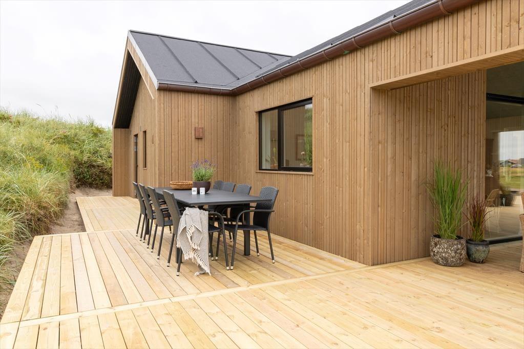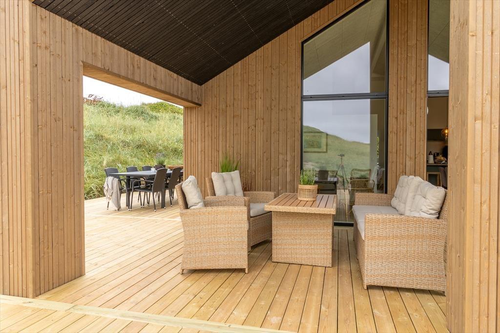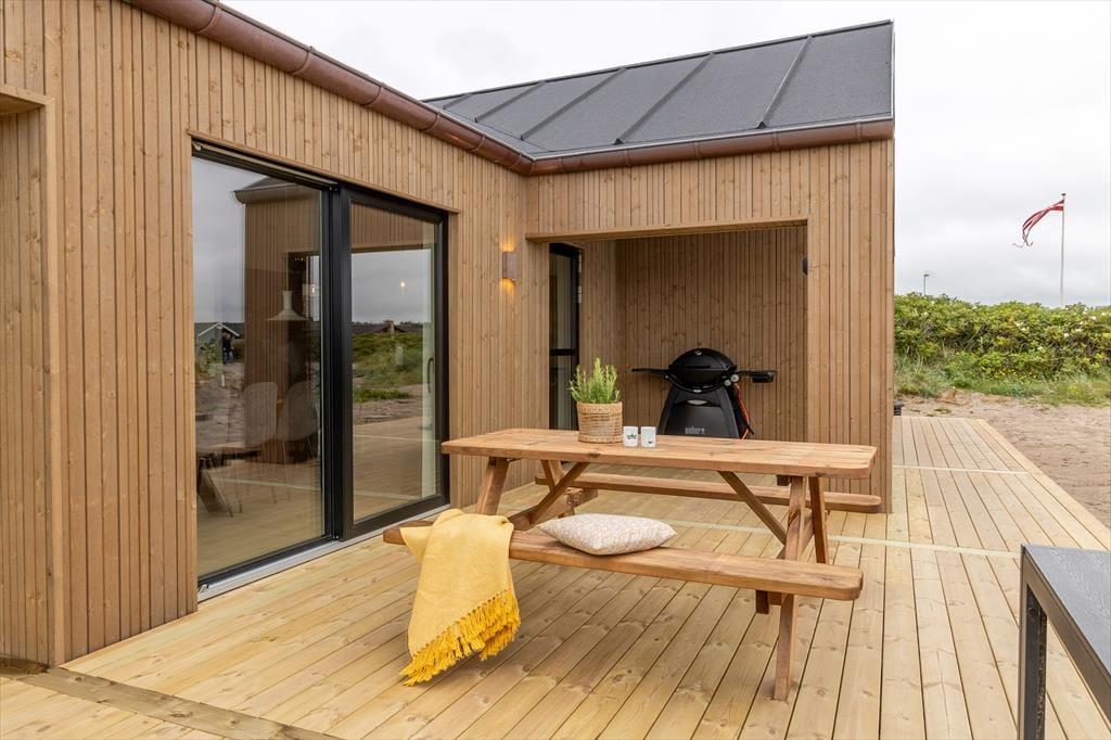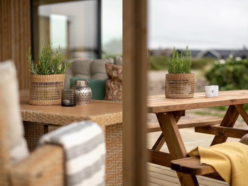 Naturgrunden er med sine 1040 m2 dejligt stor, og den breder sig lige op ad Vejlby Klits yderste klitrække – så du kan kigge lige ud på bølgende marehalm og lytte til bølgernes brusen, når du nyder det søde ferieliv på terrassen. Rundt om sommerhuset er der både overdækkede og åbne arealer at vælge imellem, når du skal finde en passende opholdsplads, og der er selvfølgelig komfortable havemøbler og liggestole til rådighed. Om aftenen kan du samle familien til grillhygge, og hvis I fortsat vil blive ude, når mørket falder på, og stjernerne tændes på himlen, er det måske tid til at få et varmt bad i udespaen.