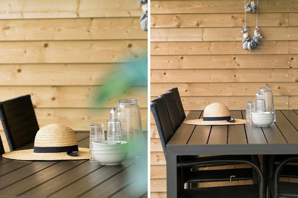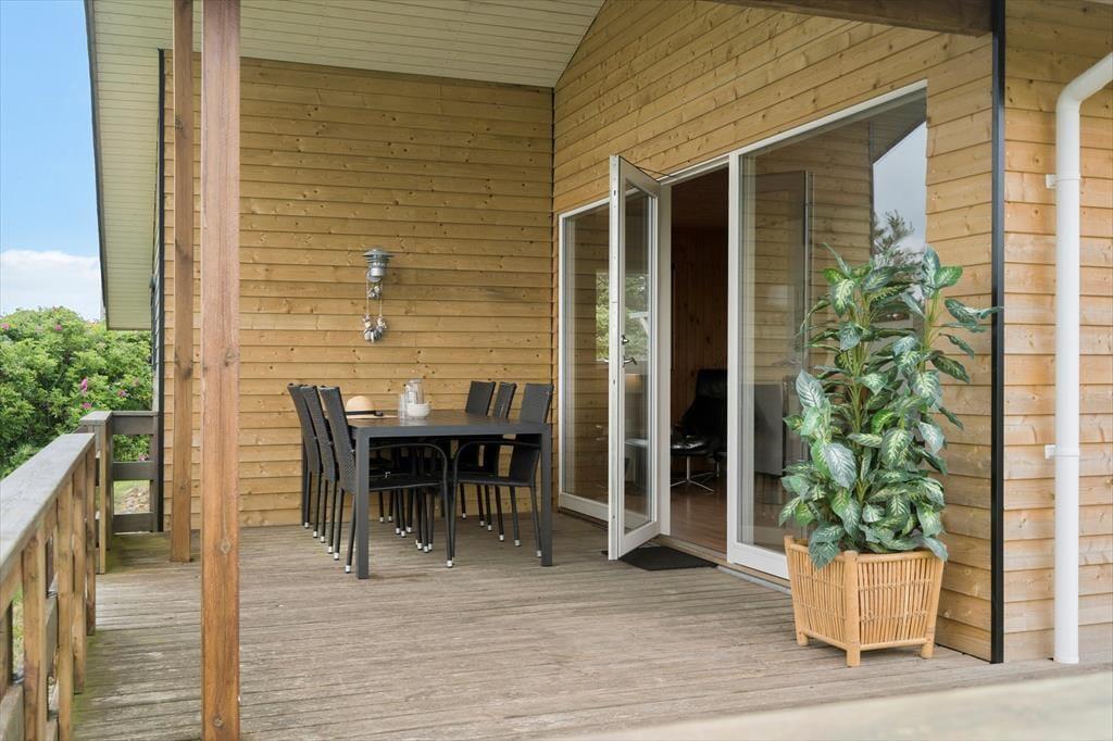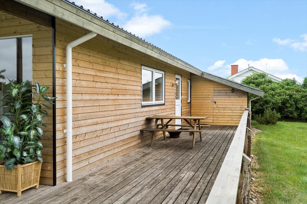 Ude kan du nyde det tindrende solskin, den tilbagelænede feriefred og havegrundens grønne bevoksning. De tætte hybenbuske dufter skønt, når blomsterne springer ud, og på græsplænen er der god plads til at lege fangeleg eller kaste med en bold, hvilket både børn og hunde formentlig vil sætte pris på. Sommerhusets træterrasse får sol fra både øst og syd, og der er også et overdækket areal, hvis du og dine kære slet ikke kan få nok af at sidde ude i den friske luft, selvom aftenduggen for længst er faldet.